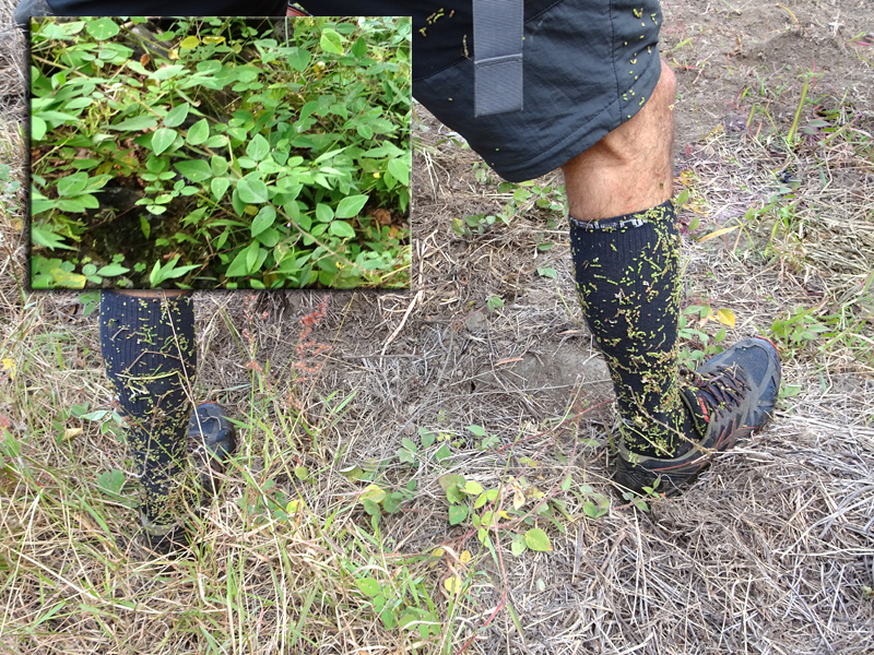 Deux espèces de colle-colle ont vite fait de gâcher une journée de randonnée. Autour des îlets du Bras de Saint-Paul, c'est Desmodium intertum qui a décidé de supplanter toutes les autres invasives et semble y être très bien parvenue. Non contente de coller ses très longues tiges aux habits, elle n'est pas avare en graines qui recouvrent en un instant tous les vêtements. Jeune, la gousse se colle immédiatement aux habits et sur les membres. Sèche, elle ressemble à du velcro et s'accroche en plus de coller. Elle s'avère difficile à ôter et nécessite l'utilisation d'une lame pour racler le tissu. Attention donc au choix de la tenue ce jour là ; plus la maille est synthétique et fine, moins le colle-colle résistera à lame. Ce sont les chaussettes qu'elle préfère !