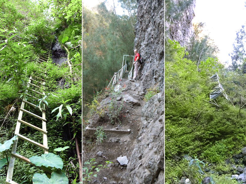 Cet itinéraire, lorsqu'il était en boucle était un vrai plaisir pour les randonneurs n'ayant pas le vertige. Une échelle de 47 barreaux, soit environ 18 mètres, courbée par le poids et poussée hors de son emplacement par une crue cyclonique, est désormais séparée du sentier par un dangereux éboulis. La passerelle au-dessus du torrent qui se rejoignait par une forte pente et sa longue corde, a fini dans le vide, obligeant l'ONF à créer un itinéraire bis passant par de nombreux gués du Bras de Saint-Paul.