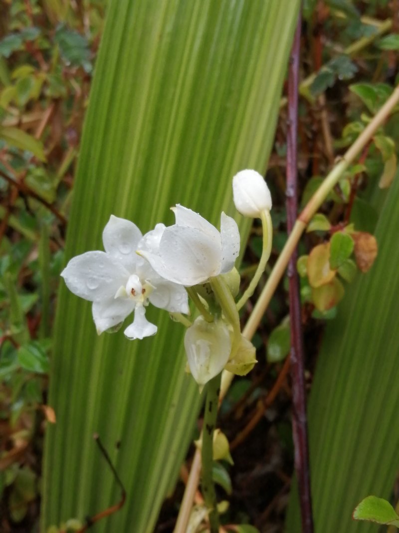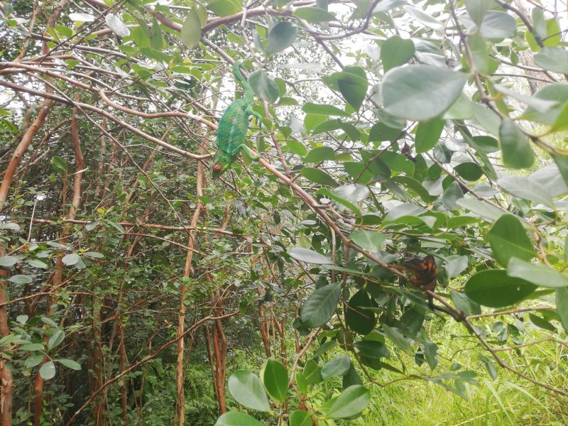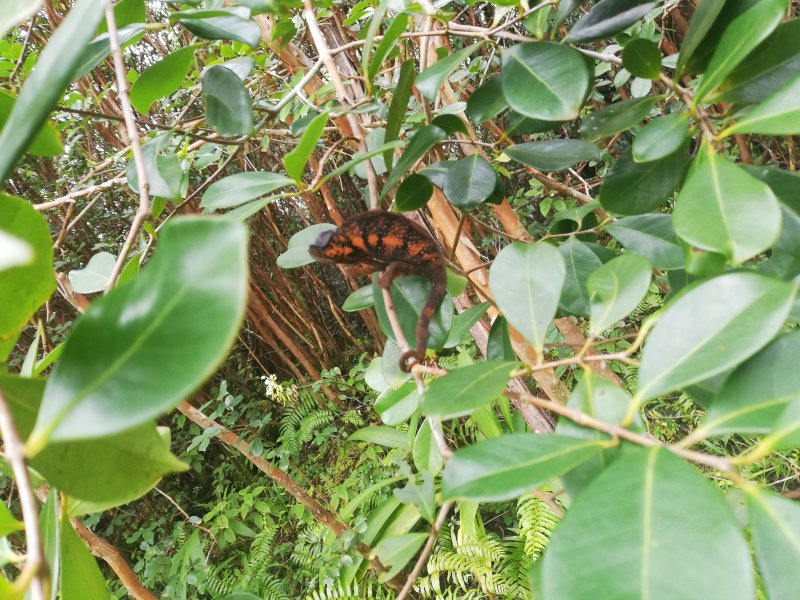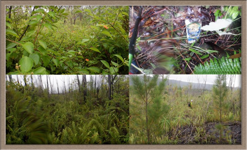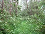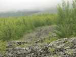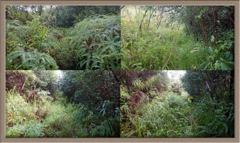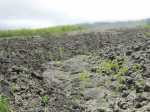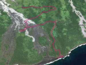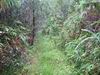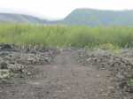 A la RN2, prendre à gauche et marcher en direction du Tremblet sur un kilomètre en traversant les coulées de 2004. On rencontre souvent des équipes casquées et harnachées qui se dirigent vers les nombreux tunnels de lave. Une occasion, au retour, pour se renseigner et prendre rendez-vous pour effectuer au moins une fois cette balade souterraine. Repérer à droite le début de la Route Forestière Géothermique fermée par une barrière. Entamer la montée, tout d'abord très facile car la piste est bien marquée et la végétation n'a pas encore commencé sa colonisation (Photo 9). Par moments, elle est totalement plate pour un cheminement facile (Photo 10). Sur le côté, on remarque la lente installation des bois de chapelet qui profitent de toute anfractuosité pour implanter leurs racines (Photo 11). Viendront ensuite les lichens et les fougères avant la mise en place naturelle des filaos. S'il est facile de marcher sur certaines coulées, d'autres, en revanche, sont beaucoup plus instables et dangereuses (Photo 12). On peut dénicher assez facilement, sans tenter des explorations risquées, de belles coulées plissées (Photo 13). La piste s'approche justement d'une zone de coulées plus anciennes où les filaos, déjà grands, ont poussé en bouchant l'horizon (Photo 15). On bénéficie, depuis la piste, de belles vues sur les Grandes Pentes et le Grand Brûlé si le brouillard na pas tout envahi (Photo 17). La piste file vers la droite, quitte les coulées et pénètre dans une végétation touffue comportant beaucoup de fougères (Photo 18). Au petit matin, la rosée a du mal à s'évaporer et mouille rapidement les chaussures. Cette piste, herbeuse et en pleine jungle est assez agréable et facile durant quelques centaines de mètres (Photo 19). On parvient, après un virage serré vers la gauche, à des zones couvertes d'orchidées bambous, qui dans certaines régions sont classées comme plantes invasives (Photo 20). Le spectacle est très agréable en période de floraison. Bien profiter du spectacle avant de décider de poursuivre. La carte IGN montre un trait noir qui se poursuit mais les fougères ont décidé de recouvrir cette trace (Photo 21). On peut encore marcher en se mouillant les jambes (Photo 22) mais il arrive un moment où la balade se transforme en aventure (Photo 23). Même si on devine parfois des traces de chasseurs de tangues, la randonnée peut prendre fin à l'emplacement des orchidées pour un retour par la piste puis la route jusqu'au parking.