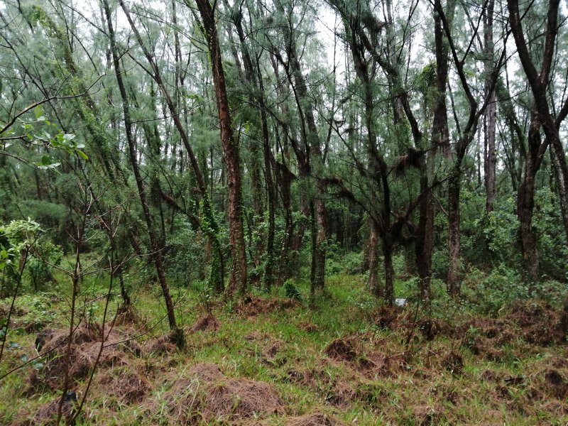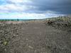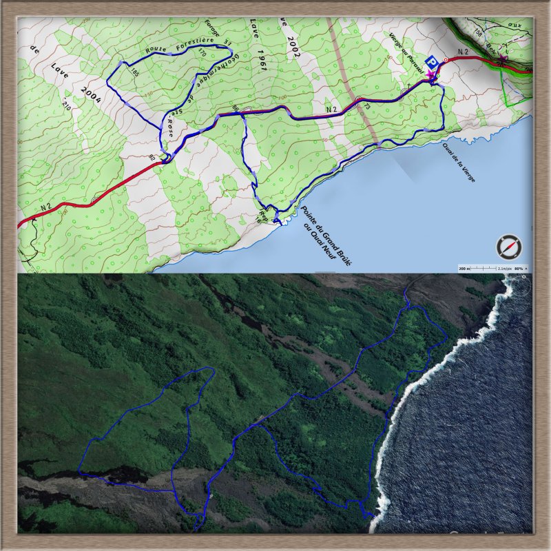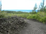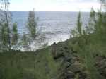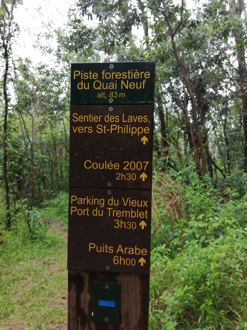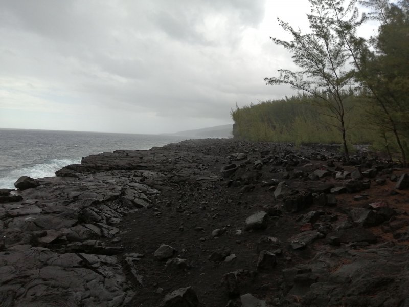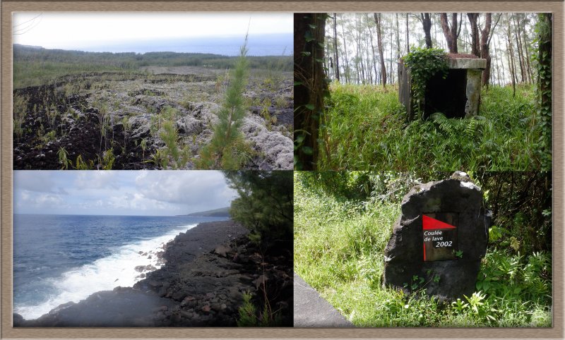 La randonnée débute au parking du Quai Neuf, facile à repérer après la coulée de 2004 en venant de Saint-Philippe. Après avoir partagé son casse croûte avec les chiens errants qui traînent là une grande partie de l'année, traverser la route et emprunter la piste qui descend vers la mer (Photo 1). Le cheminement sur l'herbe est agréable au milieu d'une végétation fournie. On rencontre une plantation de takamakas bord de mer ainsi que quelques autres essences (Photo 2). La descente est faible et la marche facile malgré les hautes herbes qui ont tendance à envahir la piste et ses abords (Photo 3). Les 200 derniers mètres sont agréables dans un belle verdure (Photo 4). Puis les filaos couvrent toute la surface jusqu'à la côte créant une balade ombragée (Photo 5). La côte, au nord, est rocheuse et difficile d'accès (Photo 7). Au sud, c'est l'inverse et l'on peut marcher sans danger sur près d'un kilomètre sur les plaques créées par les éruptions (Photo 8). S'il fait beau, on peut rester dans le coin autant qu'on veut avant de faire demi-tour par la même piste ombragée.