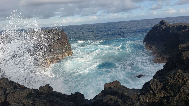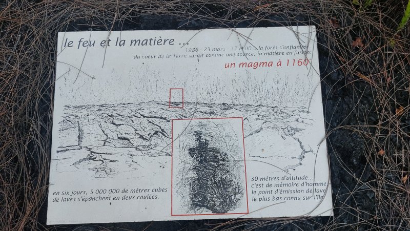 Cette courte sortie commence au Puits Arabe, un trou dans la roche sans grand intérêt, recouvert d'une grille et destiné à l'époque à recueillir l'eau douce. Les archéologues et historiens ne sont pas tous d'accord sur son origine et son utilisation. Le lieu attire surtout les randonneurs et les familles de pique-niqueurs durant les fins de semaines pour y savourer un cari en pleine chaleur mais avec vues sur la mer. Il faut dire que l'endroit ombragé est agréable (Photo 1). Débuter la boucle au plus près du parking après avoir lu les explications sur les panneaux. Suivre le sentier en marchant sur la roche noire ou quelques touffes de gazon ras. La première plaque pédagogique a tant souffert qu'on ne peut plus lire son contenu. Heureusement, les suivantes sont encore en bon état. Comme on reviendra au point de départ par le sentier officiel, il est conseillé de partir à droite sur le Quai de Limon par un escalier facile à trouver (Photo 2). Il est même possible de débuter cette exploration en bordure d'océan à partir des kiosques. Ne pas manquer, sur la gauche, le bel amoncellement d'orgues basaltiques sur lequel on peut marcher sans danger (Photo 3). Le terrain est plat, les cailloux ont été aménagés pour créer un sentier afin de visiter cette large plaque de basalte datant de 1986 (Photo 4). Un peu plus loin, on remarque une grotte située sous le sentier qu'on empruntera au retour (Photo 5). Son accès est réglementé en raison des risques d'effondrement. Côté mer, se méfier des éclaboussures, des fissures et des roches qui peuvent être dangereuses par endroits (Photo 6). On peut y rencontrer quelques belles laves cordées attaquées sans cesse par la mer (Photo 7). Plus au nord, il faut rester un peu en retrait d'un endroit également dangereux constamment battu par les hautes vagues (Photo 8). Ne pas manquer cette imposante arche qui ne résistera pas des siècles à l'assaut répété de la mer (Photo 9). Après ces visites au goût de sel, se rapprocher des terres puis reprendre le sentier près d'une première importante coulée de lave figée qui se couvre lentement de filaos (Photo 10). Outre les traces de peinture bleue ou jaune, on est constamment guidé par de petites bornes coiffées d'un point d'exclamation (Photo 12). Les vacoas se mêlent aux filaos (Photo 13). On en trouve en quantité par endroits ; le sentier peut devenir plus difficile à suivre en raison de l'épaisseur variable des feuilles au sol (Photo 14). Mais ce sont surtout les aiguilles de filaos qui recouvrent le sentier pour une marche tout en silence (Photo 15). Plus loin, fougères et hautes herbes ont envahi le sous-bois pour un agréable cheminement dans la verdure (Photo 16). Le sentier s'approche d'un panneau traitant de la rivière de feu qu'on foulera au retour et de la cascade de feu qu'on peut escalader ou observer depuis la bouche du tunnel de lave (Photo 17). Cette cascade solidifiée représente la fin du trajet officiel avant de partir à gauche sur la rivière de feu. Mais il serait dommage de quitter cette zone unique sans aller marcher sur le plateau de la Pointe de la Table et pourquoi ne pas se rapprocher d'un bois de superbes araucarias, un arbre assez rare sur l'île ailleurs que dans les jardins. Pour cela, poursuivre vers le nord sur 200 mètres sur le sentier littoral menant à la Pointe du Tremblet. Bifurquer à gauche sur l'étroite piste ombragée (Photo 18). Les araucarias se rencontrent après 400 m de marche facile dans la verdure. Il y en a de grandes quantités qui constituent une forêt originale (Photo 19). Faire demi-tour et lors de la descente voir de loin les pieds de vanille plantés le long des troncs de goyaviers. Au retour, reprendre le sentier littoral sur 50 m vers la gauche puis emprunter l'escalier en direction du platier de basalte (Photo 20). L'endroit semble lunaire par endroits. La marche s’effectue sur le sable noir entre les roches volcaniques. On peut ainsi se balader 300 mètres en longeant l'océan jusqu'aux falaises infranchissables de la Pointe de la Table (Photo 21). Revenir sur ses pas en longeant plutôt la falaise où il est possible de découvrir de nombreuses grottes plus ou moins importantes (Photo 22). Poursuivre, toujours en suivant la falaise sous les filaos pour une promenade plus facile que sur les roches du littoral (Photo 23). Reprendre l'escalier à la fin de cette exploration et revenir à la cascade de feu. Partir à droite sur la rivière de lave. Il faut au moins une fois marcher sur cette large surface de pierre pour imaginer ce qu'elle était du 23 au 29 mars 1986 quand elle coulait, à près de 30 km/h (Photo 24). Marcher ainsi jusqu'au prochain panneau traitant du feu et de la matière pour vraiment apprécier cette rivière (Photo 25). On arrive à des barrières en bois et lave et des panneaux d'interdiction. Le sentier, balisé de bleu, contourne la propriété par la gauche. Des pancartes clouées sur les arbres demandent de respecter la vanille (Photo 26). Et de la vanille, on en voit partout sur les troncs de goyaviers (Photo 27). La trace rejoint l'ancien sentier frôlant un beau tunnel de lave puis on retrouve celui emprunté à l'aller où l'on reste sans revenir sur le Quai de Limon. Attention à la chute dans les multiples fissures évitées par le parcours pédagogique (Photo 28). Il reste toujours un kiosque pour se reposer à l'ombre au retour.