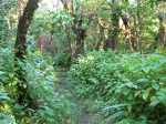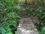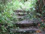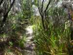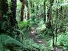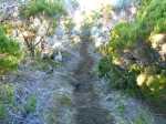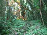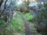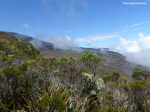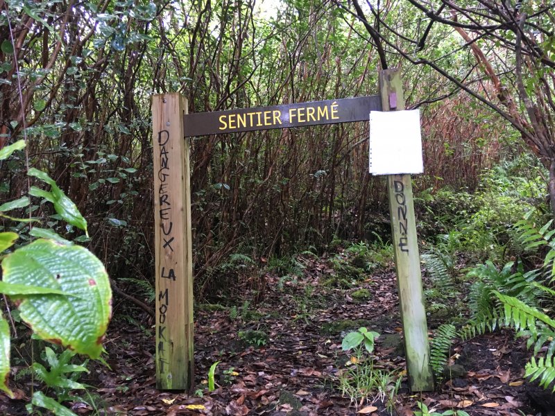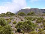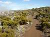 La randonnée débute au kiosque du Tremblet et chemine tout d'abord dans les goyaviers qui ont survécu aux pluies acides de l'éruption d'avril 2007 ou qui ont très vite été remplacés à partir des graines tombées au sol qui n'attendaient qu'un peu de lumière pour se lancer. Le cheminement s'effectue en sous-bois dans la forêt de bois de couleurs, sur des portions de laves très dures et parfois glissantes (Photo 1). La Forêt qui borde la Ravine est encore bien conservée et comporte de beaux spécimens (Photo 2). On longe depuis le départ la Ravine Pont Rouge, souvent à sec, permettant ainsi de repérer plus facilement les grottes ou les belles plaques de basalte recouvertes de mousse. S'en approcher n'est pas prévu lors de cette trop longue étape. Les mousses, orchidées et épiphytes sont partout sur les arbres, mais là-aussi, pas le temps de tout voir (Photo 3). Il faut passer une douzaine de passerelles en aluminium pour franchir de petites ravines, affluents de la Ravine Pont Rouge qu'on longe plusieurs kilomètres sans la voir vraiment à cause de la végétation (Photo 4). Le sentier, mal entretenu, cache de plus en plus ces ouvrages qui ont pourtant du couter très cher (Photo 5). A partir de 800 m la pente s'intensifie et on apprécie certaines marches qui facilitent la grimpette (Photo 6). 400 m plus haut, on arrive à l'ancien abri du Tremblet, démonté depuis longtemps pour trouver une portion presque plate avant la traversée de la Ravine Pont Rouge, à quelques pas d'une arche naturelle facile à trouver en amont du gué. Attention à la glissade en allant à son pied pour augmenter sa collection. Un coup d'œil sur la forêt par les trouées permettent de voir qu'elle est très dense et la pente correcte (Photo 7). Vers la mer, l'impression de hauteur est encore plus forte (Photo 1). On approche des 1500 m et la végétation diminue en taille et en espèces. Les branles verts remplacent petit à petit les bois de couleurs, fanjans ou pimpins. On ne les quittera qu'aux abords du Piton Chisny où aucune végétation n'a encore réussi à s'installer de façon pérenne. Le sentier devient de plus en plus raide et boueux et on coupe une demi-douzaine de ravines, toutes affluents de la Ravine Pont Rouge, ou plus au nord de la Grande Ravine Criais qui tombe plus bas en cascades le long du Rempart du Tremblet (lorsqu'il y a de l'eau !). Le sentier est parfois étroit, plein de gadoue où le pied s'enfonce (Photo 9). La mousse est omniprésente (Photo 10). Les sphaignes forment de beaux tapis colorés qu'il ne faut surtout pas piétiner. Quatre heures se sont écoulées depuis le départ quand on atteint enfin le Nez Coupé du Tremblet qui annonce la fin des soucis de glissades et de chaussures mouillées (ou boueuses !). On a déjà profité depuis 500 m de quelques points de vue sur les Grandes Pentes (Photo 11) mais c'est du Nez Coupé du Tremblet qu'on a les plus vastes panoramas qui vont de l'Océan jusqu'au Pas de Bellecombe. La remontée reprend mais beaucoup plus faible que les 8 km précédents. Le parcours comporte de plus en plus de parties plates très reposantes surtout que le sentier est moins boueux (Photo 11). Après la Mare à Vieux Jean, une flaque d'eau sur la droite, on passe près d'un oratoire ressemblant surtout à une tombe (Photo 13). Le sentier dans les branles passe parfois à quelques centimètres du vide (Photo 14). Même s'il devient étroit, il n'y a aucune difficulté pour suivre la trace (Photo 15). Si par chance le brouillard est encore loin à l'horizon, on marchera sans grands efforts dans les brandes et petites prairies d'herbe rase (Photo 16) ou de velours blancs (Helichrysum heliotropifolium). Cette belle petite plante aux feuilles de velours argenté peut atteindre 1 mètre, trois kilomètres plus bas alors qu'ici, elle a du mal à atteindre les 15 cm, mais donne un bel aspect argenté à la prairie d'altitude lorsque le soleil les frappe. Certaines de ces prairies sont creuses et recueillent l'eau de pluie qui peut les transformer en mares durant plusieurs semaines. Les pieds s'enfoncent encore dans quelques portions marécageuses mais sur de courtes distances. Un petit coup d'œil sur la gauche permet de voir les cratères des Puys Ramond (Photo 16) mais le détour retarderait trop pour une si longue liaison (4 km de plus par le sentier à moins de filer tout droit depuis le Piton Taye Poule). Le pylône du Piton de Bert indique que la pente est terminée ainsi que tous les efforts. On poursuit, toujours en bordure de rempart (Photo 18), en laissant sur la gauche le sentier qui redescend à la Route Forestière des Camphriers puis plus loin, celui qui rejoint Jacques Payet et le Gîte de Mare Longue. Le sentier est très agréable, presque plat par moments (Photo 19). Les landes de Foc Foc sont caractéristiques de cette altitude ; essentiellement des petits branles verts et moins de petits tamarins même si on en aperçoit un peu partout (Photo 20). Rejoindre le Piton Rouge est une balade où l'on retrouve quelques petits tamarins, couverts de fleurs jaunes à la saison et dans lesquels volettent des zoizo verts. Les points de vue sur la Fournaise et ses coulées de lave noire sont multiples (Photo 22). A partir du Piton Rouge, le parcours, qui utilise soit le sentier, soit la piste, s'incurve vers l'Ouest et s'éloigne de l'Enclos Fouqué (Photo 23). On perd des panoramas sur la Fournaise mais on en gagne sur le Chisny et le Demi-Piton en approchant de la Caverne du Chisny et de la Route Forestière du Volcan. Le sol comporte beaucoup plus de lave (Photo 24) et de cailloux (Photo 25) mais l'étape prend bientôt fin. En cas de grosse fatigue, rejoindre le Gîte par la route, sinon filer vers la Griffe du Diable après avoir coupé la RF du Volcan pour retrouver le gîte par le sentier. Les sportifs qui se sentent encore en jambes escaladeront le Demi-Piton (Photo 26) pour clore cette randonnée par les magnifiques paysag