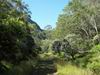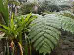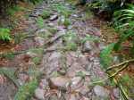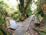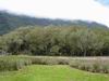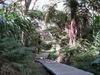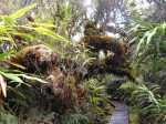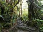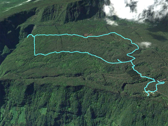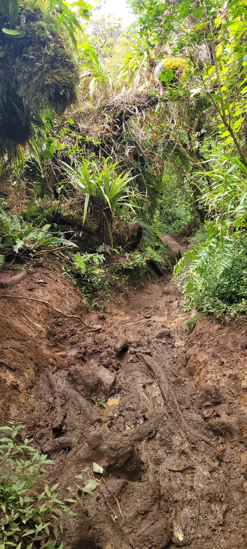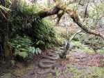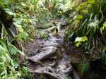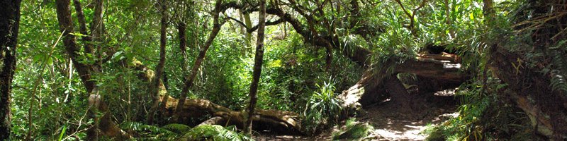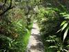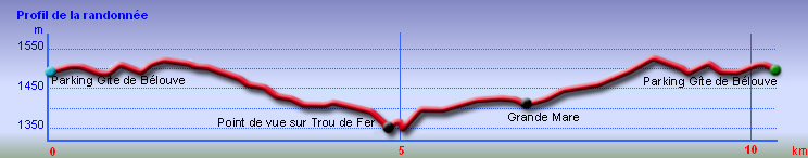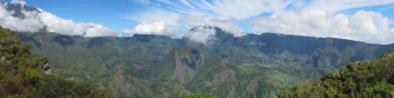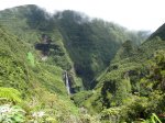 La randonnée débute à la fin de la route de Bélouve, au parking du gîte. On se dirige tout d'abord vers le gîte par la piste ou ses raccourcis pour arriver à un charmant endroit entouré de fleurs (Photo 1). Profiter, avant d'affronter la boue, du splendide panorama sur le Cirque de Salazie à partir d'un grand belvédère aménagé derrière les bâtiments. Il vaut mieux admirer le cirque le matin plutôt que lorsque les nuages auront envahi l'horizon. Ne pas manquer le petit musée du téléphérique, sur la gauche en se rendant au belvédère. Revenir sur ses pas pour prendre le sentier du Trou de Fer repéré près du Gîte, entre deux grands pieds d'azalées, et qui débute par un bel escalier. On suit sous les grands tamarins le sentier qui emprunte parfois des escaliers aux planches de bois de tamarin. Les montées sont faibles et rares et le sentier est de bonne qualité (Photo 2). Il passe entre deux bassins d'eau sombre de la Ravine Fleurs Jaunes dont un qui est traversé par des troncs d'arbres couchés par le vent. Il rejoint très vite la Piste Forestière des Fleurs Jaunes par une portion comportant de grandes marches et traversant plus loin un beau sous-bois de tamarins (Photo 3). Après quelques passages techniques sur roches ou racines, bifurquer à gauche sur la piste qui est large, plate et très agréable après ces premières courtes portions déjà un peu boueuses. La Reine des Tamarins est couchée à une centaine de mètres de là, continuant à vivre tranquillement dans son écrin de verdure (Photo 4). Un petit sentier sur la droite permet d'aller à l'arrière de l’ancêtre et de grimper facilement sur son dos. La visite ne prend que 5 minutes. On retrouve la piste rectiligne entre tamarins, fleurs jaunes et grandes fougères arborescentes (Photo 5). Un peu plus loin, il faut quitter la piste pour prendre à gauche le sentier du Trou de Fer en direction du point de vue. Il débute par un plancher de bois de tamarin vieillissant qui, très vite, fait place à la terre, si elle n'est pas transformée en boue dans les parties creuses. Il faut chaque fois repérer où poser les pieds, le plus souvent sur les racines ou les rondins qui dépassent (Photo 6). En période de pluies fréquentes, les morceaux de bois jetés sur la boue sont salutaires mais glissants (Photo 7). Les milliers de contournements ont parfois créé un sentier large qui a dénudé les racines des bois de couleurs (Photo 10). Heureusement, quand on ne regarde pas ses pieds, on peut admirer la forêt primaire de chaque côté (Photo 11). Malgré quelques ralentissements dus à des arches végétales de tamarins tombés au sol, des racines saillantes, des plaques boueuses ou des planchers grossiers de troncs, on parvient sans encombre au croisement du sentier de l'Ecole Normale. Prendre à gauche et entamer la descente qui mènera au belvédère. C'en est fini de la boue. Le sol est recouvert de très longs planchers grillagés entre les arbres moussus (Photo 13). Certaines portions sont si pentues qu'il a fallu y construire des escaliers. On parvient assez rapidement au belvédère. Il est large, constitué d'un grand plancher sur plusieurs niveaux et peut supporter des dizaines de marcheurs. Il est d'ailleurs très fréquenté depuis son aménagement. De la rambarde, profiter de ce panorama unique sur une des grandes cascades du Trou de Fer. Le Bras de Caverne qui passe près du gîte, se précipite par une première cascade sur la gauche du cirque profond mais on ne distingue bien que le bassin (Photo 15). Le Trou de Fer porte bien son nom. La plus haute chute, qu'on distingue très bien, tombe de plus de 100 mètres dans un puits sans fond (Photo 16). Les hélicoptères y font parfois la queue pour transporter les touristes au plus près de la cascade. Faire demi-tour sur le même itinéraire jusqu'au croisement avec le sentier de l'Ecole Normale où un banc humide permet de se reposer de la courte mais forte pente (Photo 17). Ne pas reprendre le sentier utilisé à l'aller mais poursuivre sur le sentier de l'Ecole Normale. On retrouve le même paysage végétal touffu sur un sol essentiellement constitué de planchers de bois (Photo 19). Ils vieillissent doucement et auront très vite besoin d'une réfection. Quand les planches semblent plus vermoulues que les autres, marcher sur l'emplacement de la poutre de soutien, plus solide. On parvient après un petit détour à une vaste clairière entourée de tamarins et comportant une immenses mare bordée de joncs (Photo 21). Faire le tour ou non de la Mare en fonction de la hauteur d'eau. Ce court trajet parfois aléatoire permet de s'approcher de ces magnifiques tamarins de Hauts (Photo 22). Poursuivre en direction de la piste Forestière des Mares en retrouvant des portions boueuses ou recouvertes de planches (Photo 23). Prendre à gauche en parvenant à la pite puis à droite en direction du gîte au milieu des tamarins (Photo 28). On retrouve facilement le sentier qui ramène au point de départ.