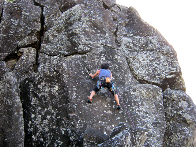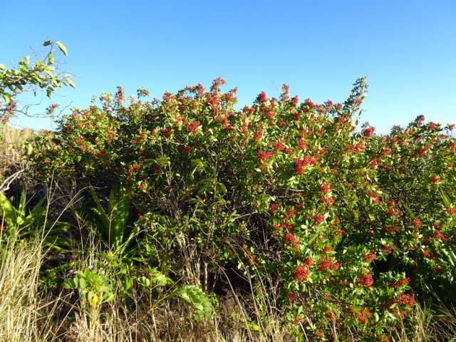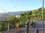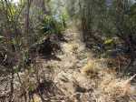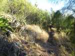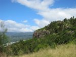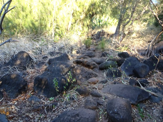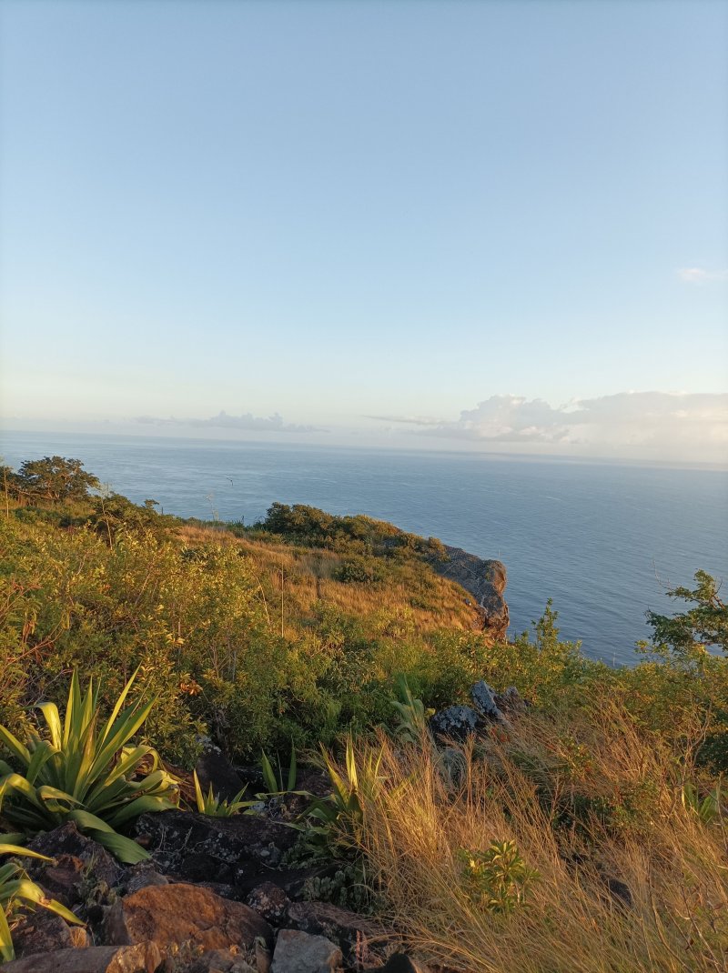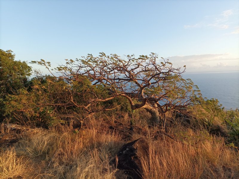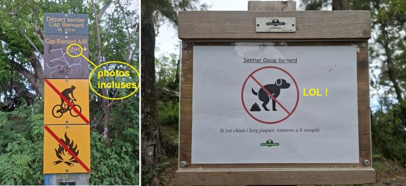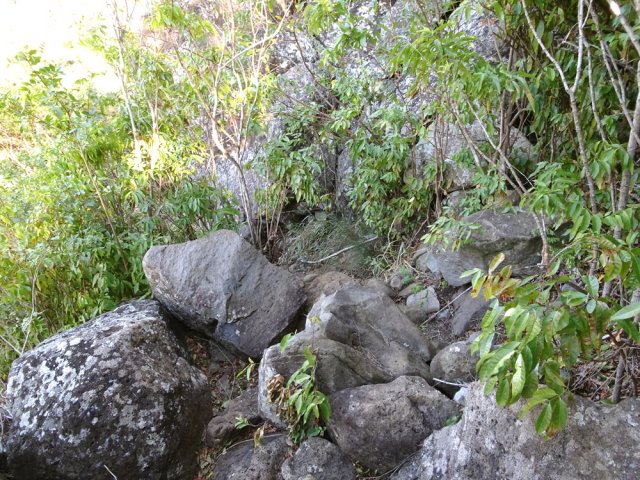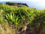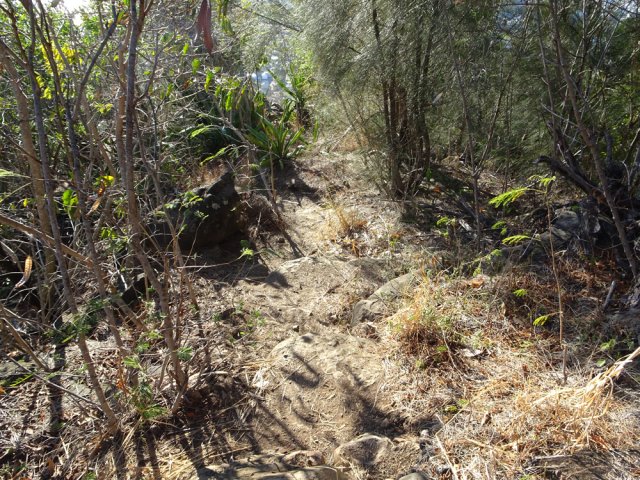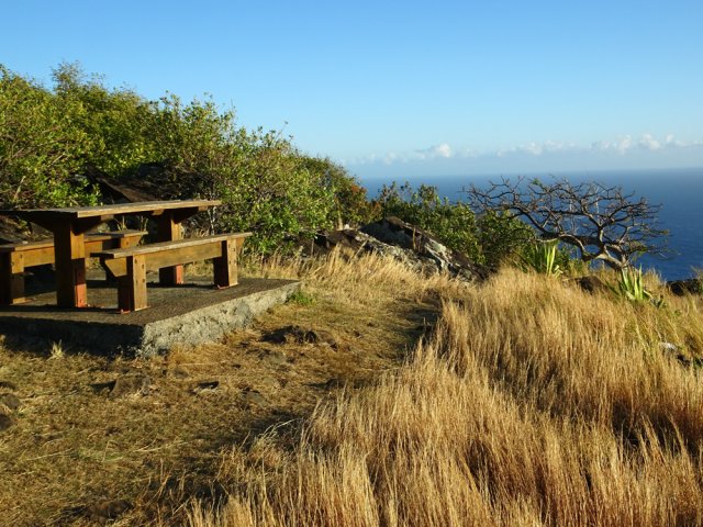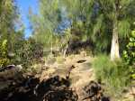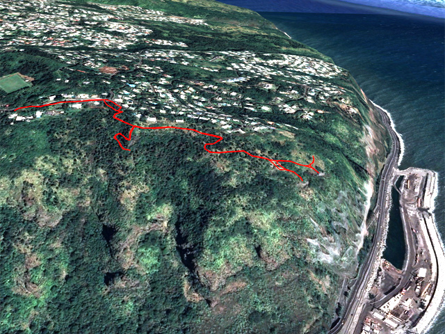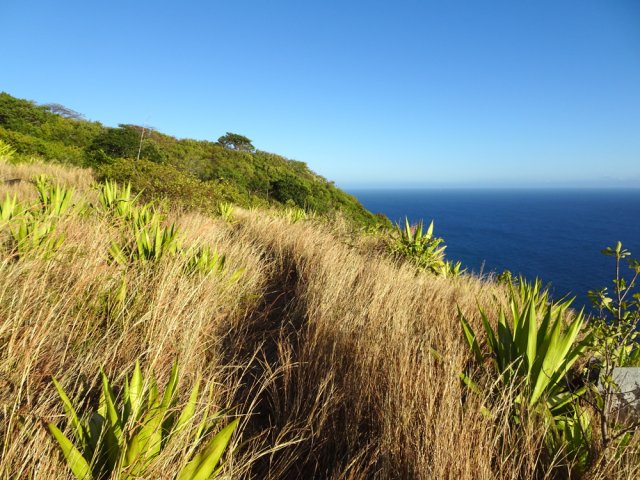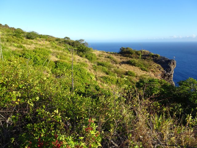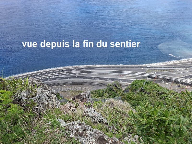 Pour corser un peu et rallonger le circuit, on peut pousser plus avant par des sentiers qu'on aperçoit un peu partout. Par exemple, en partant vers un flamboyant près d'une table de pique-nique (Photo 12) il est possible de rejoindre le bord du rempart par un sentier étroit mais sans danger. On se retrouve sur le promontoire rocheux qui domine la Nouvelle Route du Littoral pour de beaux points de vue sur le Quartier Lambert (Photo 13). Pour les plus aventureux, il est possible de partir vers la falaise et la longer pour rejoindre d'autres rochers qu'on repère de l'autre côté sur la gauche (Photo 14). Le plateau a été maintes fois parcouru par les cordistes en charge de maintenir les filets qui dominent la Route du Littoral et les sentiers utilisés sont bien visibles dans les herbes. Pour y parvenir, se rapprocher du kiosque proche d'une table et partir vers le fourré (Photo 15). Un sentier se divisant en deux débute ici. Prendre celui de droite et le suivre facilement dans les poivriers, chocas et herbes (Photo 16). Après une forte descente, on se rapproche des filets qui recouvrent le sol (Photo 17). Poursuivre vers l'ouest sur un terrain recouvert d'herbe et de chocas avec beaux points de vue sur l'océan (Photo 18). La trace est facile à deviner dans les herbes car elle semble régulièrement utilisée (Photo 19). On se rapproche de pierriers recouverts de poivriers (Photo 20) et la trace est plus difficile à trouver. On peut également en emprunter un autre qui rejoint la trace encore présente sur les cartes IGN, mais l'état le rend plus aléatoire. Retourner à la table d'orientation et prendre le chemin inverse pour revenir au point de départ. Après une remontée un peu plus pénible en raison des nombreuses pierres, on parvient au sentier partant sur la gauche vers les zones d'entrainement des grimpeurs (Photo 21). Le sentier, essentiellement constitué d'un amoncellement de roches est parfois périlleux le long des premières barres rocheuses (Photo 22). On parvient cependant assez vite aux spots équipés. Ils sont baptisés comme souvent de noms originaux inscrits sur la roche. On peut ainsi longer ces rochers sur un sentier abrupt et étroit et bénéficier à nouveau de points de vue sur le chef-lieu (Photo 23). De nombreux itinéraires déjà équipés de pitons demeurent dangereux et ne doivent être empruntés qu'avec du matériel d'alpinisme (Photo 25 et 26). Avec un peu de chance on pourra assister avant de repartir à une démonstration qui ne peut que donner envie de revenir équipé à condition d'être inscrit dans un club afin d'y acquérir la technique minimum pour cette activité beaucoup plus dangereuse que la randonnée (Photo 27). Avant de terminer la randonnée, ne pas manquer la courte jonction au superbe point de vue aménagé en aval sur le Chemin de la Vigie, sur la gauche de la route. Une rambarde, des lampadaires pour la nuit ou des bancs en font un lieu idéal de repos au retour, même si cette sortie est facile (Photo 28).