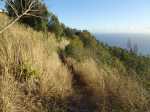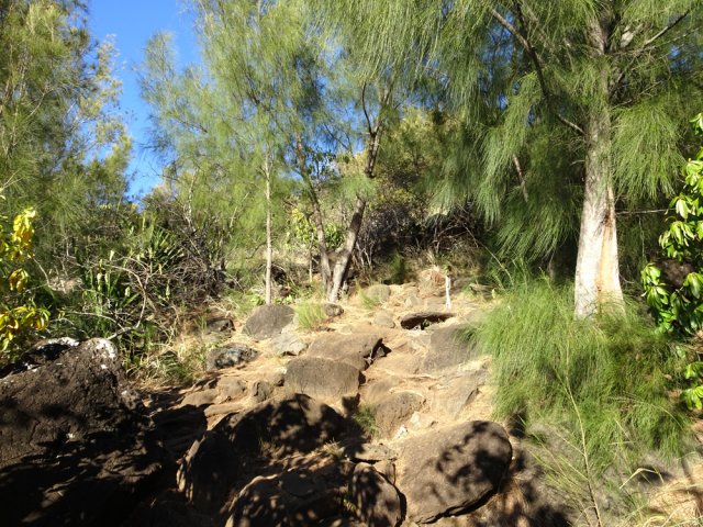 La randonnée débute au croisement du Chemin de la Vigie et du Chemin Cap Bernard. Un poteau de l'ONF attire l'attention. Le sentier débute sa descente et rencontre un peu plus bas une autre entrée qui pourra être utilisée en fin de parcours. Le cheminement s'effectue principalement dans les herbes et de petits rochers qui encombrent le sentier (Photo 1). La végétation est assez pauvre excepté quelques beaux filaos. La progression est facile et le regard porte tantôt sur le sol pour éviter les cailloux, tantôt sur le chef-lieu pour de superbes panoramas. On utilise des portions herbeuses à plat (Photo 2) ou très rocheuses où il faut ralentir le pas, surtout en descente (Photo 3). Laisser sur la droite et pour la fin de la balade le sentier étroit pris par les alpinistes ou adeptes de la varappe. On marche toujours dans les grandes herbes où poussent ça et là quelques chocas, filaos ou faux poivriers qui ont du mal à atteindre des tailles respectables en raison de l'aridité du sol. Ces grosses roches créent parfois de hautes marches qui empêchent ce trajet d'être effectué par tous (Photo 4). A tout moment, de magnifiques panoramas sur la ville de Saint-Denis imposent de s'arrêter (Photo 5). Un bois de filaos procure juste assez d'ombre pour rafraîchir un peu mais il faut de toute manière amener de la boisson car la sortie est chaude même si elle est courte (Photo 6). La descente se termine sur une aire de pique-nique comportant plusieurs emplacements dont deux couverts (Photo 7). Une grande table d'orientation, posée au sol, donne tous les détails sur la ville de Saint-Denis au pied du rempart (Photo 8). Pour une fois, la table n'est pas rectangulaire mais a la forme de la côte qu'elle représente. C'est donc tout à loisir qu'on peut chercher le nom des bâtiments et curiosités de la ville en observant le paysage au pied de la falaise (Photo 9). Le regard porte également côté montagne en direction du Pic Adam (Photo 10). La sortie familiale cesse ici et le retour au point de départ s'effectue par le même sentier.
