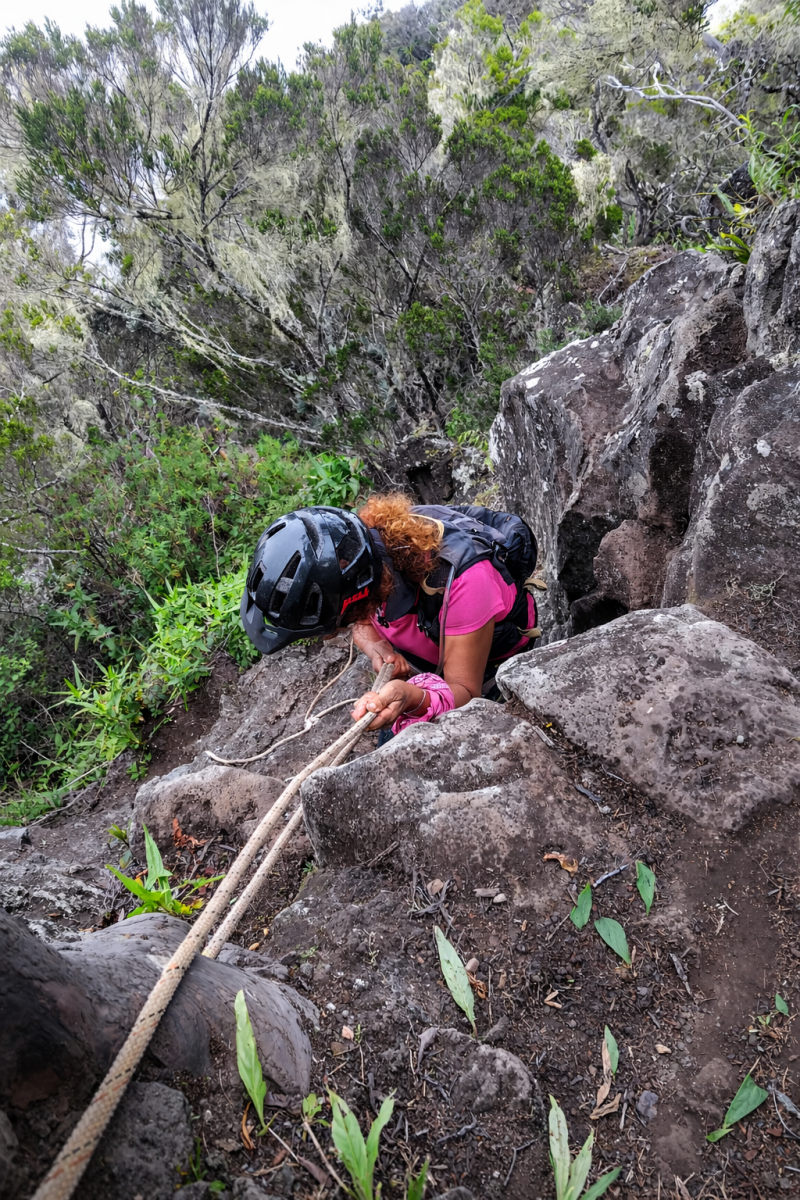 La randonnée commence à Grand Ilet par la piste qui débute à gauche, une centaine de mètres avant la Ravine Roche à Jacquot en direction de la Mare à Martin. C'est une agréable balade parmi les treilles de chouchous, les bambous sur un large passage bordé de jouvences, longoses et vignes marronnes. On traverse des ravines et des bois de filaos jusqu'aux premiers lacets en direction de la Fenêtre de Grand Îlet (Photo 1). A l'horizon, on distingue très bien le parcours à effectuer en repérant tout d'abord la Fenêtre puis la rude montée vers le sommet de Cimendef qui, d'ici, semble très difficile car étroite. Compter une petite heure pour atteindre la Fenêtre à partir des filaos par une pente assez sérieuse. Les difficultés sont rares, quelques portions plates entre les lacets permettent de souffler un peu (Photo 2). Les goyaviers, jouvences et longoses bordent le sentier. On bénéficie tout au long de la montée de larges panoramas sur les villages vers la Mare à Martin ou sur le Piton Plaine des Fougères. Vers le cœur du cirque c'est le Piton d'Anchain qui domine les autres villages (Photo 3). Enfin, de l'autre côté, on a l'ensemble du Gros Morne qu'on verra dans son ensemble en montant le Cimendef. Après une remontée vers le nord, le sentier revient plein sud et se termine à la Fenêtre près d'un petit oratoire. La barrière du belvédère a disparu mais le point de vue est tout de même dégagé. Après le régal des yeux sur le Cirque de Salazie depuis le belvédère, il faut se préparer à la deuxième partie qui n'a plus rien à voir avec la montée précédente. C'est le moment de faire demi-tour si la vue de la première pente fait déjà flageoler les jambes (Photo 4). Le Cimendef, qui ressemble de loin à une pyramide, est en réalité une succession de pentes entrecoupée de courts faux plats qui ne suffiront jamais à reposer les jambes. On remarque surtout l'étroitesse de l'arête et de hautes barres rocheuses laissant penser à de futures escalades. Entamer une forte descente en direction du col qu'on devine plein sud (Photo 5). Ne pas prendre la trace bien visible créée par des erreurs de départ se finissant dangereusement sur des à-pics verticaux à moins de 20 mètres. Prendre le sentier, plus discret, près d'un rocher au bord du vide et descendre d'une cinquantaine de mètres sur un parcours humide, étroit, glissant et surtout rocheux (Photo 6). Au col, le terrain est plat au milieu d'une végétation assez dense. Repérer pour une prochaine expédition sportive, le discret départ du sentier vers Deux Bras par la descente du Bras de Sainte-Suzanne. A partir du col qui marque la séparation entre le Cimendef et le massif de la Roche Ecrite, la remontée débute entre les troncs et sur les racines (Photo 7). Attaquer ensuite les 700 mètres qui séparent du sommet sur un sentier qui restera toujours visible même sur les passages rocheux ou très étroits. Les premières barres rocheuses font leur apparition tout comme les premières escalades. L'arête étant souvent étroite, on profite ainsi de superbes panoramas sur le nord du Cirque de Salazie jusqu'au Piton Bémassoune (Photo 9). De l'autre côté, beaucoup plus impressionnante, la vallée du Bras de Sainte-Suzanne peut décourager les volontaires à entreprendre sa descente (Photo 10). Les courtes escalades s'enchaînent et s'effectuent facilement si l'on prend bien soin de saisir un rocher stable (Photo 11). Faire constamment attention à ces prises en évitant les roches branlantes. Pourtant, ces passages sont moins impressionnants qu'on a pu l'imaginer en regardant depuis Grand Îlet ou depuis la Fenêtre. Attention de ne pas blesser un de ces geckos verts des Hauts qui se dorent paisiblement au soleil et bougent à peine au passage du grimpeur (Photo 12). On retrouve la végétation et le paysage qu'on ne quittera plus jusqu'au sommet. Les branles verts ou gris vont constituer l'essentiel de la verdure rencontrée (Photo 13). Les vues sur Grand Îlet sont nombreuses et certaines peuvent être vertigineuses (Photo 14). On atteint un premier replat qui permet de se rendre compte que le plus difficile reste à effectuer. La pente de l'arête est vraiment impressionnante et il n'est pas encore trop tard pour faire demi-tour (Photo 15). Le passage du petit col séparant les deux pitons est étroit, vertigineux et peut inquiéter sur quelques mètres (Photo 16). L'ascension reprend dans les mêmes conditions sur des roches de plus en plus nombreuses (Photo 17). Presque tous les passages sont facilités par des racines ou des branches moussues de branles bien implantés dans le sol (Photo 18). Les très rares passages plus plats sont très bien marqués par les multiples passages de volontaires pour sensations fortes (Photo 19). Les barbes de Jupiter se multiplient à partir de la mi-pente même si le vent cherche constamment à les décrocher (Photo 20). Les portions rocheuses sans végétation se passent à quatre pattes, meilleur moyen d'assurer la stabilité (Photo 21). Par endroits, la végétation doit bénéficier plus qu'ailleurs d'eau ou de bonne terre car elle devient tout d'un coup plus abondante (Photo 22). Il faut même se frayer un chemin entre les branches et les troncs quand ils sont plus touffus (Photo 26). Les cordes aidant au franchissement de certains passages ont été enlevées et l'attention doit redoubler (Photo 24). Mais ce sont surtout les passages étroits où le sac à dos peut accrocher une roche qu'il faut redoubler de vigilance afin de ne pas être déstabilisé (Photo 25). Repérer sur la gauche le départ du sentier en direction du Piton Bémale et de la RF du Haut Mafate, itinéraire laissé aux alpinistes munis de longues cordes. L'arête, parfois très étroite, se passe aisément en raison des plantes qui protègent du vide (Photo 26). Compter deux heures d'un rythme normal de deux randonneurs pour atteindre le sommet recouvert de branles rabo