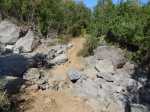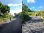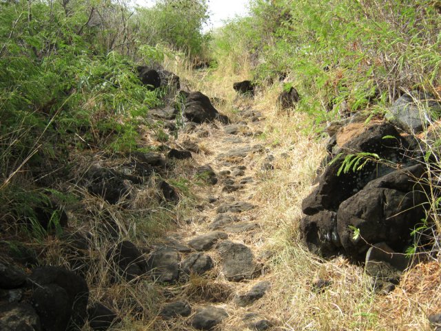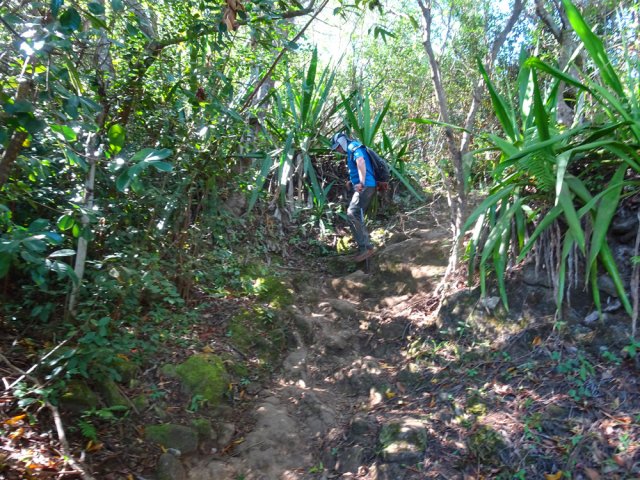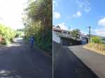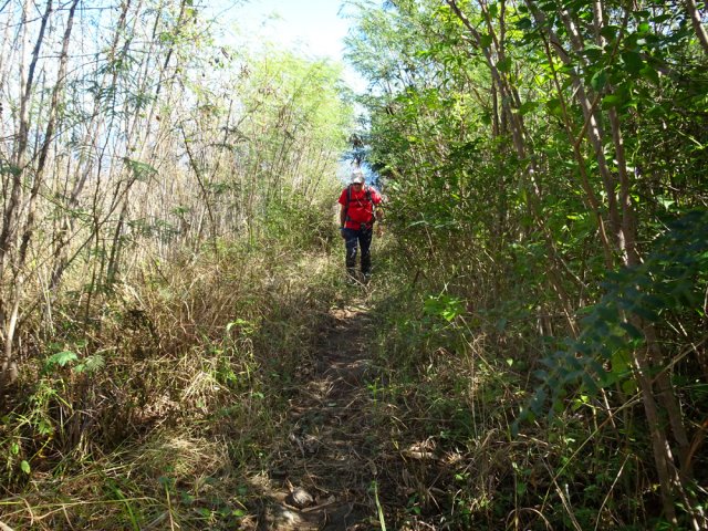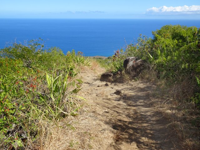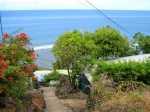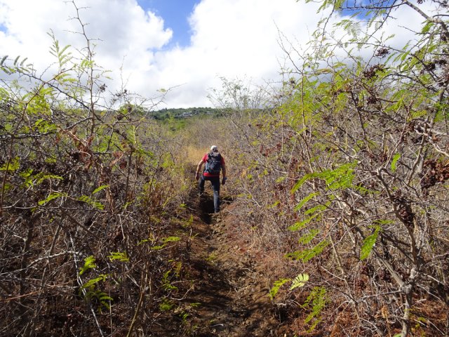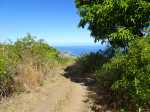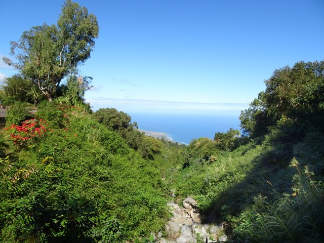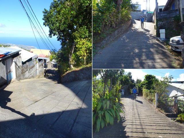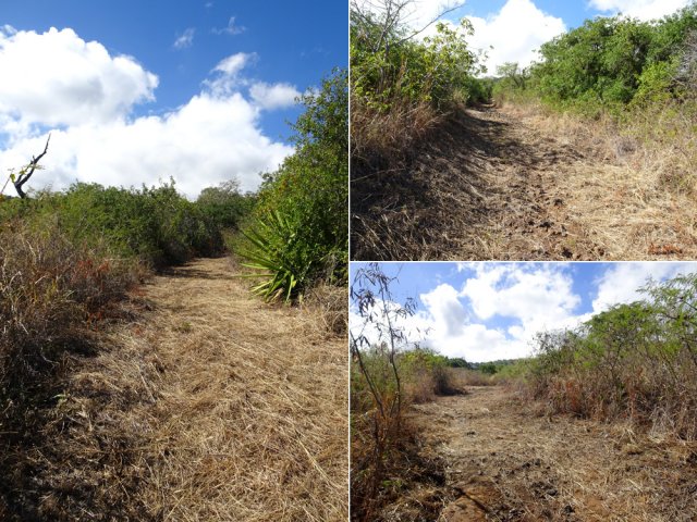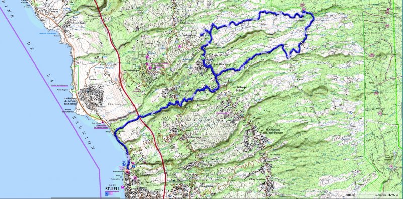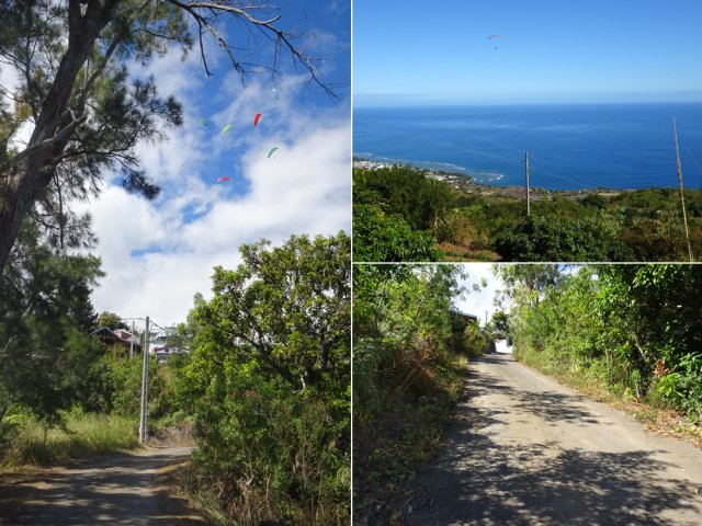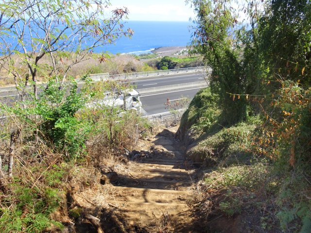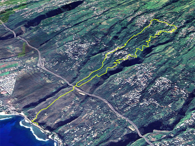 La randonnée débute au parking situé entre Saint-Leu et Cayenne. Rejoindre le hameau dont la rue principale est un escalier étroit remontant rapidement en s'éloignant de la mer (Photo 1). On se retrouve très vite dans la savane constituée d'immenses zones couvertes de zépinards (acacia farnesiana), comme toute la région d'ailleurs. Les parapentistes survolent cette plante épineuse, espérons qu'aucun incident technique ne les précipitera dans ces arbustes peu accueillants. Le sentier grimpe ensuite au milieu de ces acacias par une pente raisonnable et un passage assez étroit (Photo 2). D'énormes roches bordent le parcours et participent, une fois chauffées au soleil, à l'inévitable transpiration (Photo 3). Certaines portions de ce sentier sont sommairement pavées, sans doute à l'époque où il n'y avait pas de route. Les arbustes ne sont jamais très hauts et permettent de profiter des panoramas sur le littoral de Saint-Leu. Lorsque les épineux diminuent, ils sont remplacés par de hautes herbes qu'on n'a peu l'habitude de voir vertes. Un peu plus haut, c'est une canalisation qu'on longe sur un sentier facile. Moins de 30 minutes plus tard, on se retrouve auprès de la Route des Tamarins où la circulation importante est bruyante. Un escalier métallique descend le long de l'ouvrage et permet de se rendre en-dessous. De l'autre côté, le sentier remonte fortement mais il peut être très vite recouvert d'herbe, faute d'entretien (Photo 4). Il grimpe vers le village de Bras Mouton par deux itinéraires possibles. Le premier part à droite à la petite passerelle en bois rencontrée après la RN1 (Photo 5). L'autre, à gauche, sera emprunté au retour. Franchir la passerelle et tourner à droite en longeant le grillage sur un sentier étroit. Les épineux sont toujours là. Le sentier, même mal entretenu se suit sans hésitation et sans griffure (Photo 6). 150 m plus loin, la végétation change un peu autour du sentier toujours facile à suivre (Photo 7). On entend le bruit d'un moteur et l'on se retrouve devant une station de pompage. A partir de là, la montée devient très facile car la piste est régulièrement nettoyée pour permettre aux équipes de maintenir le matériel en état (Photo 8). Certains virages s'approchent de la Ravine de la Chaloupe qu'on surplombe par moments. La pente ne faiblit pas, sans jamais être très forte. Certaines portions un peu plus caillouteuses sont parfois plus pentues (Photo 9). 20 minutes de marche après la passerelle, on s'approche des premières habitations et cultures (Photo 10). La piste (le Chemin des Roses des Bois) devient de plus en plus fréquentée par les véhicules et se transforme en route. La jonction avec la RD13 comporte des pentes plus fortes que sur la piste (Photo 11). On peut souffler en regardant vers l'océan où le regard porte jusqu'à la Pointe au Sel. On quitte le Chemin des Roses des Bois qu'on retrouvera à la fin du prochain tronçon passant par Notre Dame des Champs. Bifurquer à gauche sur la RD13 et marcher jusqu'au début du Chemin Potier. Cette petite route en lacets, sans beaucoup de circulation, est agréable entre bois, friches et champs de cannes (Photo 12). Les allergiques au goudron compenseront en regardant les panoramas sur la côte et l'océan de l'Etang Salé les Bains jusqu'à la Saline (Photo 13). La montée de 45 minutes ne comporte pas de raccourcis pour éviter les nombreux virages. La pente, régulière sur toute la montée, s'accentue un peu à l'approche de la RD3 (Photo 14). La portion de près d'un km pour atteindre le chemin du retour s'effectue en zone semi-urbaine sur de larges trottoirs (Photo 15). Profiter de cette traversée pour repérer les cases ou les jardins fleuris (Photo 16). Les rencontres y sont faciles et très souvent agréables. Ne pas hésiter à rester le temps qu'il faut pour lier de sympathiques conversations avec les habitants. La route franchit quatre ravines avec, chaque fois, de belles vues en direction de l'océan (Photo 17). Après 800 m de RD3, emprunter à gauche l'escalier menant au Chemin des Corbeilles. La jonction avec le sentier passe par des rues étroites et des raccourcis très pentus où les pneus doivent déraper par temps de pluie (Photo 18). Ne pas manquer le départ du sentier dans un virage de la très forte pente du Chemin des Goyaviers (Photo 19). Le reste de la descente ne quittera guère ces sentiers jusqu'à la mer. Le point de départ est un escalier de quelques marches (Photo 20). La pente est toujours raisonnable dans une végétation qui procure de l'ombre (Photo 21). Eviter les sentiers qui partent en direction des propriétés privées en restant constamment sur le sentier principal. Les chocas, de plus en plus nombreux, ne gênent pas la marche sur un large sentier terreux (Photo 22). Il rencontre régulièrement les virages en épingle du Chemin Mutel qu'on évite ainsi sur toute sa longueur. Certaines portions courtes mais pentues ne ralentissent pas les joggers sautant de caillou en caillou (Photo 23). Un peu avant l'arrivée à Bras Mouton, on peut continuer sur l'un ou l'autre des sentiers qui effectuent une fourche. Couper encore des virages au niveau du terrain de sport et emprunter à nouveau des ruelles étroites et pentues (Photo 24). Là également, des escaliers et raccourcis évitent les ruelles entre les habitations. Pour ne pas manquer le Sentier de Cayenne, suivre les flèches au sol apposées lors des dernières courses. Une fois sur le sentier, plus besoin de réfléchir à l'orientation. Le passage est large, très fréquenté, avec toujours de magnifiques vues sur la mer (Photo 25). La pente est rarement forte et cette descente est presqu'une balade sur des sols terreux ou rocheux (Photo 26). La végétation est de plus en plus pauvre au fur et à mesure de la descente, avant de rencontrer les premiers épineux (Photo 27). On entend les véhicules de la RN1 puis on arrive au gué rocheux sur le Bra