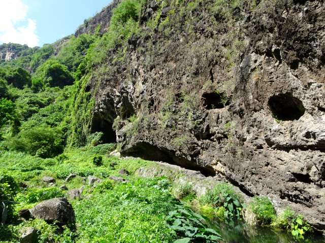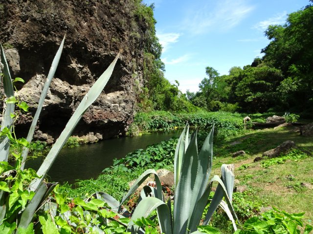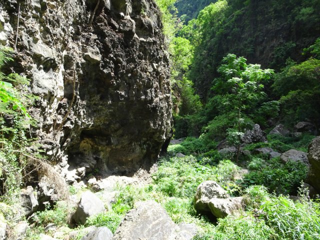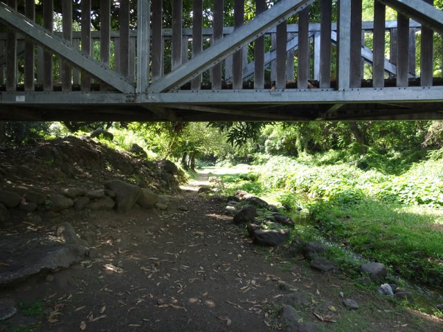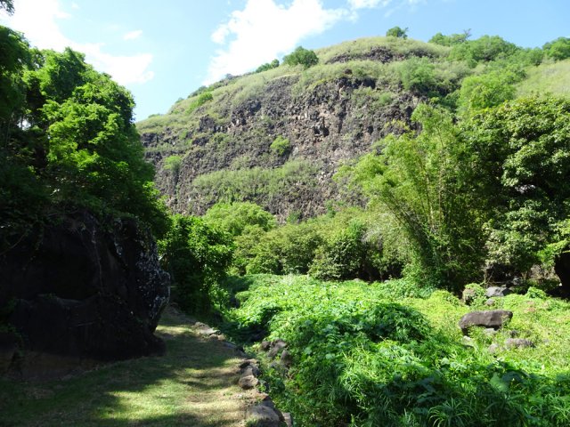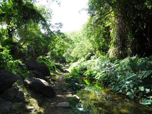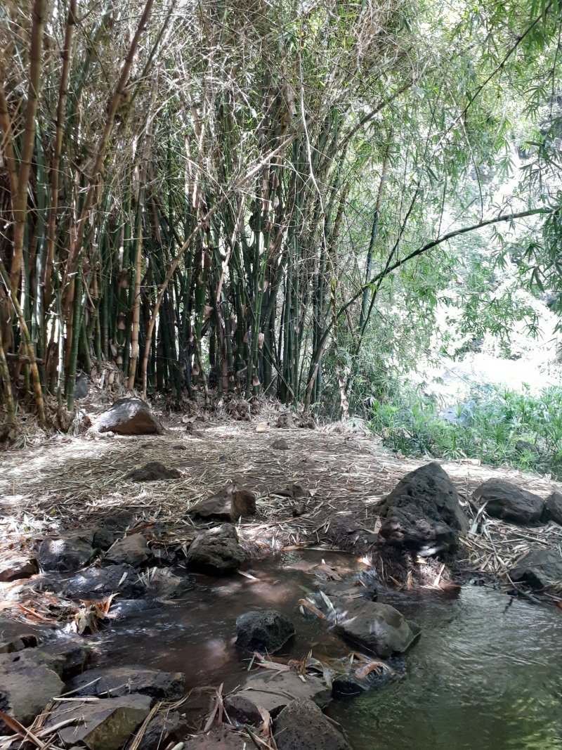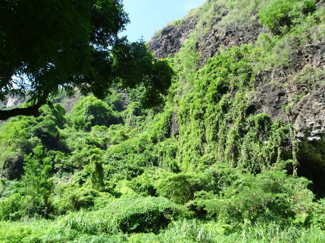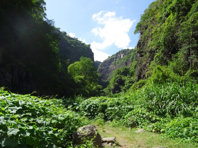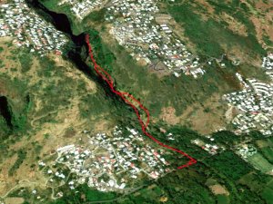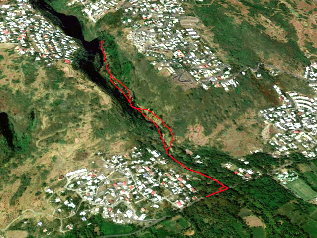Le sentier débute à la passerelle qui enjambe la ravine (Photo 2). Un nombre impressionnant de chaussures jetées sur les fils électriques participent à l'accueil des randonneurs (Photo 1). Le "shoes tossing" est commun dans le monde en général et à La Réunion en particulier. La passerelle de la Ravine Divon permet de tricher un peu en lançant les chaussures depuis le plancher, permettant ainsi de gagner trois mètres. Le sentier suit le lit qui est assez large pour un cours d'eau aussi court (Photo 3). Quelques portions de terrain sont recouvertes d'herbe rase (Photo 4), tondue par les chèvres venues des habitations de Bouillon par des sentiers escarpés qu'on devine sur la gauche. Le sentier passe souvent au plus près de l'eau, ce qui permet de surprendre un poisson nageant entre les racines des plantes poussant au fond (Photo 7). Sur la gauche, de hautes barres rocheuses abritent quelques grottes (Photo 6). Le sentier est le plus souvent large et bien entretenu (Photo 8). La falaise, de l'autre côté, est plus haute et verticale, impossible à franchir (Photo 9). Il faut passer par de petits gués pour aller de temps en temps d'une rive à l'autre en suivant le plus naturellement possible le sentier pris en rive droite au début. La végétation est souvent constituée de lianes courant sur le sol comme des treilles de chouchous ou les lianes antigone (Photo 11). Une falaise verticale percée de plusieurs grottes domine ce bassin ; l'une d'entre elles comporte plusieurs vestiges de visites fréquentes (Photo 13). Il faut à nouveau traverser quelques fois la rivière en suivant la trace facile à deviner. Le trajet passe plus loin entre de grosses touffes de bambous (Photo 16). La progression continue en longeant une importante invasion du bas du rempart par des chouchous (Photo 17). Le sentier entame une montée plus forte et s'approche d'un bassin, entouré de taros et de papyrus, alimenté par une minuscule chute (Photo 18). C'est la fin de la randonnée pour tous. Il est possible, sans courir de grands risques de poursuivre sur des traces de plus en plus difficiles à voir dans la végétation en direction de l'amont. Le sol est surtout recouvert de grosses roches surchauffées par le soleil (Photo 19). En escaladant les rochers, on atteint le haut du bassin (Photo 20). Le sentier a disparu et la meilleure solution consiste à raser la falaise en rive gauche pour cheminer en direction du pisse en l'air qu'on aperçoit à quelques mètres (Photo 21). Une source dans la falaise se déverse en fines gouttelettes qui viennent alimenter la ravine (Photo 22). Poursuivre au-delà de ces éclaboussures relève de l'aventure car la vallée devient étroite et les plantes recouvrent les roches, laissant des zones cachées où il ne fait pas bon tomber. Le retour s'effectue par le même itinéraire jusqu'aux bambous. Repérer certaines zones rocheuses bordées de belles pelouses incitant à l'arrêt (Photo 23). Les rochers sont équipés et il est fréquent d'y rencontrer des grimpeurs à l'entraînement. Après le Bassin Long, obliquer sur le sentier ombragé qui chemine en rive gauche (Photo 25). De nouveaux emplacements calmes et ombragés se présentent (Photo 26). On s'approche de nouveaux spots de grimpe avant de parvenir à des vestiges de canal bouché par la terre (Photo 27). Des marches sur le rocher indiquent la présence d'un sentier qui finit désormais en propriété privée. Le sentier, large et bordé de pierres, s'élargit pour une promenade facile jusqu'au dernier gué (Photo 28). La fin du trajet emprunte l'itinéraire du début jusqu'à la passerelle.