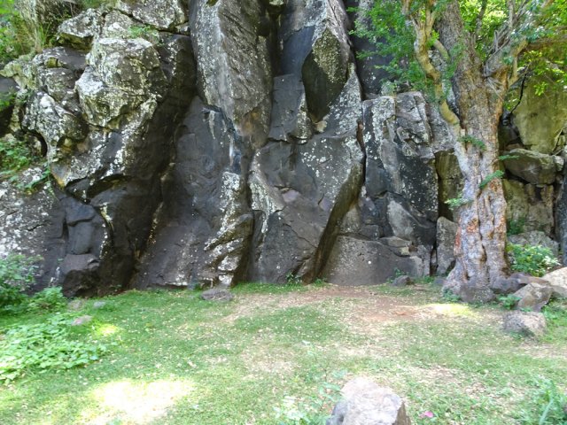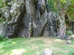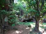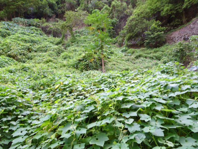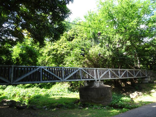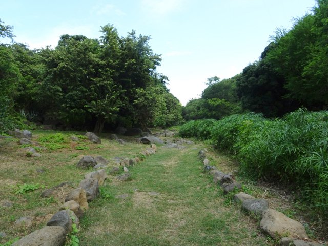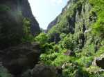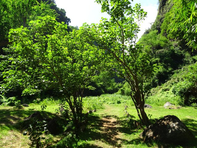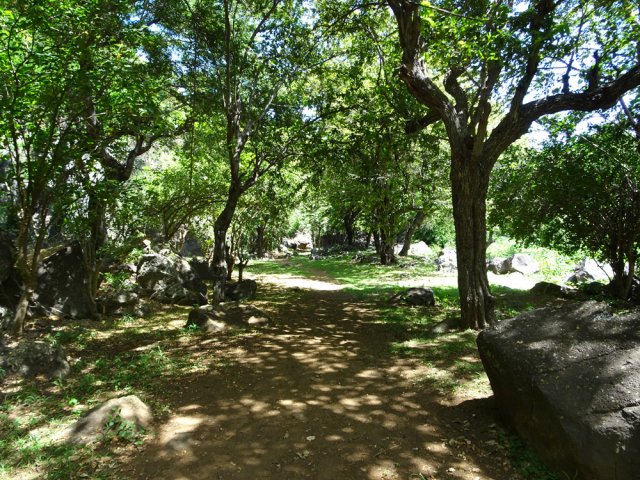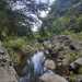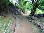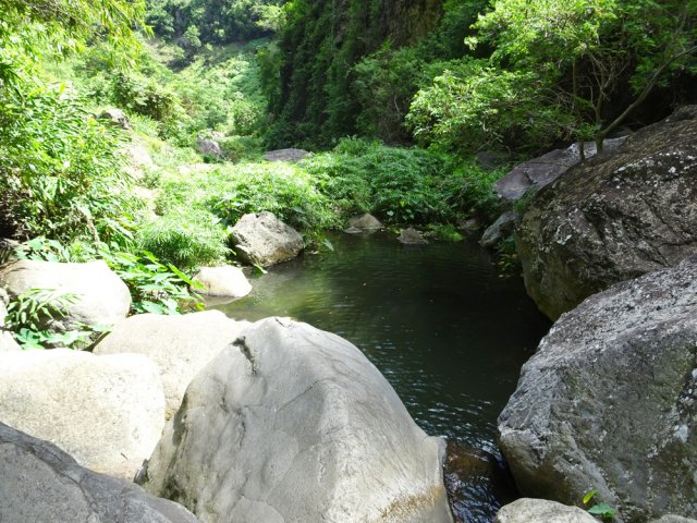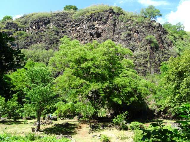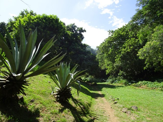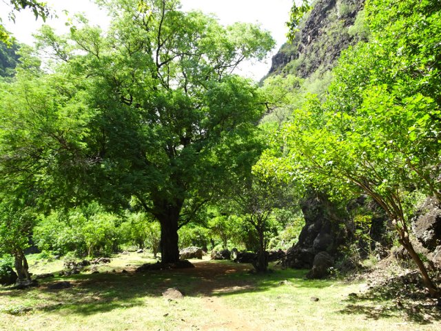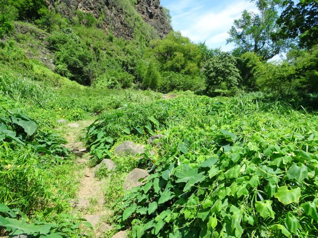 Le sentier débute à la passerelle qui enjambe la ravine (Photo 2). Un nombre impressionnant de chaussures jetées sur les fils électriques participent à l'accueil des randonneurs (Photo 1). Le "shoes tossing" est commun dans le monde en général et à La Réunion en particulier. La passerelle de la Ravine Divon permet de tricher un peu en lançant les chaussures depuis le plancher, permettant ainsi de gagner trois mètres. Le sentier suit le lit qui est assez large pour un cours d'eau aussi court (Photo 3). Quelques portions de terrain sont recouvertes d'herbe rase (Photo 4), tondue par les chèvres venues des habitations de Bouillon par des sentiers escarpés qu'on devine sur la gauche. Le sentier passe souvent au plus près de l'eau, ce qui permet de surprendre un poisson nageant entre les racines des plantes poussant au fond (Photo 7). Sur la gauche, de hautes barres rocheuses abritent quelques grottes (Photo 6). Le sentier est le plus souvent large et bien entretenu (Photo 8). La falaise, de l'autre côté, est plus haute et verticale, impossible à franchir (Photo 9). Il faut passer par de petits gués pour aller de temps en temps d'une rive à l'autre en suivant le plus naturellement possible le sentier pris en rive droite au début. La végétation est souvent constituée de lianes courant sur le sol comme des treilles de chouchous ou les lianes antigone (Photo 11). Une falaise verticale percée de plusieurs grottes domine ce bassin ; l'une d'entre elles comporte plusieurs vestiges de visites fréquentes (Photo 13). Il faut à nouveau traverser quelques fois la rivière en suivant la trace facile à deviner. Le trajet passe plus loin entre de grosses touffes de bambous (Photo 16). La progression continue en longeant une importante invasion du bas du rempart par des chouchous (Photo 17). Le sentier entame une montée plus forte et s'approche d'un bassin, entouré de taros et de papyrus, alimenté par une minuscule chute (Photo 18). C'est la fin de la randonnée pour tous. Il est possible, sans courir de grands risques de poursuivre sur des traces de plus en plus difficiles à voir dans la végétation en direction de l'amont. Le sol est surtout recouvert de grosses roches surchauffées par le soleil (Photo 19). En escaladant les rochers, on atteint le haut du bassin (Photo 20). Le sentier a disparu et la meilleure solution consiste à raser la falaise en rive gauche pour cheminer en direction du pisse en l'air qu'on aperçoit à quelques mètres (Photo 21). Une source dans la falaise se déverse en fines gouttelettes qui viennent alimenter la ravine (Photo 22). Poursuivre au-delà de ces éclaboussures relève de l'aventure car la vallée devient étroite et les plantes recouvrent les roches, laissant des zones cachées où il ne fait pas bon tomber. Le retour s'effectue par le même itinéraire jusqu'aux bambous. Repérer certaines zones rocheuses bordées de belles pelouses incitant à l'arrêt (Photo 23). Les rochers sont équipés et il est fréquent d'y rencontrer des grimpeurs à l'entraînement. Après le Bassin Long, obliquer sur le sentier ombragé qui chemine en rive gauche (Photo 25). De nouveaux emplacements calmes et ombragés se présentent (Photo 26). On s'approche de nouveaux spots de grimpe avant de parvenir à des vestiges de canal bouché par la terre (Photo 27). Des marches sur le rocher indiquent la présence d'un sentier qui finit désormais en propriété privée. Le sentier, large et bordé de pierres, s'élargit pour une promenade facile jusqu'au dernier gué (Photo 28). La fin du trajet emprunte l'itinéraire du début jusqu'à la passerelle.
