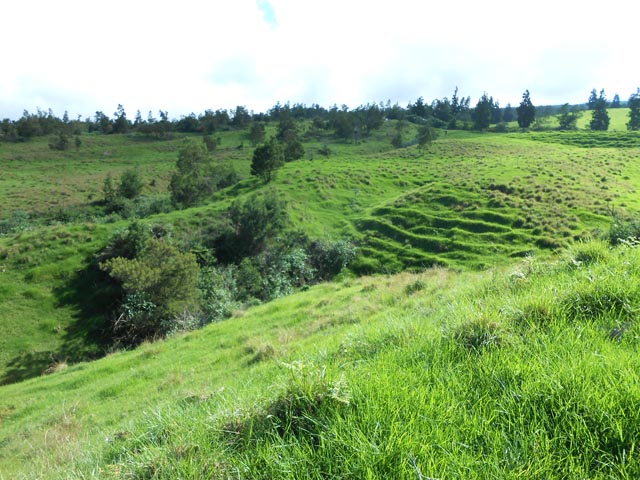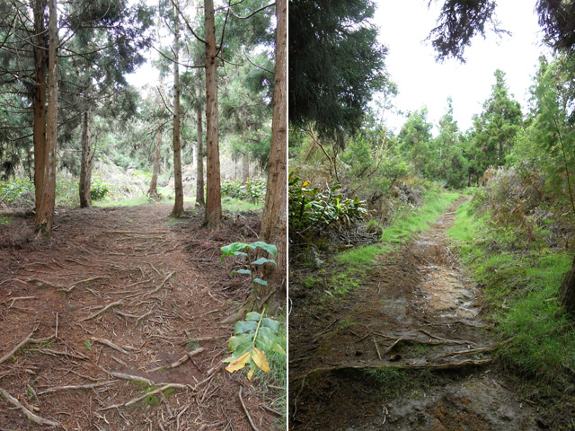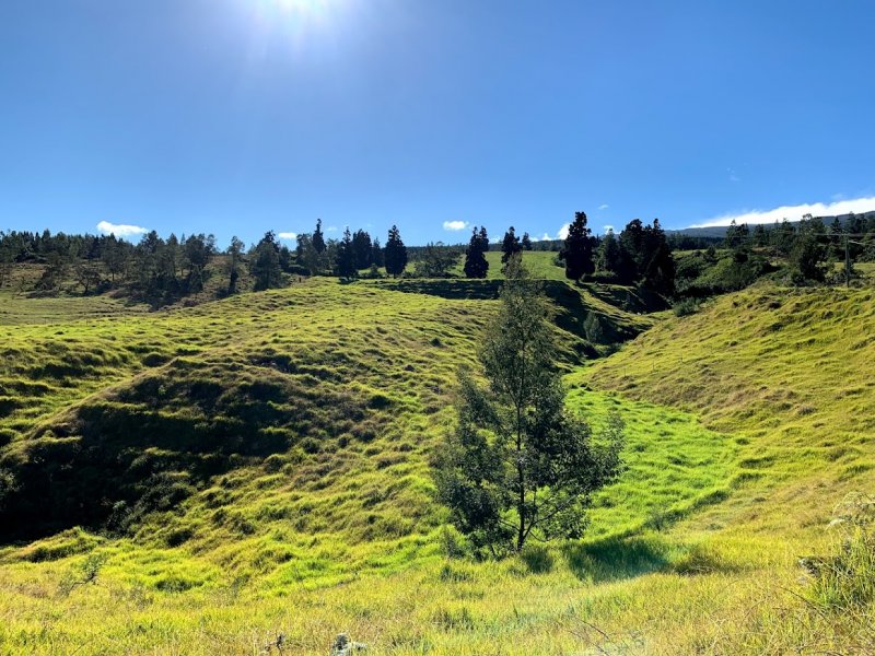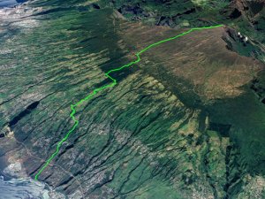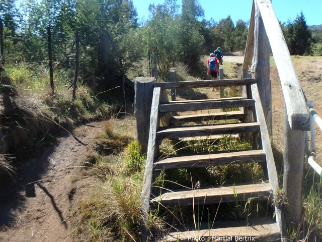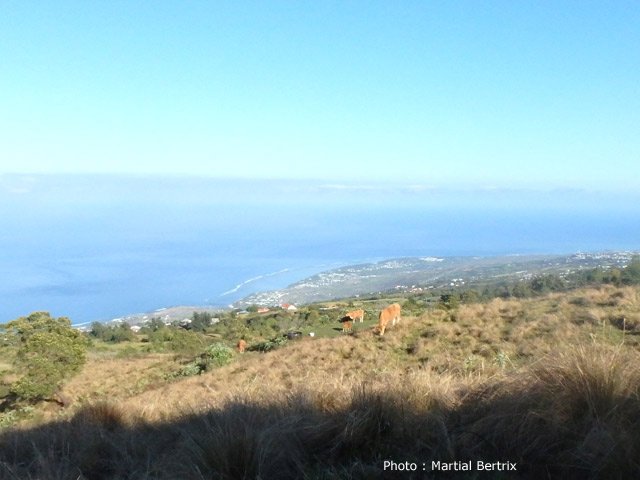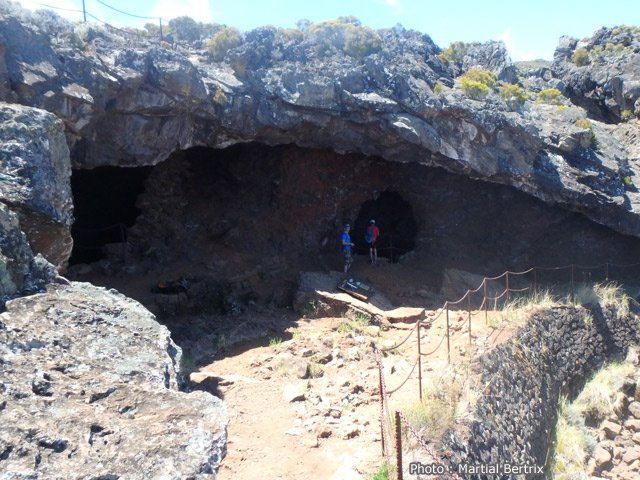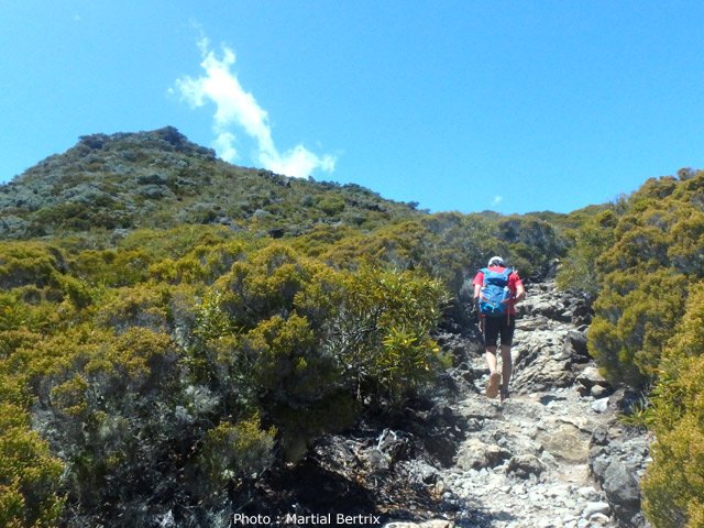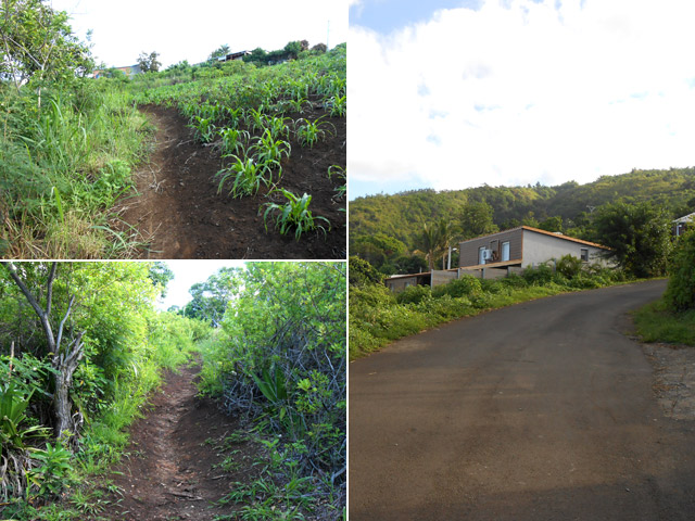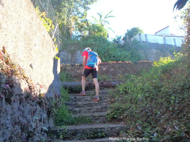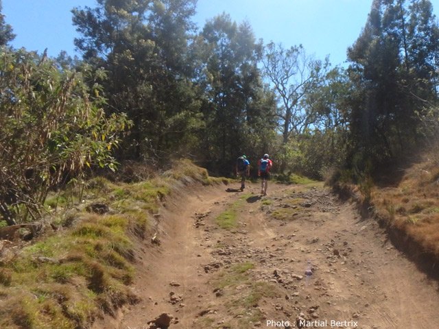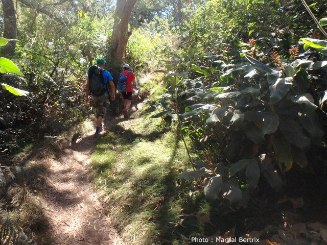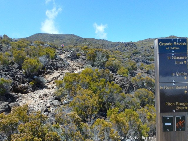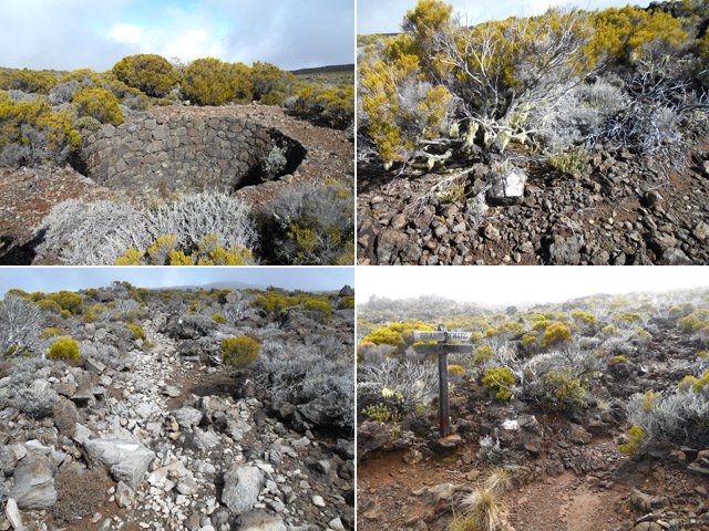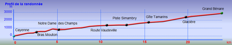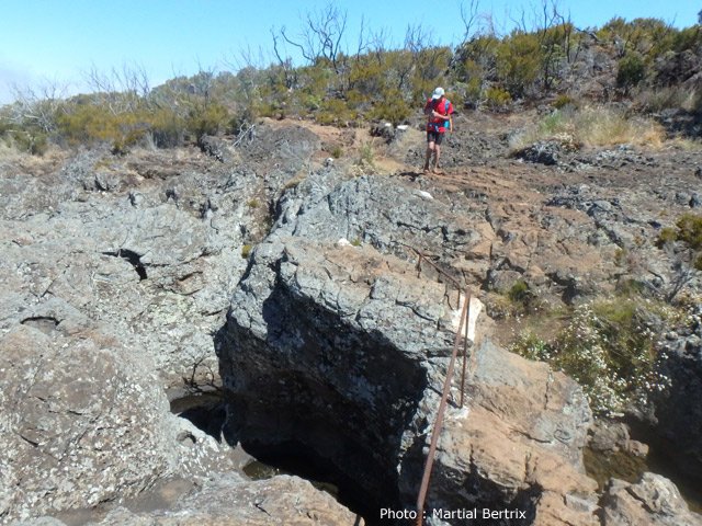 La randonnée débute à Saint-Leu, au lieu-dit Cayenne qui est un charmant village traversé par un escalier en forte pente qui est la seule rue utilisée par les habitants. Sortir de cet escalier principal amène directement en propriété privée. Dès la fin des maisons, le sentier étroit, caillouteux, parfois pavé et bordé de plantes sèches ou d'épineux permet de partir en direction de la route des Tamarins (Photo 1). Un peu d'ombre est donnée par quelques rares tamarins. Le terrain est sec, herbeux, encombré d'épineux auxquels il vaut mieux ne pas se frotter (Photo 2). Le passage est facile sous le pont qui enjambe le Bras Mouton. On retrouve des escaliers métalliques après le passage et on rejoint rapidement une passerelle en bois d'où partent deux sentiers. Prendre celui qui oblique légèrement sur la gauche et rejoint sans grandes difficultés les champs qui bordent Bras Mouton après avoir traversé des zones anciennement habitées comme le montrent les vieilles cases abandonnées et en ruine ou les manguiers. Trente minutes après la Route des Tamarins, le sentier se termine en longeant un champ qui pourrait laisser croire que le lieu est privé mais il n'en est rien (Photo 3). On peut d'ailleurs rencontrer le propriétaire en train de défricher et discuter avec lui de la case plus bas qui lui appartient. Il faut alors emprunter des parties goudronnées du Chemin des Cyprès, Chemin des Badamiers et Chemin des Roses des Bois pour retrouver la RD13 qui traverse le village de Bras Mouton. Guetter les raccourcis qui peuvent faire gagner une minute mais pas de répit pour les jambes (Photo 4). Prendre à gauche sur une courte distance pour emprunter à droite le Chemin Mutel qui passe près de l'école du village et d'une réserve d'eau. Près de la réserve débute un sentier qu'on ne quittera que beaucoup plus haut vers Notre Dame des Champs. Il effleure les lacets de la route et permet de gagner un kilométrage important sans de trop fortes montées. On évite ainsi une dizaine de lacets parfois très longs. On arrive plus loin à quelques cases discrètes dans la végétation. Le sentier est ici assez glissant le long des clôtures (Photo 6). Il se transforme en piste pavée de courte distance avant de se poursuivre sur le Chemin des Goyaviers. Aux premières cases, alterner escaliers et très fortes pentes qui cheminent entre les cases pour rejoindre la Route Hubert Delisle. La pente est si forte par moments qu'on doit se pencher vers l'avant. On peut emprunter le Chemin des Corbeilles afin de ne pas suivre la RD3 sinon profiter des panoramas sur le lagon (Photo 7) et souffler un peu sur le trottoir de la D3 qui chemine à plat dans le village de Notre Dame des Champs en direction des Colimaçons les Hauts. On est à 850 m et il en reste encore 2000 à monter pour voir Cilaos ! Après la Ravine des Colimaçons, prendre à droite le Chemin Augustin Bourdon qui rejoint en une dizaine de lacets un énorme réservoir d'eau sur la gauche de la route. Prendre à droite la route qui ne cessera de monter jusqu'à la Route Vaudeville. Cette route est un pur bonheur au milieu de la campagne ponctuée de quelques fermes. Elle est bordée de prairies du début jusqu'à la fin et permet même de très beaux points de vue sur l'Océan et la Saline (Photo 8). Elle est constitué de deux très longues bandes de roulement bétonnées la rendant un peu sauvage lorsqu'elle n'est pas tondue (Photo 9). Il y a peu de circulation et c'est l'endroit idéal pour y faire du vélo ou y marcher en famille tout en profitant des troupeaux ou des vues sur l'océan. On quitte cette charmante route après la dernière ferme avant le Parc National et la Route Vaudeville. On arrive à une belle aire de pique-nique ombragée, étalée sous de grands cryptomerias. La route Vaudeville, qu'on emprunte vers la gauche, est étroite et permet une belle portion reposante entre les parcelles plantées de cryptomerias (Photo 10). La longer jusqu'à une nouvelle aire de pique-nique. Ne pas dépasser l'aire ni la petite route qui mène à la ferme de gauche et pénétrer sur la Piste Simambry qui permet de rejoindre la Route Forestière des Tamarins sans avoir à passer par le Crédit Foncier et la Ligne de la Grande Ravine (Photo 12). Longer la piste sur toute sa longueur ou prendre le sentier VTT si personne ne l'utilise. Les deux sont parallèles ou se croisent par moments (Photo 13). On sait que les Vététistes n'aiment pas voir des randonneurs sur leurs circuits alors que les randonneurs sont toujours accompagnés par des traces de pneus sur toute l'île ! La végétation, constituée de cryptomerias au début est remplacée plus haut par des tamarins brûlés par plusieurs incendies. Hélas, la région ne sera jamais plus comme avant car les bringeliers, fougères et surtout acacias ont largement dominé le terrain sur lequel les rares tamarins encore en vie ne tarderont pas à être étouffés (Photo 15). Plus on monte et plus la piste est large et défoncée en raison des années d'extraction du bois depuis les incendies (Photo 16). On arrive enfin à la Route Forestière des Tamarins pour un nouveau petit tronçon à plat jusqu'au départ du sentier Vaudeville et du Grand Bénare (Photo 17). Plusieurs petits ponts enjambent des ravines aux fonds basaltiques. Elles sont toutes des affluents de la Grande Ravine. Elles peuvent représenter un beau spectacle quand elles sont en eau (Photo 18). Après une nouvelle pause proche du gîte des Tamarins, entamer la longue montée vers la Glacière. On ne décrit plus cet itinéraire classique des Hauts du Tévelave qui est très fréquentés toute l'année. La végétation disparaît au fur et à mesure de la montée et les crevasses, grottes et cavités sont de plus en plus nombreuses. Le sol est le plus souvent terreux ou rocailleux, comporte de hautes marches et un passage protégé pour franchir la Grande Ravine (Photo 21). A quelques centaines de mètres