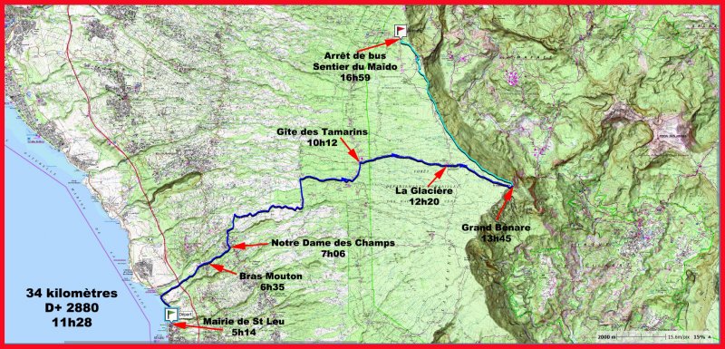 Gagner Saint-Leu puis le village de Cayenne un peu plus au nord - Garer le véhicule ou se faire déposer au parking pour bus en bas du village - Prendre l'escalier qui traverse Cayenne et suivre le sentier qui passe sous la route des Tamarins - Poursuivre à gauche du pont en bois près de la voie rapide pour arriver à Bras Mouton - Remonter le Chemin des Cyprès, le Chemin des Badamiers puis le Chemin des Roses de Bois - Traverser la D13 puis marcher une cinquantaine de mètres sur la gauche pour emprunter le Chemin Mutel - Passer devant l'école et des petits terrains de sport puis arriver à un grand réservoir - Trouver le sentier qui va monter en direction de Notre Dame des Champs en effleurant chaque lacet de la route qui se termine également à Notre Dame des Champs - Le sentier se transforme en courte piste avant de rejoindre le Chemin des Goyaviers qui se termine en forte pente et escaliers pour rejoindre la Route Hubert Delisle par les Chemins des Muriers et Chemin des Bibasses - Marcher dans Notre Dame des Champs en direction des Colimaçons les Hauts, franchir la Ravine des Colimaçons puis prendre à droite le Chemin Augustin Bourdon - Suivre ce chemin jusqu'à un grand réservoir et prendre la route qui monte vers la droite - Suivre cette magnifique route jusqu'à la Route Vaudeville puis tourner à gauche en direction de la Ferme et de la Ravine Simambry - A l'aire de pique-nique du Fond Simambry, prendre à droite la piste Simambry ou le sentier VTT et rejoindre la Route Forestière des Tamarins - Bifurquer à gauche vers le Gîte des Tamarins - Au gîte, prendre à droite le Sentier Vaudeville puis le Sentier du Grand Bénare jusqu'à la Glacière puis le Grand Bénare. Comme on ne peut séjourner en ce lieu qu'en bivouac, il faut alors poursuivre par le sentier de Bord de Mafate pour regagner le parking du Maïdo.