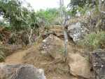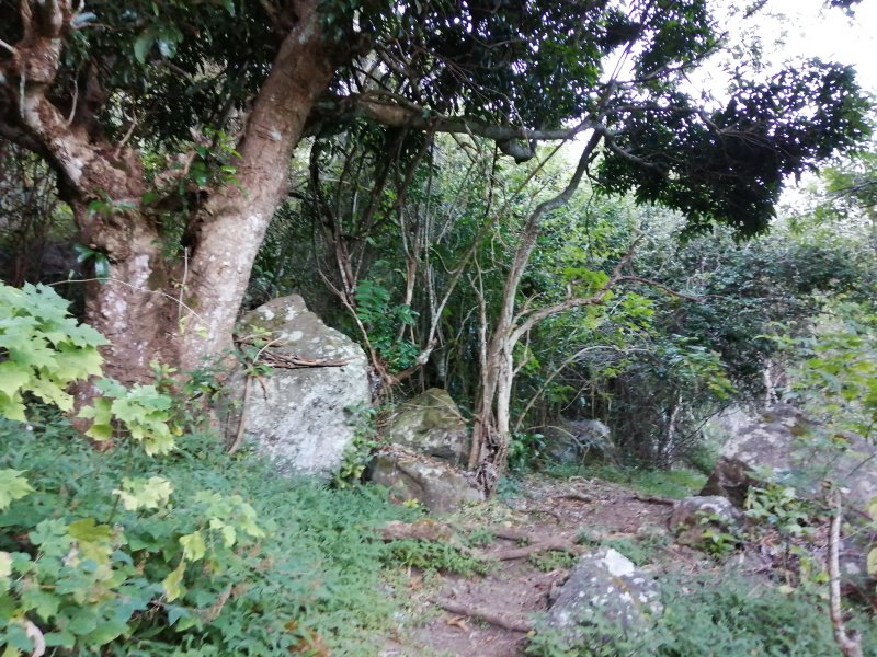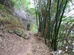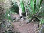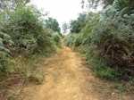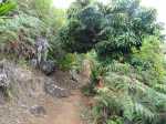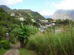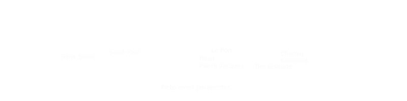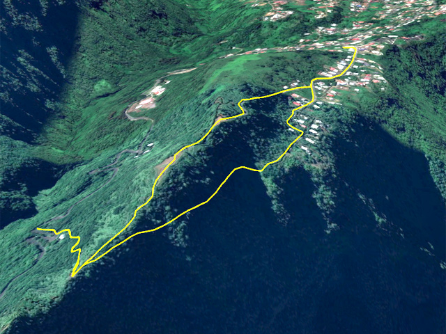 La randonnée débute le long de la route de la Rivière des Galets à Dos d’Âne, à deux pas de l'arrêt de bus Louise Ancelly ou trois minuscules emplacements peuvent permettre de garer un petit véhicule qui ne mordra pas sur la chaussée. La meilleure solution consiste à prendre le bus à la Rivière des Galets et de descendre à l'arrêt Louise Ancelly. Un gros caillou marqué de peinture blanche indique le départ de la courte montée qui rejoint le rempart au-dessus de la Rivière des Galets. Les rochers sont nombreux au milieu des chocas (Photo 1). La montée n'a rien de difficile au milieu des fougères (Photo 2). Le croisement avec le sentier venant du bas comporte une croix sommaire au milieu des chocas (Photo 4). Prendre à gauche pour trouver aussitôt un embranchement de deux sentiers parallèles (Photo 5). L'un part à droite en longeant le rempart, l'autre rejoint l'aire de décollage des parapentes et le Piton de Sucre. Prendre à droite et longer la roche volcanique sur un sentier facile bordé de gros bambous (Photo 6). La pente est faible, la marche facile et le vide est protégé par la végétation (Photo 7). Comme la boucle est courte, prendre le temps d'étudier la différence des couches de lave en fonction de l'intensité des très anciennes éruptions (Photo 8). Le large point de vue qui permettait de profiter de l'ensemble de la Rivière des Galets se couvre de végétation et le fond couvert de galets disparaîtra bientôt (Photo 9). Le sentier reste agréable et rejoint très vite le bas de la route de Dos d'Ane (Photo 10). La Rue Ferdinand Louise monte fortement par endroits. On a de nombreuses vues sur le Piton de Sucre qui domine sur la gauche (Photo 11). Profiter des abords fleuris (Photo 13) ou de cette vieille case en tôle recouverte de chouchous et qui laisse tout de même deviner sa forme originelle (Photo 14). Repérer pour une autre sortie le départ du sentier qui descend à Deux Bras. On parvient assez vite à la petite église qui semble pouvoir contenir des centaines de fidèles (Photo 15). Ne pas hésiter à traverser la D1 et pénétrer dans le village pour le visiter au moins une fois en empruntant rues, ruelles ou raccourcis ou rejoindre un kiosque pour une pause avant de repartir en sens inverse (non prévu sur la carte ci-dessous). Reprendre la rue Ferdinand Louise, passer devant l'église et entamer la descente jusqu'à la piste empruntée par les parapentistes pour rejoindre leur aire de décollage. En se retournant dans la montée, on remarque que le village de Dos d’Âne est assez pentu. Il tiendrait son nom de la colline en forme de dos d'âne qui le domine (Photo 16). Sur la gauche, on remarque très bien la longue saignée de la Canalisation des Orangers qui part de Sans Souci et rejoint le sentier de l'Îlet des Lataniers à Mafate (Photo 17). D'ailleurs, plus on monte sur la piste bétonnée, plus on voir le cœur de Mafate (Photo 18). Le béton disparaît et la piste devient terreuse et souvent poussiéreuse (Photo 19). Puis elle est à nouveau remplacée par un sentier tout aussi poussiéreux bordé de hautes fougères (Photo 20). Sur la droite, plusieurs sentiers pénètrent sur un circuit d'entraînement des motards. On atteint enfin l'aire de décollage d'où l'on bénéficie de larges panoramas de Saint-Paul jusqu'au Port (Photo 21) ou sur la route de la Rivière des Galets (Photo 22). On devine dans la verdure les quelques maisons bordant le Chemin Ratinaud (Photo 23). Sur la gauche de l'aire débute un sentier qui se met très vite à plonger dans le sous-bois (Photo 24). Cette partie est rocheuse, comporte de très hautes marches et demande plus d'attention avec les enfants (Photo 25). On retrouve, comme au départ, quelques hauts rochers au milieu des chocas (Photo 26). On rejoint enfin le croisement des sentiers parallèles emprunté au départ (Photo 28). Si on ne poursuit pas vers la Rivière des Galets par le Sentier de Bord, il ne reste plus qu'à bifurquer à droite et retrouver le véhicule après la courte descente.