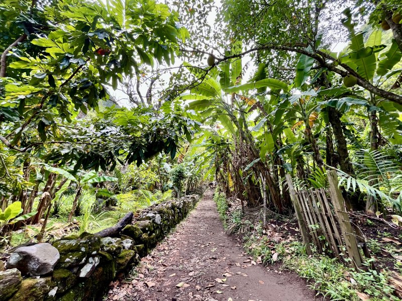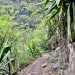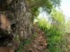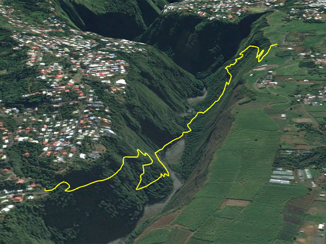 La randonnée débute au Dassy, à un parking si petit qu'il ne peut contenir que trois voitures alors qu'il y en a en permanence une vingtaine garée le long de la route. C'est en effet un lieu de rendez-vous incontournable pour les sportifs de la région du Tampon qui ont ici la certitude de faire du sport sur un sentier ouvert toute l'année. Un parking privé en amont du départ évite de trop chercher en cas d'arrivée tardive. Le passage a été longtemps interdit car la passerelle commençait à montrer quelques signes de faiblesse au niveau du plancher en bois, ce qui n'empêchait nullement les gens d'y passer. Depuis quelques mois (2024) quelques plancher vermoulues et recouvertes de contreplaqué annoncent probablement une fermeture prochaine pour remise en état. Le sentier longe tout d'abord un champ de canne puis bifurque à angle droit vers le rempart. On profite des dents de scie du Dimitile et du Grand Bénare à l'horizon (Photo 1). On remarque également les gorges vers l'amont mais elles ne sont pas encore impressionnantes (Photo 4). Pour les apprécier, il faudra se mouiller les pieds puis remonter le torrent sur quelques centaines de mètres. Le sentier débute sur un lit de cailloux qui longe une barre rocheuse (Photo 5) puis plonge vers la rivière qu'on entend déjà couler. Il est parfois caillouteux et comporte quelques marches assez hautes mais devient de plus en plus praticable au fur et à mesure de la descente (Photo 6). Il longe une falaise abrupte qui perd de temps en temps quelques cailloux, mais est pourtant sans danger. On profite de vues sur la vallée du Bras de la Plaine et les remparts en face vers l'Entre-Deux. On poursuit, toujours en descente jusqu'aux premiers manguiers. Il comporte des lacets rehaussés par de véritables murailles et de belles portions pavées. La descente se termine à l'Ilet Crescent, hélas abandonné même si certaines portions semblent être défrichées régulièrement (Photo 8). Cette zone comporte un beau sentier bordé de murailles sèches et d'arbres fruitiers, vestiges des vergers "lontan" (Photo 9). Peu après ces cultures, on remarque plusieurs sentiers qui rejoignent les berges du bras que l'on domine de quelques mètres (Photo 10). Descendre et marcher sur les berges pour repérer le passage lors d'une future remontée de la rivière ou se reposer au bord de la rivière. En s'éloignant un peu, on a une vue globale sur la passerelle (Photo 12). Remonter en empruntant un autre sentier puis se rapprocher de l'ouvrage (Photo 13). On franchit la passerelle sans appréhension tout en profitant des vues sur la rivière, tant vers l'amont que vers l'aval (Photo 14). On attaque la montée vers l'Entre-Deux par de nouveaux lacets donnant sur la rivière. Le sentier est large et comporte quelques marches au départ qui disparaîtront très vite (Photo 17). On y retrouve les inévitables cailloux et plaques basaltiques, petites falaises et à-pics vers le Bras de la Plaine dont certains sont protégés de rambardes. La montée est plus courte que la descente terminée il y a quelques minutes. On rejoint ainsi rapidement le village après avoir franchi une dernière petite passerelle en bois. Un point d'eau se situe en bordure de route à la fin du sentier. On peut, à partir de ce point, effectuer plusieurs randonnées dont celle toute proche du Bassin Sassa ou, plus sportif, le tour du village de l'Entre-Deux. Il suffit ensuite de retourner sur ses pas pour terminer cet aller-retour de détente. Au retour, après avoir franchi à nouveau la passerelle, il est possible d'effectuer une visite à l'arche naturelle, située quelques centaines de mètres plus en amont, avant de reprendre la montée vers le Dassy.