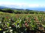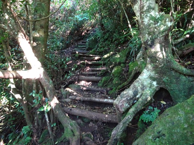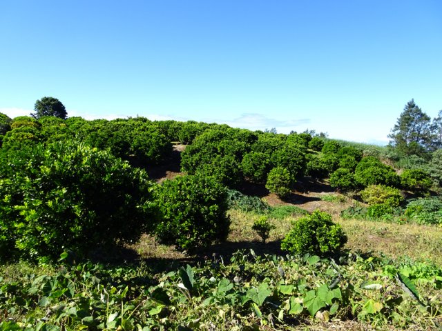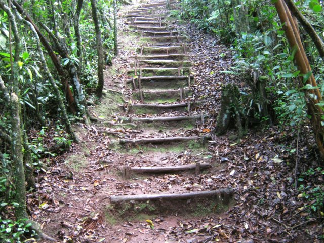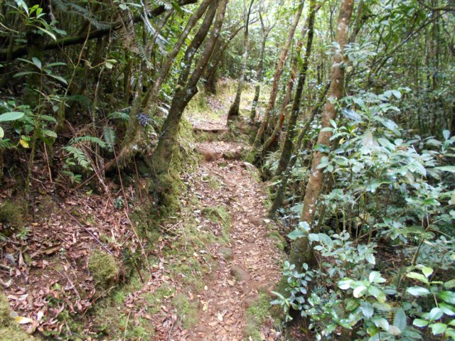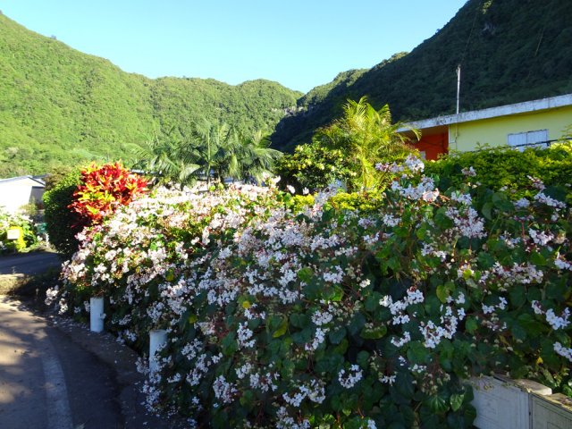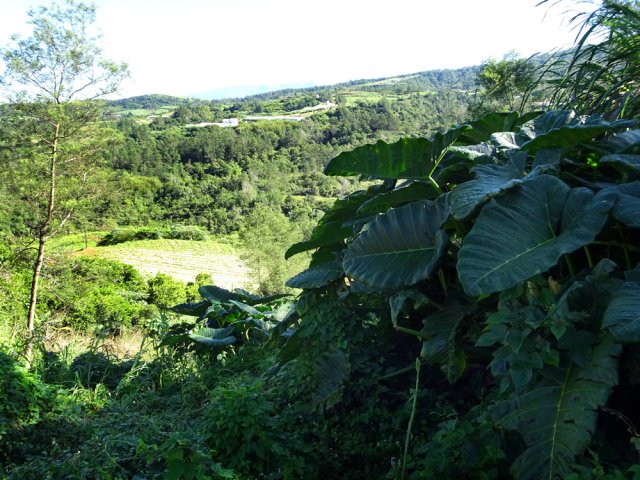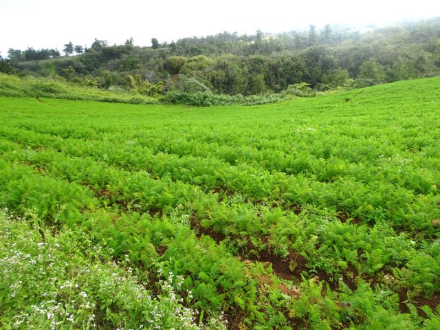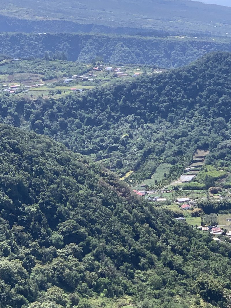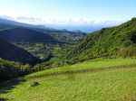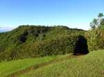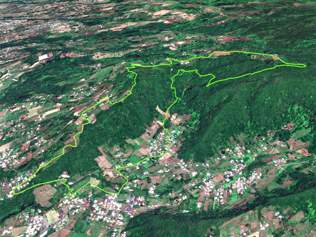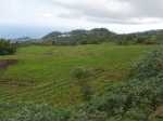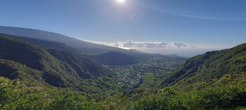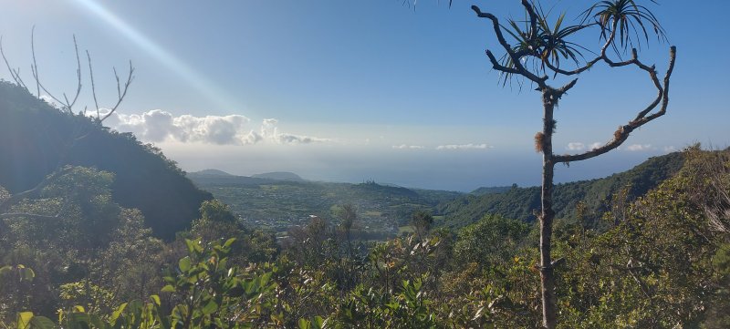 La randonnée débute ici à la fin du Chemin de la Forêt, une route sans issue qui débute au hameau de Bassin Joséphine (voir § ci-dessous). Elle peut tout aussi bien commencer à n'importe quel endroit du circuit puisqu'il emprunte plusieurs longues portions de bitume, à condition d'avoir la carte en main ou de connaître la région de la Plaine des Grègues. Débuter par la piste qui prolonge la route en cul de sac et délaisser celle qui continue vers le Piton du Rond. Prendre vers la droite une portion du Sentier des Margosiers, mais contrairement à la fiche proposée, la marche est beaucoup plus facile puisqu'elle aborde en descente le tronçon le plus pentu de ce circuit. Le cheminement est très agréable au début dans les bois de couleurs ou goyaviers moussus sur un sol plat recouvert de feuilles ou de racines (Photo 1). Plus loin, le sol glaiseux et rouge, assez glissant s'il est humide, serpente dans le sous-bois (Photo 2). Quelques bois de couleurs résistent encore à l'invasion des goyaviers (Photo 3). La marche à plat ne dure pas car le sentier se dirige vers un rein entre deux ravines et se met à descendre fortement sur des dizaines de marches en rondins sur un sol le plus souvent humide (Photo 4). Il effectue également quelques dents de scie sur le même type de sentier jusqu'aux premiers croisements. Le premier file à droite vers les vergers de Bassin Joséphine, emprunte une petite route et se termine à la route principale après quelques serres. Celui de gauche mène à la Plaine des Grègues. Avant de l'emprunter, il est conseillé de poursuivre une cinquantaine de mètres jusqu'à l'aire de décollage des parapentistes (Photo 5). Le sentier s'enfonce ensuite dans les goyaviers pour rejoindre le Piton de la Ligne des Mille. C'est de cette aire qu'on a les meilleurs points de vue sur la Plaine des Grègues (Photo 6). Le regard porte jusqu'au Piton de Langevin et un peu plus loin celui de Vincendo. Faire demi-tour et partir à droite sur des marches taillées dans la terre ou sur un sentier glissant sur une pente encore très raisonnable. La plongée commence sans transition à travers les bois de couleurs sur de très hautes marches (Photo 7). Les marches succèdent aux marches et le freinage s'effectue en prenant en main les bois de goyaviers sur le bord du sentier. La très forte descente utilise beaucoup de marches, de racines et parfois de pierres. On ne rencontre qu'une seule courte partie plate de moins de 20 mètres qui est salutaire lors de la remontée de ce sentier très connu dans la région pour sa difficulté (Photo 8). La plongée reprend, tout aussi difficile sur de vieilles marches en rondins et beaucoup plus de pierres (Photo 9). La pente s'adoucit après quelques pierriers, devient plus humide, se transforme en piste sous les ramures qui assombrissent le parcours. La lumière arrive aux premiers champs traversés par la piste devenue plus large. Les cultures ont tendance à diminuer et à se transformer en friches. Il reste cependant quelques champs de canne à sucre. La jonction avec le gué sur le Grand Bras Rouge est rapide et la traversée facile (Photo 10). On rencontre les premiers champs de curcuma qu'on ne quittera qu'au Chemin du Panorama (Photo 11). La piste se termine au village en frôlant quelques fermes d'élevage odorantes ! Le but désormais consiste à rejoindre le Chemin du Versant par le trajet le plus court. Le village de la Plaine des Grègues est tellement agréable qu'on peut même le rejoindre par le trajet le plus long pour flâner entre les cases et jardins fleuris (Photo 12). Les rues étroites, verdoyantes, comportent peu de circulation et la marche y est très agréable (Photo 13). Sur la gauche, le rempart du Rond et son aire de pique-nique sous les cryptomerias attirent l'attention (Photo 14). Le circuit proposé ici emprunte le Chemin Conflore mais un détour vers la petite église ne prend qu'une minute (Photo 15). Débuter la montée par le Chemin de Bel-Air en traversant de nouveaux champs de curcuma (Photo 16). Le village n'est pas pour rien la capitale de cette épice renommée en cuisine comme en pharmacopée. Après un virage serré vers la gauche, on se retrouve sur le Chemin du Versant. Il longe l'autre versant de la colline en offrant de beaux points de vue sur le village qu'on vient de traverser (Photo 17). Quelques habitations bordent cette route étroite en forte montée qui coupe un peu le souffle puis arrivent à nouveau les champs qui occupent les pentes (Photo 19). Mais ce sont surtout les champs de curcuma ou gingembre qu'on remarque le plus (Photo 20). Il y en a partout, de toutes les tailles et de toutes les couleurs. Après avoir frôlé une antenne sur la gauche, on parvient au Chemin du Panorama offrant des vues sur la Petite Île (Photo 21). A Bel-Air, ce sont des fermes et prairies qu'on peut apercevoir sur la gauche (Photo 22). Plus loin, la pente cesse. La route domine la vallée de la Ravine de Manapany. Les terrains sont soit en friche, soit couverts de chouchous et l'on devine les premiers vergers de tangors (Photo 23). De nouvelles étendues de cultures maraichères occupent les champs avant d'arriver à un vaste domaine abritant des chevaux (Photo 24). Poursuivre sur le Chemin de la Forêt en direction du croisement de Bassin Joséphine. Dans la dernière descente, c'est le Piton du Rond qui domine avec le Morne Langevin en toile de fond (Photo 25). On trouve encore quelques champs avant de parvenir à des serres (Photo 26). Au croisement, prendre à droite en direction du véhicule laissé au bout de la route. Cette petite route étroite offre une multitude de panoramas et traverse des champs et friches (Photo 27). Les agrumes semblent se plaire à 1000 m d'altitude car on en voit de tous côtés (Photo 28). On rejoint très vite, malgré la pente, la fin de la route d'où on est parti il y a un peu plus de trois heures.