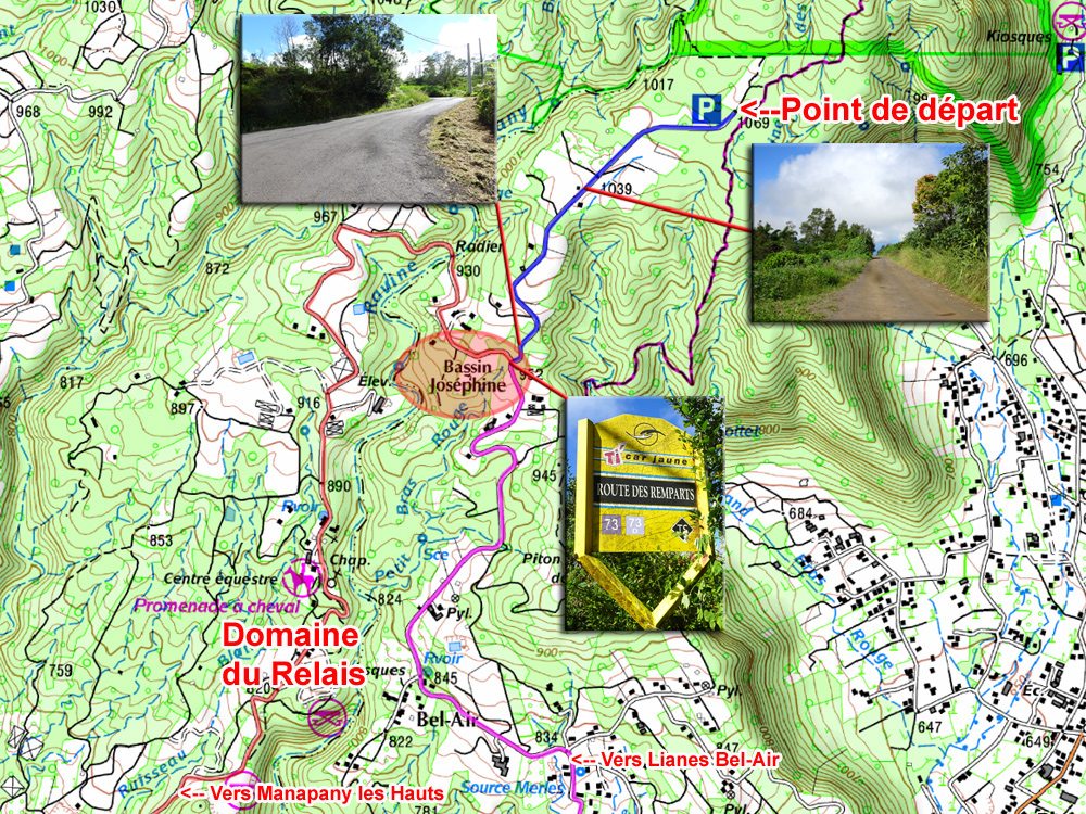 - En venant de Saint-Joseph, rouler en direction de Manapany les Hauts sur la D3 et tourner à droite sur la Rue de Bel Air, 300 m avant la Ravine de Manapany. Poursuivre sur le Chemin de la Forêt, (trait mauve) jusqu'aux maisons de Bassin Joséphine puis jusqu'au départ du sentier en partant sur la droite après l'arrêt de bus (trait bleu).