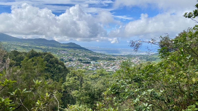 Se rendre aux Makes depuis Saint-Louis et rouler jusqu'au village - A l'église, tourner à gauche dans la rue de Bon Accueil - Continuer et bifurquer à droite sur le Chemin des Arums (ou Arômes selon la carte) - Rouler jusqu'au bout de la route et stationner à droite - Débuter par le sentier d'interprétation sud et repartir par le sentier nord pour revenir au croisement de départ - Prendre à gauche le sentier vers le point de vue - Poursuivre sur le sentier unique à cet endroit - Redescendre vers les Makes par le sentier en rive gauche de la Ravine de Bellevue - Rejoindre le Sentier du Malabar Mort puis la piste près des réservoirs d'eau - Remonter la piste jusqu'au sentier qui coupe la Ravine du Mouchoir Gris puis redescendre au point de départ par le sentier emprunté en début de montée.