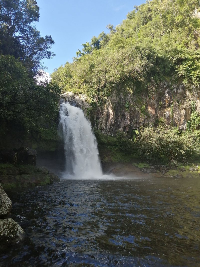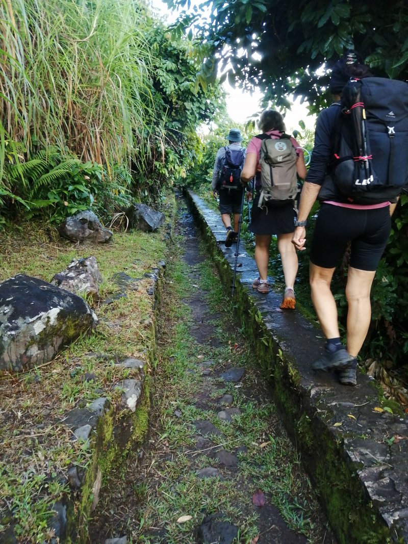 La randonnée débute à l'aire de pique-nique de la Rivière du Mât située au plus près des berges. Un sentier débute à la fin d'une longue "prairie" qui borde un mur d'enceinte de l'usine de plastique du village qui fabrique essentiellement de la tuyauterie pour le bâtiment. On la voit très bien lors de la descente vertigineuse en fin de parcours. Ce sentier est plat, agréable et de bonne qualité (Photo 2). Il longe la rivière et emprunte plusieurs fois le fond ou la murette d'un ancien canal de transport de l'eau (Photo 3 & 4). Il pénètre au niveau du Bras des Lianes dans une belle forêt de bois de couleurs. On rencontre parfois de petites montées pourvues de hautes marches humides. Un sentier vers la droite permet de rejoindre après quelques efforts le bas d'un bassin alimenté par une petite cascade et décrit dans le circuit familial. Quelques montées sous les bambous, puis sous les bois de couleurs et enfin sous de gros manguiers amènent à un nouveau croisement. Prendre à droite et suivre un sentier nouvellement créé qui dirige vers le pied de la Cascade de la Mer. Cette grosse chute (Photo 9) se jette dans un grand bassin d'eau qui paraît très sombre et incite peu à une trempette. Belle occasion d'une courte halte pour se restaurer en vue des nouvelles montées à venir. Après avoir profité du bassin, reprendre le chemin inverse jusqu'aux manguiers puis bifurquer à droite pour la suite de la boucle. De nouvelles volées de marches parfois hautes amènent à une piste qui vient de Bellevue et plonge vers la rivière. La suivre sur quelques mètres vers le Bras des Lianes et obliquer aussitôt sur le sentier qu'on remarque sur la gauche. Il replonge dans la forêt de bois de couleurs, passe quelques petites ravines presque à sec et rejoint plus tard le Bassin des Aigrettes. Ce nouveau bassin, aussi grand que le précédent, est alimenté par une cascade qui tombe en trois paliers (Photo 13) en surgissant de rochers rendus lisses par l'érosion. Les rochers sont tout aussi lisses à la sortie du bassin. Ne pas quitter les lieux sans avoir repéré cette étrange trouée dans le rocher due à l'érosion d'une marmite (Photo 15). Attention tout de même pour l'approcher car le courant est très fort à cet endroit et un faux pas pourrait vite gâcher la journée. Il faut, pour continuer, reprendre le sentier en sens inverse et marcher jusqu'à la piste. C'en est fini avec le bruit de l'eau et les éclaboussures des cascades. Commence la partie qui donnera droit à de très beaux paysages, essentiellement sur le Cirque de Salazie et la Rivière du Mât qu'on domine d'une centaine de mètres. La piste, très bien entretenue (Photo 20), monte en pente faible pour se transformer, moins d'un km plus loin en sentier de très bonne qualité. Comme dans le bas il monte et redescend souvent au gré du relief ou des champs, cultures ou vergers de Bellevue. Il s'arrête d'un seul coup en bordure de rempart pour obliquer à angle droit et traverser le champ de canne pour rejoindre la route étroite de Bellevue. Suivre cette route par la gauche, passer quelques habitations et prendre le premier croisement sur la gauche. Une piste monte en pente raide et une autre herbue part sur la droite. C'est celle de droite qu'il faut emprunter pour retrouver très vite le sentier qui passe également par quelques dents de scie pour enfin plonger vers la Rivière du Mât (village et rivière) qu'on domine (Photo 22). Les marches hautes sont parfois tellement abruptes qu'on apprécie la main courant qui a été installée. On rejoint enfin le sentier pris à l'aller pour retrouver en deux minutes le parking.