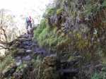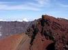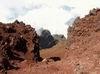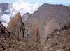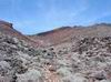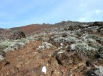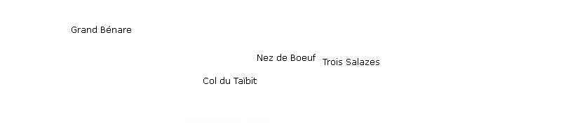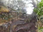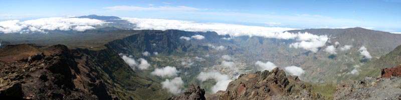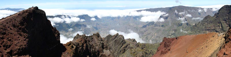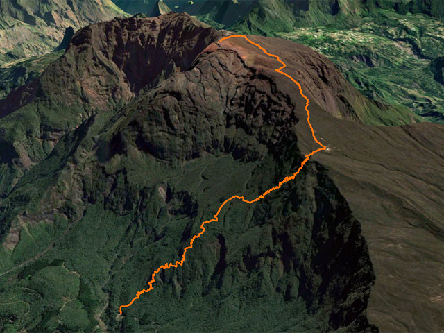 Elle est constituée de dizaines de lacets courts et abrupt très souvent recouverts de cailloux (Photo 11). Heureusement, des portions très bien aménagées par des marches en planches ou des échelles permettent de franchir certains obstacles plus facilement. Cette zone est le domaine des grands branles verts, recouverts de barbes de Jupiter (Usnea barbata), dans lesquels chantent les merles pays (Photo 13). Après une interminable série de lacets et un grand oratoire sur la droite annonçant la proximité du col, on rencontre au sommet le sentier de droite qui vient de Bourg Murat. Une petite halte au sommet permet de voir le chemin parcouru en jetant un regard vers Cilaos (Photo 15). On voit également très bien le gîte qui peut constituer une agréable étape rafraichissante s'il est ouvert. Mais le clou du spectacle se situe sur la gauche. Le Piton des Neiges qui semble encore assez loin donne une bonne idée de la pente qu'il faudra encore grimper pour l'atteindre (Photo 11). Après cette longue montée, le sentier qui permet de rejoindre le gîte donne l'impression d'une promenade sur de gros cailloux. Ne pas manquer une petite visite à la caverne Dufour qui a donné son nom au gîte (Photo 17). C'est la fin d'un tunnel de lave bouché qui n'offre que quelques mètres abrités. Attention de ne pas se cogner au plafond en relief très dur. Après avoir passé les bâtiments au toit vert clair, c'est une montée régulière qui amène en une heure au sommet dans une végétation de plus en plus clairsemée et de plus en plus rabougrie en raison des climats frais qui règnent ici une bonne partie de l'année (Photo 18). La première moitié est assez désagréable car il faut sauter de bloc en bloc en suivant les traces de peinture blanche disposées régulièrement pour guider en cas de brouillard. Après le passage d'un talweg qui n'est autre que le début de la Rivière du Mât (Photo 19), les cailloux disparaissent et font place à des gravillons ou de la terre moins stable. La végétation disparaît presque totalement et la dernière partie s'effectue avec, en ligne de mire, le sommet ou la station météo. Une fois au sommet de la Réunion, le panorama depuis ce point (Photo 20) ne se décrit pas, il se mérite et il faut absolument aller le voir de plus près. L'oxyde de fer dans les laves anciennes a donné au sol une teinte tirant sur le rouge abrupts (Photo 21). Certains endroits déchiquetés et très sauvages donnent envie de descendre pour s'en approcher. Attention cependant aux glissades qui pourraient se finir inévitablement dans des précipices de plusieurs centaines de mètres de profondeur abrupts (Photo 22). Le sommet se remarque plus facilement si l'on s'en éloigne abrupts (Photo 23). C'est principalement à cet endroit que les lève-tôt se précipitent pour arriver avant le lever du soleil, une attraction incontournable très prisée des randonneurs ayant tout de même un bon entraînement. On peut même y passer la nuit dans de minuscules enclos à taille humaine destinés à couper des vents froids (Photo 24). Quand le vent est violent et froid, il semble être encore plus froid et violent une fois comprimé entre les pierres nues. Pour un bivouac, ne pas oublier une toile ou mieux, la tente individuelle. C'est tout de même le gîte qui doit être privilégié, ne serait-ce que pour le lit bien chaud et le cari. Une fois l'ascension terminée, il faut penser à la descente vers Cilaos qui représente pour beaucoup une nouvelle difficulté qui met à mal les genoux.