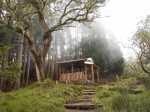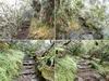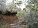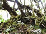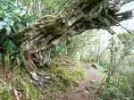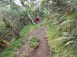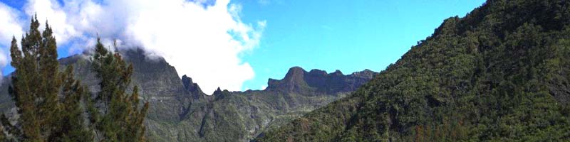 La randonnée débute au lieu-dit Le Bloc qui comporte un arrêt de bus et plusieurs places de parking sous les grand bois de cryptomerias. La solution des transports en commun est souvent la meilleure option en cas de "visite" des véhicules durant la nuit lorsque les randonneurs partent pour plusieurs jours. La montée au Gîte de la Caverne Dufour est immédiate et ne cessera qu'au sommet du rempart. On rencontre tous les types de sentiers de la région avec la terre, la boue, les marches en pierre ou en bois ou quelques échelles. Les faux-plats sont très rares et ne permettent pas de se reposer (Photo 2). Les points de vue sur le cirque sont également assez rares (Photo 5) mais un belvédère en bois aménagé spécialement permet de voir la ville si le brouillard n'est pas de la partie. Sachant que la montée est longue et pénible, chacun prend le rythme qui lui convient. A mi-parcours, le sol est moins pentu car on se retrouve sur le Plateau du Petit Matarum. Une halte est possible sous un abri situé près d'une source rafraîchissante, de quelques tamarins ou cryptomerias (Photo 10). Si on avait bien monté jusqu'alors et que les jambes chauffaient avant le plateau, il faut se préparer à une pente beaucoup plus forte à partir de la Ravine des Prunes. Repérer, en début de grimpée, près de cette petite ravine, les nombreux pieds de noisetiers, un arbuste très rare à la Réunion, sans doute importé à l'époque de la plantation des chênes qu'on retrouve autour du Bloc et de la Roche Merveilleuse. La deuxième partie peut débuter.