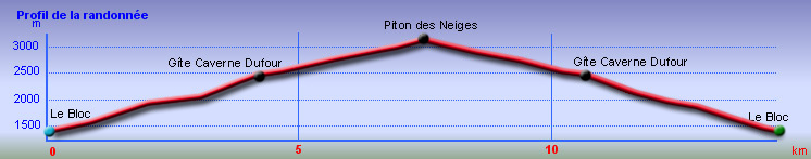 Le Piton des Neiges est le point culminant de l'Océan Indien avec ses 3070 m d'altitude. Voilà sans doute pourquoi il est autant visité ; ce n'est pas tous les jours qu'on peut avoir les yeux à 3071,78 m pour un randonneur de taille normale. Le nombre de personnes qui dorment chaque soir au Gîte de la Caverne Dufour, celles que l'on croise dans la montée ou dans la descente ou le nombre de connexions sur cette page montrent bien l'engouement des marcheurs pour ce piton légendaire qui a perdu 1000 mètres lors de l'effondrement de son cratère et la formation des cirques alentour. Mais la raison principale est son accessibilité qui met cette sortie d'altitude au même niveau que de nombreux autres parcours de l'île. Le sommet s'atteint en 4 heures (pour les marcheurs entraînés) et la randonnée peut sans problème se dérouler en une journée si l'on part assez tôt du Bloc situé à 1380 m. L'ascension est sérieuse dans les lacets de la Découverte, difficile du refuge au Gîte de la Caverne Dufour mais le plus fatigant est la marche sur les énormes blocs de lave situés après le gîte avant d'affronter les lapillis menant au sommet : gare aux glissades en arrière par temps sec. Privilégier les jours de beau temps prévus par la météo car on ne fait pas mieux comme point de vue à plusieurs milliers de km à la ronde et on regrette amèrement l'arrivée des nuages si l'on a traîné au lit avant de partir. Ce point de vue de 360° mériterait d'ailleurs une discrète table d'orientation pour au moins désigner les principaux pitons visibles à l'horizon. Si tout le monde peut reconnaître au premier coup d’œil la Fournaise à l'Est ou le Grand Bénare à quelques encablures, peu peuvent désigner avec certitude le Sommet de l'Entre Deux, le Mazerin ou le Bé Massoune. Ceux qui n'aiment pas courir dès le soleil levé, partiront la veille, dormiront au Gîte de la Caverne Dufour pour être à l'aube au sommet et admirer le lever du soleil.