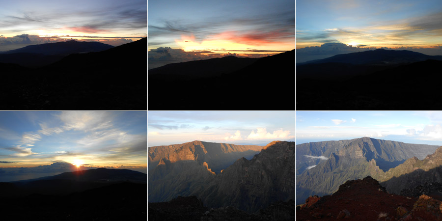 C'est un incontournable que même les marcheurs occasionnels veulent faire. Les plus sportifs s'élancent du Bloc vers minuit et arrivent au sommet de nuit. Les autres partent la veille et se contentent de rejoindre le gîte de la Caverne Dufour. Après un bon repas du soir et une nuit en dortoir, c'est le branle-bas de combat deux heures avant l'heure officielle du lever de l'astre qui varie beaucoup durant l'année. Regarder le bulletin météo de la veille qui donne l'horaire exact. Tout le monde se lève, s'habille chaudement même en été et grimpe au sommet à son rythme. Il est fréquent de rencontrer 50 personnes au sommet qui piétinent d’impatience. Les premières lueurs apparaissent vers la Fournaise. Puis le noir est petit à petit remplacé par du rouge puis du jaune jusqu'à ne plus pouvoir regarder le soleil en face. De l'autre côté, ce sont les crêtes qui se couvrent de couleurs jaunes qui, très vite, sont remplacées par le vert des forêts. Une fois le spectacle terminé, tout le monde descend au gîte où un petit déjeuner attend ceux qui repartiront vers plusieurs destinations.