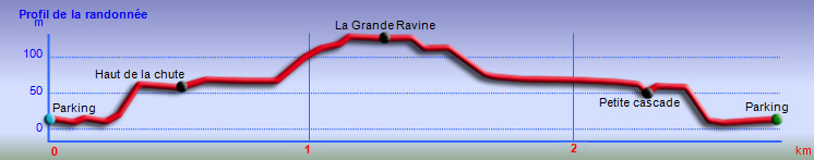 La randonnée débute au pied de la belle chute d'eau et emprunte un très discret sentier qui suit tout d'abord le lit d'un ru, affluent de la Rivière Sainte-Suzanne. Par temps pluvieux, ce sentier est donc très glissant. On retrouve assez vite la terre ferme et une corde à noeuds (Photo 5) pour un petit passage rocheux. Le sentier est très étroit, au-dessus du vide, mais bien visible. Un grillage protège de la chute. On arrive enfin au sommet de la cascade (Photos 4 et 5), près des câbles tendus au-dessus du vide. Il est bien sûr interdit d'y grimper sans harnachement professionnel. Il suffit ensuite de longer la berge sur un beau sentier qui passe sous des bambous ou d'immenses manguiers qui n'ont jamais eu à se plaindre du manque d'eau. Un des sentiers monte directement au village de la Grande Ravine où l'on rejoint la route après avoir longé les cases et passé entre des murs d'enceintes. D'ici, il est possible de remonter vers la Grande Montée, emprunter le radier qui traverse la Rivière Sainte-Suzanne et retourner à la cascade par la Renaissance, rendant ainsi la sortie plus longue et plus aisée. Le circuit ci-dessous reprend le sentier puis bifurque vers la droite dans les bananiers et pieds de vanille pour retrouver la rivière. Les sentes sont très nombreuses pour l'entretien des cultures mais le bruit de l'eau et la pente des berges rend impossible tout égarement. Une fois à la rivière, il suffit alors de suivre les chemins laissés par les pêcheurs et retrouver le haut de la Cascade Niagara pour s'attaquer délicatement à la dernière descente vers le parking près de la Rivière Sainte-Suzanne.