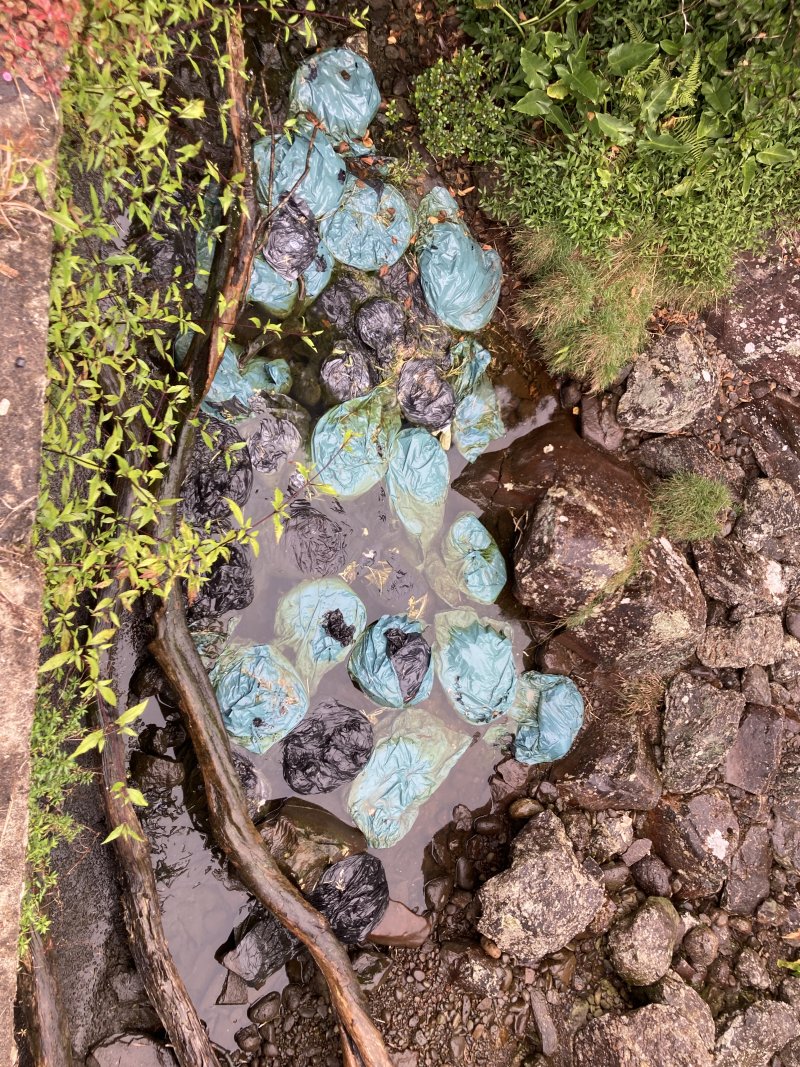 Je me suis garée tout près du pont de Bras Chansons. Je suis descendue vers la rivière en amont du pont. J’ai remarqué une odeur de charogne. J’ai effectué la remontée de la rivière jusqu’à ce que la bruine s’invite à la sortie et que les rochers deviennent encore plus glissants. De retour, l’odeur du départ s’expliquait par un amas de sacs poubelles remplis d’ordures organiques, y compris de la chair qui dégeulaient dans la rivière-voir la photo. Quelque makote a cru bon de balancer des dizaines de sacs poubelle du pont! Aucune envie de continuer vers l’aval et ses eaux contaminées. En plus des dangers usuels pour un randonneur individuel, il y a danger pour la santé publique !