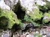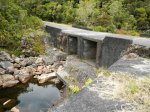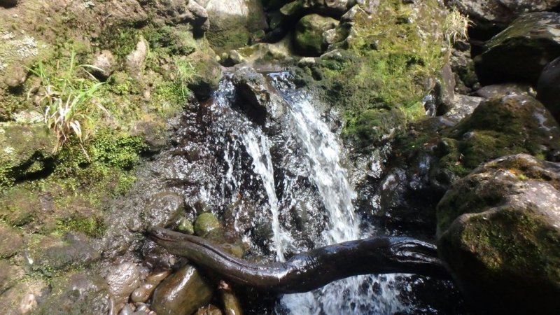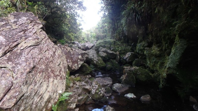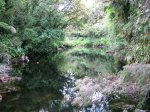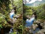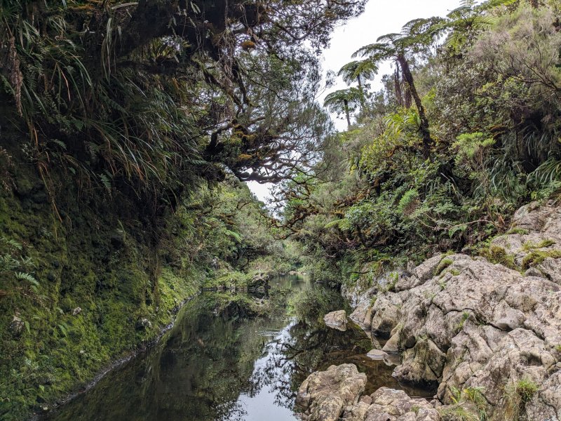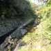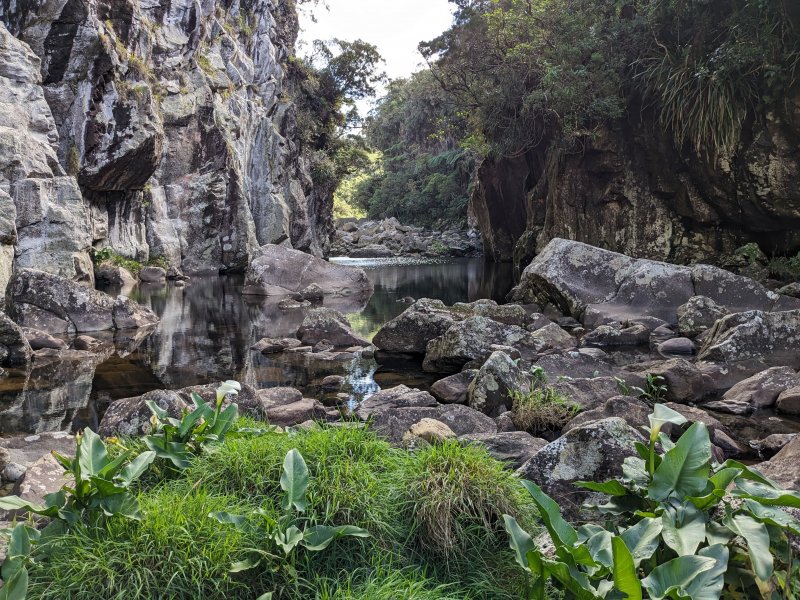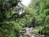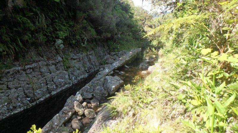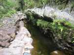 Bras Chansons : La randonnée commence également au pont qui enjambe la rivière où un sentier en rive gauche et en amont permet de rejoindre la berge (Photo 9). Le fond de la rivière est différent de la première ; il est plus étroit et les rochers sont remplacés par de solides coulées de lave ancienne usée par les eaux depuis des millénaires (Photo 10). On retrouve évidemment les arums qui fleurissent dans toute la région de Bébour-Bélouve. Une source sortant d'une cavité donne une eau fraîche agréable (Photo 11). Quelques grottes (Photo 13) ou petites chutes d'eau agrémentent ces nouveaux paysages entourés de belles forêts de bois de couleurs (Photo 14). On rencontre également une retenue d'eau moins de 500 mètres après le pont (Photo 15) qui impose de faire demi-tour pour passer sous la route et poursuivre vers l'aval. Un étroit sentier longe les rives du Bras au début mais on peut cheminer dans une partie du lit s'il n'y a pas trop d'eau. Marcher lentement car il y a toujours quelque chose de nouveau à découvrir tous les 50 mètres : grotte, bassin, tunnel effondré, cassure, gouffre profond aux eaux noires, source, marmites de toutes formes et de toutes couleurs (Photo 16), arbres, mousses, etc. Il faut parfois emprunter le haut d'une coulée basaltique qui se transforme en une minute en sentier (Photo 17). Les bassins se multiplient, tous aussi originaux les unes que les autres (Photo 18 et 9). En arrivant près d'un long bassin infranchissable par le lit (Photo 20), repérer en rive droite le sentier qui monte dans une magnifique forêt primaire (Photo 22) et suivre le "sentier" rudimentaire mais bien visible qui permet d'atteindre la fin des bassins immergés en sautant de racines glissantes en racines moussues (Photo 23). Il faut marcher le plus souvent à quatre pattes ou courbé pour éviter de se cogner (Photo 24). Le clou de la sortie se situe à la fin de la descente qui ramène aux rives du Bras Chansons : les cassures, à-pics, bassins, points de vue sur l'aval de la rivière sont d'une beauté sauvage qui incite peu au retour (Photo 26). Le regard porte vers l'aval en direction de Takamaka (Photo 27). Attention tout de même à la chute qui ne pardonnerait pas car rien n'est plus dur que de la lave solidifiée depuis 2 millions d'années et on a très peu de chance de tomber dans un bassin (Photo 28). Le retour s'effectue par le même itinéraire que celui pris dans la descente.