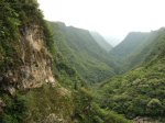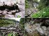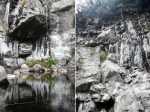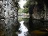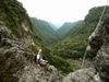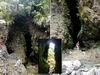 Rivière des marsouins : La randonnée commence au pont qui enjambe la rivière qu'on atteint facilement par un court sentier en rive droite et en aval du pont. Le cheminement vers l'amont est facile sur de gros galets ou des petits rochers stables entourés d'arums (Photo 1). Cette montée est hélas de courte durée car on rencontre très vite une retenue d'eau située entre deux falaises verticales empêchant tout passage à pied (Photo 2). L'endroit est sauvage et le bassin ne donne pas du tout envie de s'y tremper (Photo 3). Il y a certainement un passage pour remonter la rivière mais il est très difficile à repérer avec ces hautes falaises (Photo 4). On peut rejoindre cette retenue d'eau en partant de l'amont lors de la traversée de la Rivière des Marsouins à partir du sentier de la Rivière, emprunté pour la traversée de la Plaine des Marsouins. Après avoir fait demi-tour, passé le pont puis atteint le cassé suivant en marchant vers l'aval, une halte s'impose pour profiter au maximum du panorama sur la vallée de la Rivière des Marsouins (Photo 5), des grottes nombreuses (Photo 6) et du vol des dizaines de salanganes qui entrent et sortent de la profonde Caverne des Hirondelles (Photo 7). Observer au passage les cordes et les pitons en place pour descendre en rappel dans le fond de la rivière, une centaine de mètres plus bas : frisson assuré sans même s'accrocher à la corde (Photo 8). On peut également rejoindre le pied de la chute d'eau en partant de l'aval lors de la descente au Mini Trou de Fer à partir du Bras Chansons qu'on descendra dans une heure.