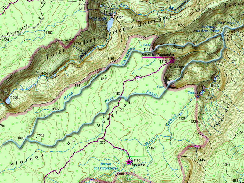 On remarque, sur le sentier moussu, une trace qui se poursuit sur la droite au moment où l'on entreprend la descente vers les bassins. Si on poursuit dans cette voie, mais ce n'est plus de la randonnée plaisir, on rejoint à nouveau la rivière qui devient de plus en plus sauvage sur des parcours escarpés réservés au canyonistes désireux d'atteindre le magnifique cassé visible depuis le sentier du Bras Cabot, lui-même difficile à suivre à cause de la végétation qui a tout envahi. C'est également à cet endroit que se prend la trace en direction du Mini Trou de Fer.