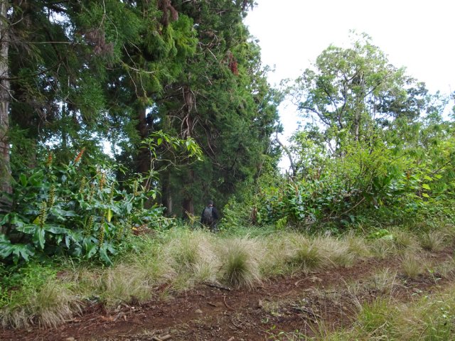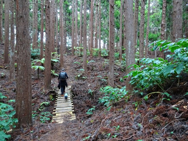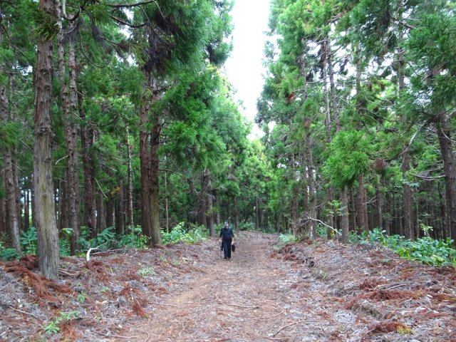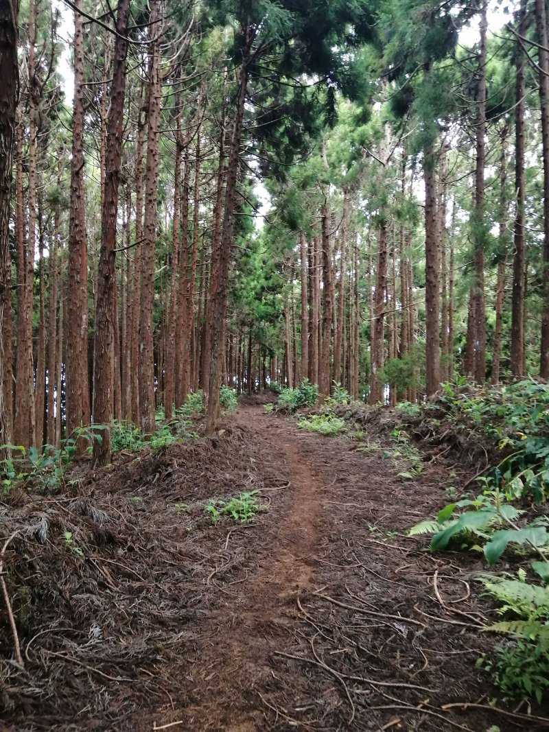 Le retour par le sentier des descentes en VTT est bien raide ! La traversée de la forêt de cryptomerias est très belle. Silence total !!
