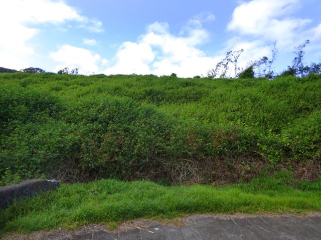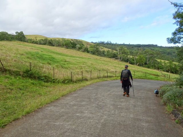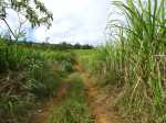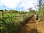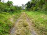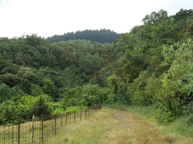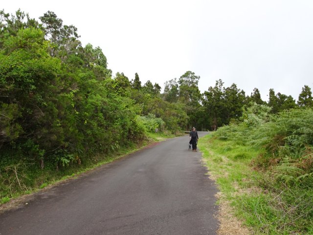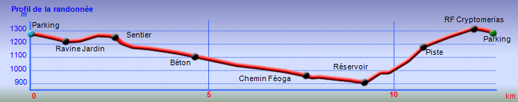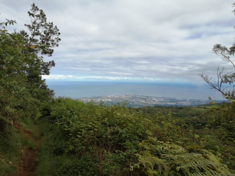 La randonnée débute sur la route Forestière des Cryptomerias au croisement avec la piste du Bois de Nèfles. Le cheminement est toujours aisé, en descente légère constante sur un sol tout d'abord couvert d'herbes (Photo 1). Sur la gauche, quelques prairies ponctuées de grands arbres accueillent encore quelques bovins mais, faute d'entretien, se couvrent déjà de quelques vignes marronnes (Photo 2). Franchir la Ravine Jardin avant d'effectuer ou non un court détour dans la forêt de cryptomerias. Dans ce cas, obliquer à droite à la première piste fermée d'une barrière et entamer une légère montée en lacets au milieu des longoses (Photo 3). On se retrouve sur une agréable piste dans une mer de longoses d'où dépassent les cryptomerias. Ne pas manquer, à la fin des conifères, le sentier de gauche qui longe la lisière et descend vers la piste de Bois de Nèfles (Photo 4). Le sentier est étroit et peu utilisé. La pente est assez forte. Le sous-bois est de plus en plus recouvert de galaberts qui ont détrôné les longoses (Photo 5). On retrouve la piste assez terreuse sur quelques hectomètres (Photo 6). Elle descend en pente très légère avant d'entamer une série d'une demi-douzaine de longs lacets. Les abords sont envahis mais on distingue pourtant facilement l'océan, la ville de Saint-Paul et celle du Port (Photo 7). La piste se transforme en une agréable route étroite si l'on oublie la végétation qui la borde (Photo 8). Il faut beaucoup d'imagination pour se représenter un champ ou un pâturage quand on longe d'inextricables buissons de vigne marronne (Photo 9). Heureusement, quelques prairies demeurent et semblent épargnées pour le moment (Photo 10). D'autres fois, ce sont les galaberts qui ont envahi les anciens champs et bien malin qui pourrait traverser (Photo 12). Des fonds de petites ravines sont recouverts de longues lianes de chouchous dont les fruits, que l'on voit pendre, ne seront jamais cueillis (Photo 13). Attention, plusieurs chemins plus ou moins bien entretenus coupent les virages de la route mais sont généralement en propriété privée ; rester sur le béton afin d'éviter tout litige. On se retrouve bientôt sur le Chemin Féoga que l'on emprunte vers la gauche. Quelques habitations ou fermes bordent la route qui ondule de ravine en ravine. Ne pas manquer l'oratoire original sur la droite à l'entrée de quelques habitations (Photo 14). C'est en réalité une série d'oratoires ayant chacun ses ex-voto en remerciement de vœux exaucés. Ne pas manquer, après l'oratoire, le petit château d'eau sur la droite. Une piste débute juste en face, fermée par une chaîne. C'est la fin de la Piste Louis Emile venant des premières pentes du Maïdo. La chaîne a été installée pour ralentir le vol de bois dans les propriétés en amont. C'est un des nombreux parcours VTT sillonnant les flancs du Maïdo. Un bâton de randonnée rassurera pour passer la chaîne en prenant garde aux chiens plus bruyants que méchants qui arrivent de la maison toute proche (Photo 15). La pente sera plus rude pour remonter les 400 mètres descendus sur de longs lacets plus au nord. On longe tout d’abord les prairies dans la poussière laissée par les engins et vélos (Photo 16). On profite encore de beaux panoramas sur l'océan. Plus haut, la pente s'accentue en suivant les champs de canne à sucre (Photo 17). Quelques panneaux rappellent l'emploi sans doute régulier de la piste Louis Emile par les vététistes (Photo 18). La piste cesse à la fin des champs et se transforme en sentier gardant la même pente (Photo 19). Si jusque là on avait régulièrement rencontré partout des touffes de plantes invasives, on se retrouve désormais en plein au cœur. Sur la gauche, les anciens champs sont verdoyants et fleuris d'une plante non comestible, le galabert ou lantana (Photo 2). Il y en a partout quand ce ne sont pas les vignes (Photo 21). Le sentier, grâce aux vélos, est toujours agréable malgré la pente (Photo 22). Certaines parties sont creusées par les pneus et le sol peut être glissant par temps pluvieux (Photo 23). Plus loin, le sentier effectue un grand virage vers la droite sur une belle portion herbeuse (Photo 24). Puis la forêt de cryptomerias débute sans transition. La pente est assez forte sur l'épais tapis de branchettes tombées lors des derniers coups de vent (Photo 25). Plusieurs traces faites par les V.T.T se présentent. Prendre à droite puis effectuer une longue boucle sous les grands arbres (Photo 26). La fin de la montée peut s'effectuer sur un des sentiers ou sur la piste elle-même ne présentant aucune difficulté (Photo 27). Après ce kilomètre ombragé, la piste se termine à la RF des Cryptomerias. Partir à gauche et rejoindre sans difficulté le véhicule en profitant des derniers mahots ou bois maigres pas encore anéantis par les invasives de tout poil et de toutes épines (Photo 28).