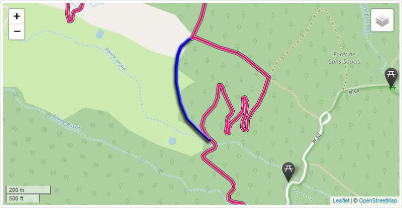 Les trois derniers commentaires font état de l'envahissement du sentier proposé en début de boucle. Le mieux, en attendant que je revienne au plus près pour voir les dégâts, consiste simplement à rester sur la piste une fois franchie la Ravine Jardin (Trait bleu).