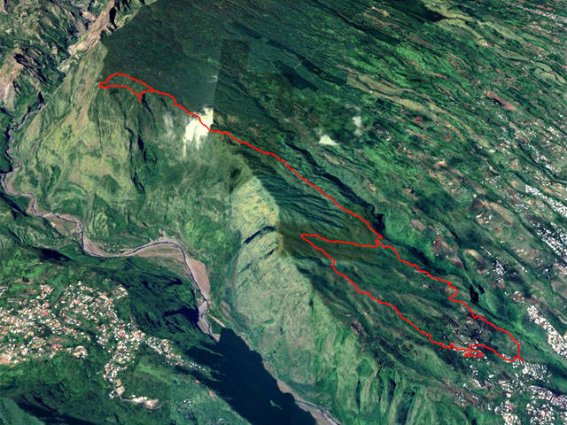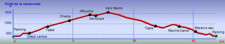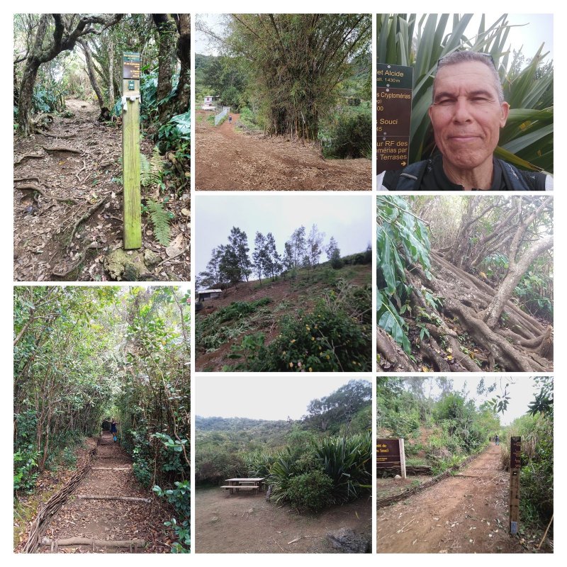 La randonnée pour tous débute au Chemin de la Cressonnière qui prolonge le Chemin de Sans Souci. Il est possible de stationner 50 m après le stock de barres de fer d'un atelier de ferronnerie. Laisser la nouvelle route remontant fortement sur la gauche et partir tout droit sur la piste débutant entre des tournesols mexicains (Fleur fête des Mères, Tithonia diversifolia). Très rapidement, la piste se termine à des propriétés privées puis se transforme en sentier un peu herbeux durant deux minutes. Il se met ensuite à grimper entre filaos et chocas (Photo 1). Plus loin, il grimpe dans des friches de terre rouge (Photo 2). C'est le début d'une montée de 7 kilomètres sans un seul tronçon en descente pour reposer les jambes. La piste est large, bordée de filaos et la pente très raisonnable (Photo 3). Plus loin, on peut poursuivre sur la piste mais un sentier débute sur la gauche entre goyaviers et fougères (Photo 4). Le sentier, très fréquenté, est creusé par endroits dans la terre (Photo 5). On parvient à une réserve d'eau sur la gauche bordée de hauts bambous (Photo 6). Le sentier de l'Îlet Alcipe n'est toujours pas indiqué officiellement mais on croise un panneau du Conseil Général (Photo 7). A partir du panneau, le sentier de plus en plus large est facile sur des centaines de marches rarement hautes (Photo 8). On croisera, à partir de la réserve d'eau une demi-douzaine d'oratoires tous aussi bien entretenus les uns que les autres (Photo 9). La végétation est essentiellement constituée de goyaviers qui ont presque réussi à éradiquer les bois de couleurs (Photo 10). Le sentier comporte quelques portions empierrées avec marches un peu plus hautes (Photo 11) mais ce sont surtout de très longs tronçons de marches basses bordées de fascines qu'on arpente avec plaisir (Photo 12 et 14). On bénéficie de panoramas de plus en plus larges au fur et à mesure de la montée. On commence à voir Dos d'Ane, la vallée de la Rivière des Galets et l'entrée dans Mafate. Le regard porte souvent sur la ville du Port (Photo 15). Repérer la première table de pique-nique sur la gauche du sentier, en face d'une grosse touffe de bambous ; c'est de là que partiront les aventuriers pour rejoindre la Cressonnière par un parcours autrement plus difficile que ce sentier même s'il comporte encore des vestiges de fascines. On rencontrera d'autres aires de repos pour pique-niqueurs motivés car elles sont situées à près d'une heure de marche du point de départ. Un travail très important a été entrepris pour attirer les marcheurs. A partir de 1000 m, les vestiges d'anciennes cultures se multiplient. On ne voit plus trop de champs même si quelques lopins subsistent en bordure de sentier (Photo 16). Des portillons en bois ou en tôle indiquent ça et là que des agriculteurs viennent encore entretenir les petits champs entourant de vieilles cases en tôle. Rien à voir avec ceux traversés au début de ce siècle. Les gramounes, comme ils l'expliquent lors d'agréables rencontres, viennent encore affronter la pente pour quelques heures de culture alors que les jeunes sont moins courageux. Les goyaviers disparaissent un peu et sont remplacés par les branles verts et les fougères (Photo 17). Le sentier s'approche de plus en plus du rempart pour le frôler au plus près à 1300 m (Photo 18). Les dernières petites cases entourées de cultures se situent à cette altitude au moment de la rencontre avec le sentier venant de la Route Forestière des Cryptomerias (Photo 19). Le sentier est toujours aussi agréable au croisement vers l'Îlet Alcipe. Prendre à gauche puis entamer la descente vers l'îlet (Photo 20). Emprunter le Sentier l'Affouche facilement reconnaissable au moment où il faut enjamber ses puissantes racines en travers du passage. On rejoint aisément l'emplacement surtout reconnaissable à ses tables de pique-nique dans de petites clairières aménagées (Photo 21). L'eau, indispensable à la vie durant des décennies, est toujours présente dans la seule flaque restante (Photo 22). Si le lieu comporte plusieurs poteaux de l'ONF faisant mention du prénom Alcipe, les autres poteaux de la région n'ont pas encore été changés comme si l'organisme reconnaissait du bout des lèvres ce changement récent de dénomination (Photo 23). Un court sentier à gauche permet de se rendre un peu plus loin pour profiter du point de vue sur Dos d'Ane depuis le point 1434. Une fois le couple de tec tec nourri des miettes du casse-croûte, faire demi-tour ou poursuivre dans les longoses sur le sentier étroit remontant au point de vue officiel de plus en plus bouché par la végétation mais offrant de splendides panoramas sur le cirque (Photo 25). Poursuivre en tournant chaque fois à droite par de nouveaux sentiers dans les longoses ou les branles pour revenir au plus près de l'îlet (Photo 24). Entamer la longue descente pour rejoindre le point de départ en restant sur le même itinéraire.