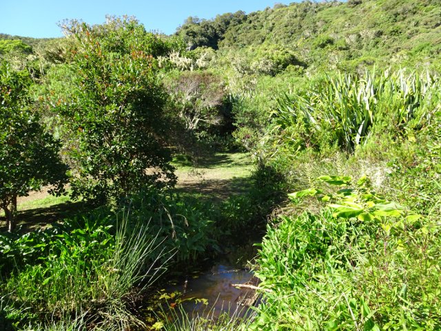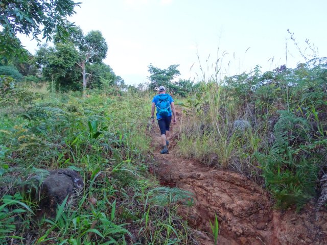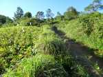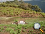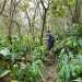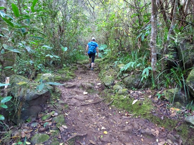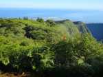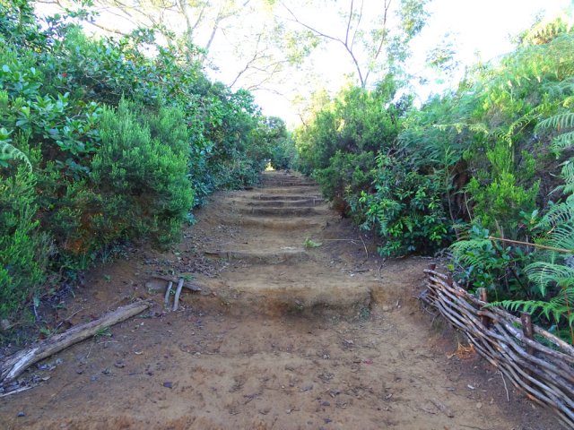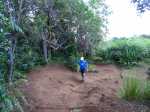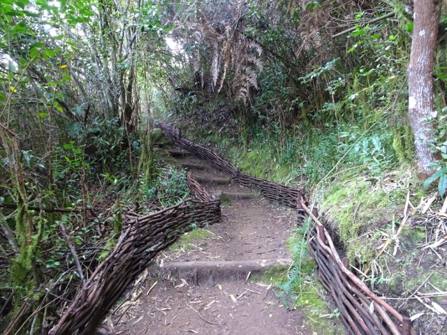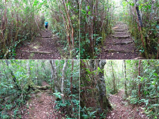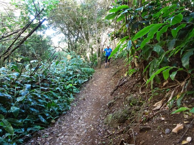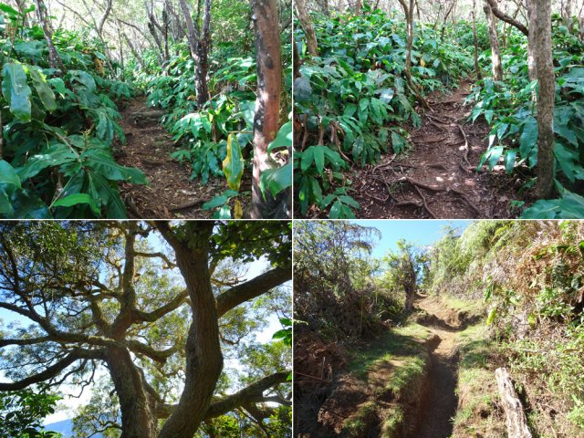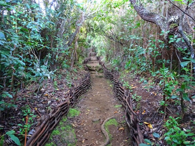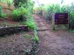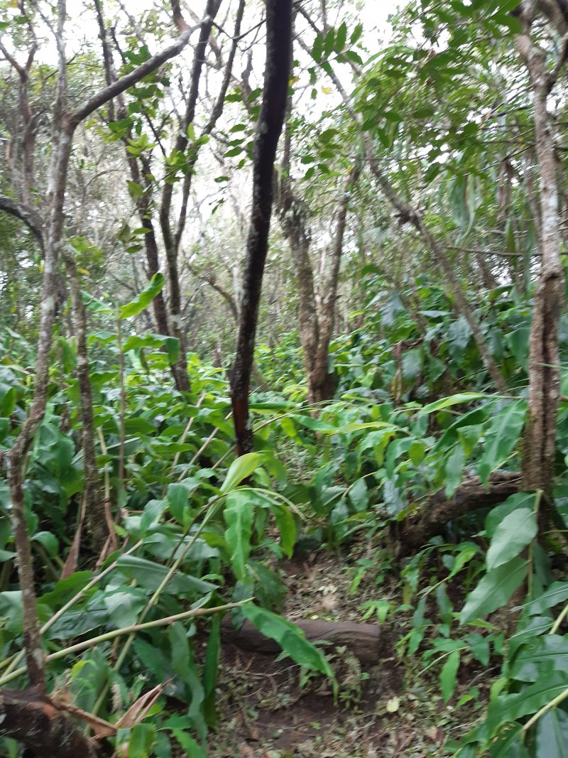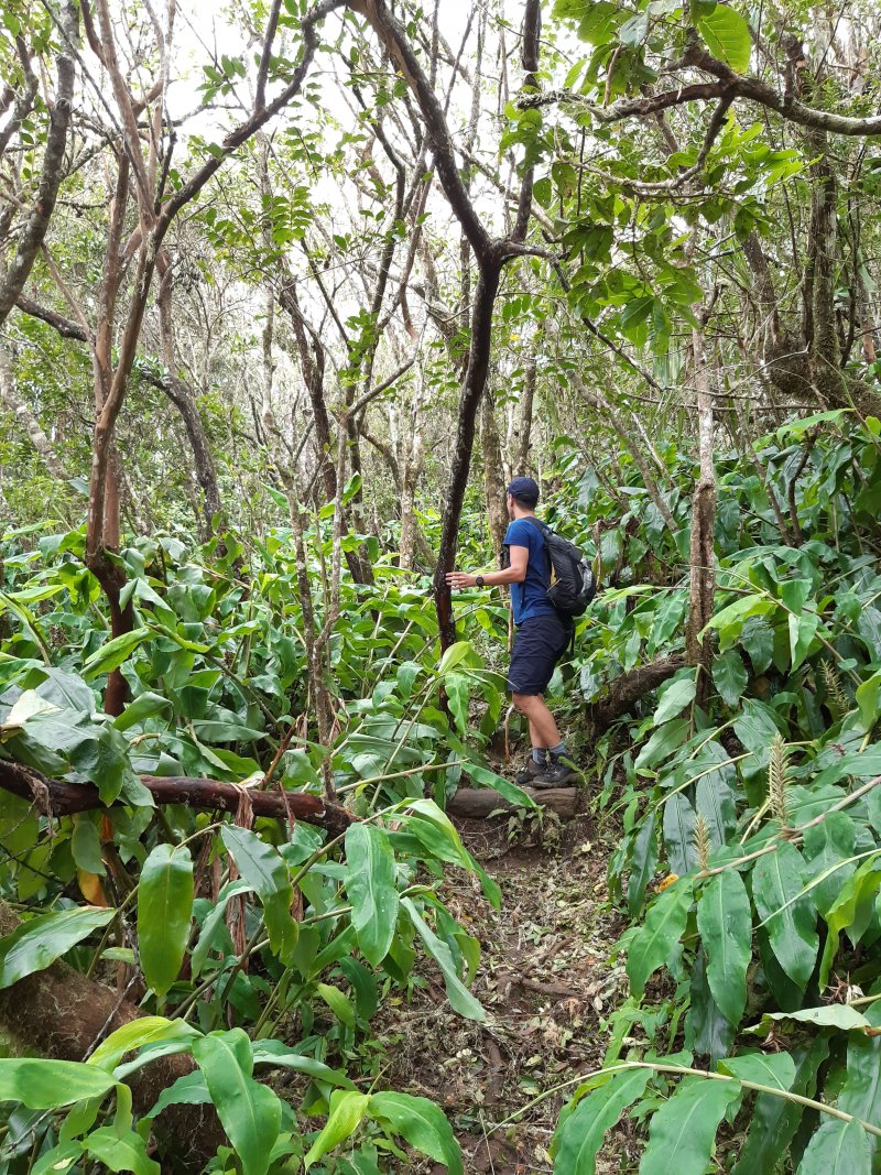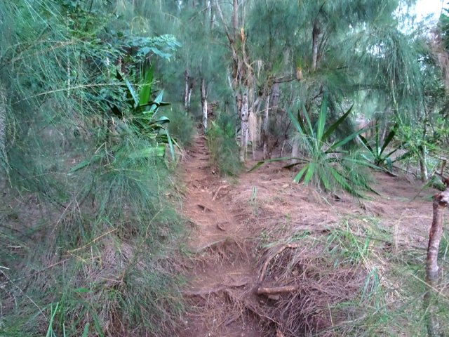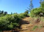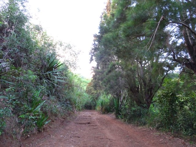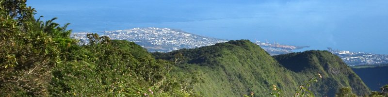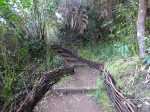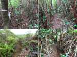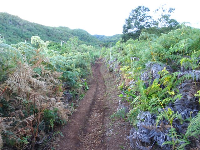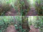 La randonnée pour aventuriers sur sentier lontan débute à la table repérée en montant (Photo 26). Emprunter le sentier bien nettoyé derrière la table. Tourner à droite au premier croisement (on rejoint le sentier officiel en partant à gauche). L'itinéraire à tout du sentier de qualité un peu abandonné. On y retrouve les marches en rondins, une largeur encore conséquente et un sol propre malgré une couche de feuilles (Photo 27). Ce sentier monte constamment en direction du Piton Fougères qu'on imagine atteindre bientôt. On arrive ainsi à l'altitude de 950 mètres mais le sentier vire brusquement vers la gauche et descend en direction d'une ravine tout en se rétrécissant par endroits. Il reste cependant encore facile à suivre sans hésitation ni efforts inconsidérés. Une fois la ravine traversée, on a l'impression qu'il disparaît totalement. Suivre les traces de pas dans une zone boueuse en partant à gauche ou repérer quelques rubalises accrochées aux branches. Les goyaviers deviennent de plus en plus serrés mais la trace est toujours visible (Photo 28). Les hésitations sont rares et le cheminement s'effectue sans coupe-coupe malgré quelques longoses et fougères tentant de s'installer sur le passage. Les fougères deviennent de plus en plus touffues mais l'on remarque de nombreuses traces de passage. La trace plonge assez rudement vers la Ravine Canot qu'on traverse près de bassins d'eau très noire. La remontée, tout aussi rude, amène en direction du trait en pointillés sur la carte indiquant le sentier des Orangers. Cette piste, très ancienne, est impossible à deviner, même par les habitués de ces recherches de sentiers lontan. Faute de piste ou de sentier, se contenter de suivre les rubalises et la trace de passages. A 700 m, couper sans réfléchir les travaux de défrichement laissant penser à un sentier et poursuivre sur un terrain où les fougères disparaissent et sont remplacées par de beaux pieds de jamrosats. La trace devient plus compliquée à suivre mais on parvient à une petite ravine servant de prise d'eau. Suivre sans plus réfléchir le tuyau à travers le sous bois pour parvenir à une grande retenue d'eau entourée de bananiers. Contourner par la gauche pour parvenir à une piste, fin des inquiétudes. Suivre la piste puis la route et enfin le dernier sentier ramenant au véhicule (voir carte).