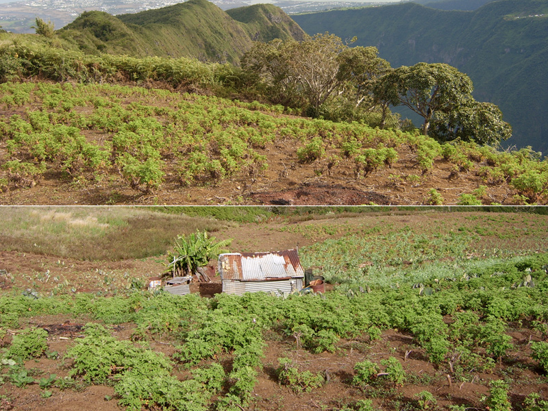 En 2000, la région des Hauts de Sans Souci était recouverte de champs de géranium rosat. Le sentier en traversait une partie et l'on pouvait voir d'autres étendues en prenant les sentiers rencontrés lors de la montée à l'Îlet Alcipe. On arrivait souvent à de petites cases où l'on rencontrait des agriculteurs avec lesquels il était toujours intéressant de discuter. Les parcelles étaient nettoyées, désherbées et toujours propres. Depuis, petit à petit, ces champs sont devenus des friches et désormais des broussailles déjà inextricables. Dans 10 ans, ce seront les goyaviers qui auront tout recouvert, même les petits champs rencontrés actuellement.