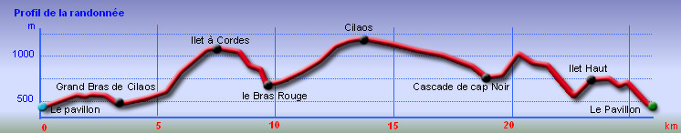 La randonnée débute au Pavillon pour s'y terminer près de 10 heures plus tard. On peut débuter au parking du Sentier Burel mais il faudra marcher sur la route en fin de boucle pour retrouver le véhicule. Si le sentier Burel est fermé comme cela a été le cas bien souvent, il est possible de remonter le Bras de Cilaos jusqu'au Parc à Dennemont, fin du Sentier Burel. La remontée par la rivière est sans danger lors des 5 passages les pieds dans l'eau à condition d'effectuer la jonction en période sèche. Le trajet longe ensuite la rivière jusqu'à Trois Bras avant de retrouver le Sentier du Reposoir qui monte de plus en plus vers l'Îlet à Cordes. Certains passages en bord de falaises sur des lacets serrés peut incommoder les personnes sujettes au vertige (Voir photo 5 de cette sortie). La montée se termine dans les champs de l'Îlet à Cordes avant de retrouver la route qui permet de traverser de part en part ce grand îlet éloigné de Cilaos. On longe le village et les champs du Fond de la Cour en guettant sur la droite le début du sentier de l'Îlet à Cordes qui descend rapidement vers le Bras Rouge. On marche sous les filaos sur un sentier sableux pouvant être glissant. Le franchissement du Bras Rouge sur les gros rochers ne pose pas de problème particulier. On poursuit vers Cilaos en montée pour laisser à gauche le Sentier menant à la Chapelle. On poursuit le long de la Ravine Henri Dijoux, toujours sous les filaos et au plus près de la rivière parfois. La piste bétonnée au village du Bras des Etangs marque la fin de cette première moitié de la boucle. Rejoindre le cimetière en prenant la première rue sur la droite est facile et reposant. La boucle se poursuit, toujours sur le bitume ou sur le long escalier qui coupe un lacet et permet de gagner près d'un kilomètre. Prendre la première rue sur la droite après l'escalier afin de gagner encore un peu de route pour rejoindre Mare Sèche et la Plate Forme. Le sentier qui permet d'atteindre la Cascade du Cap Noir est très bien indiqué, en fin de route bétonnée, un peu après le début du sentier de la Roche Pendue. On ammorce là une rude descente en lacets qui permet d'atteindre rapidement le Bras de Benjoin. On traverse alors le gué près des ruines et à deux pas de la Cascade du Cap Noir qui se précipite dans le vide. Le sentier qui suit a subi maints éboulis et le sentier a également été souvent remanié. Il grimpe entre les chocasAgavacée (cadère) Furcraea foetida - Importé pour en faire de la corde,