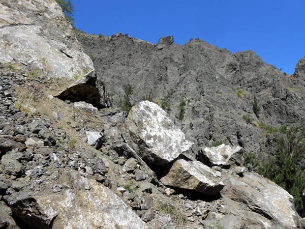 Quand on arrive à la cascade du Cap Noir en venant de la Plate Forme on se retrouve face à cet énorme éboulis qui recouvre le flanc de la montagne jusqu'à la ruine du pont. Cet éboulis est facile à escalader mais on se retrouve alors face à un ravin vertical qui plonge dans le Bras de Benjoin. Impossible de passer. Pour une fois, l'ONF a raison de fermer l'itinéraire. Attention, pas de pancarte de fermeture à la Plate Forme (mai 2014) donc possibilité de rebrousser chemin pour qui n'a pas lu ce paragraphe avant de partir.