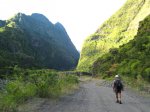 La première partie de cette randonnée assez facile malgré sa longueur, représente la manière la plus douce de pénétrer dans le Cirque de Mafate en longeant la Rivière des Galets sur une dizaine de kilomètres. C'est un itinéraire souvent utilisé pour des randonnées importantes dans le cirque. Elle permet de chauffer les muscles avant d'entreprendre les montées vers les différents îlets. Cette méthode douce présente pourtant le désagrément de suivre une longue piste caillouteuse et poussiéreuse par temps sec. De plus il faut traverser plusieurs fois la rivière et ce n'est pas toujours agréable de débuter un périple les pieds mouillés. Il est également possible de faire appel aux 4X4 garés après l'église qui effectuent la jonction pour quelques euros (voir numéros sur cette page). Remarquer, tout au long du trajet l'inquiétant envahissement des falaises par la liane papillon (Hiptage benghalensis (L.) Kurz) qui aura tôt fait de recouvrir les cirques et toutes les parties basses de l'île si rien n'est fait pour la ralentir.