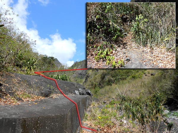 Pour ne pas manquer le début du sentier qui mène à la Fenêtre de Grand Îlet en passant par l'abri ONF, marcher jusqu'au barrage de recueil des eaux, traverser la rivière à gué et escalader facilement le rempart bétonné pour trouver, un peu au-dessus, le départ du sentier qui commence directement mais discrètement en rive droite dans de la broussaille sèche et des touffes de langues de belle-mère. Passé cette seule possibilité d'hésitation, le sentier vers l'Îlet Natte est bien visible et ne comporte pas de difficultés.