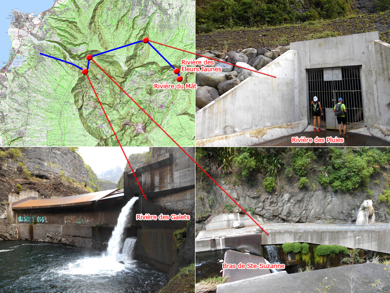 Afin d'irriguer convenablement l'Ouest qui manque cruellement d'eau, le précieux liquide est récupéré dans la Rivière du Mât, la Rivière des Fleurs Jaunes, la Rivière des Pluies, la Rivière des Galets et le Bras de Sainte-Suzanne puis basculé et acheminé par légère gravitation vers un grand réservoir de 50 000 m3 à la Plaine, au Bas de Mon Repos. Ce transport nécessite 30 km de tunnel et de tuyauteries qui se terminent dans l'ouest. Les travaux, débutés dès 1989 ont demandé de véritables prouesses technique en raison du sous-sol particulier de la Réunion.