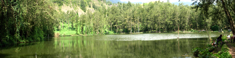 On longe tout d'abord le ruisseau créé par l'écoulement de l'eau de la mare avant d'arriver au bord du petit étang entouré de filaos qui se reflètent dans l'eau (Photo 4). Poursuivre en longeant les berges où les pêcheurs s'adonnent à la pêche classique aux tilapias qu'on aperçoit par dizaines au ras de l'eau (Photo 7). Rallonger cette boucle en prenant alors à droite sur un sentier (Photo 6a) qui remonte vers la route de Fond de Rond Point qu'on longe sur moins de 100 mètres avant de plonger par un autre sentier en lacets vers les premières aires de pique-nique. Au rocher (Photo 6c), prendre à gauche et rejoindre une jolie piste verte qui chemine jusqu'à des ruines. Du haut de l'escalier ou du belvédère en bois on a une très belle vue sur l'étang et les montagnes vers Bélouve (Photo 15). Poursuivre pour rejoindre l'étang et retrouver l'itinéraire pris à l'aller. Continuer alors tout droit en direction du village en traversant de grandes zones de culture du chouchou ou du cresson. L'arrivée au village ne comporte pas de difficulté. Quelques cases ou jardins agrémentent la traversée du village, très court, et c'est par un agréable chemin ombragé (Photo 6d) qu'on retrouve la route de Salazie. Attention à la circulation sur cette centaine de mètres avant de rejoindre le véhicule.
