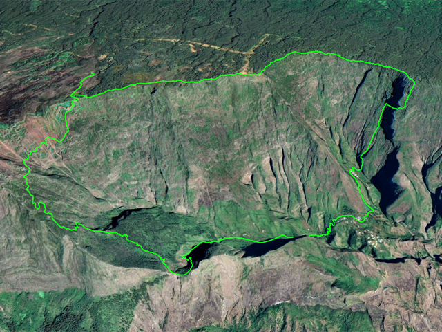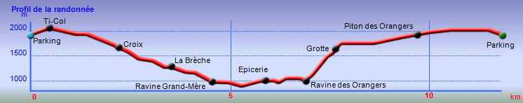 La randonnée débute par le sentier de Roche Plate à quelques mètres du Petit Bras de la Ravine Divon (Photo 1). Il faut entamer les 300 mètres qui séparent du rempart sur des basaltes bordés de branles verts et d'ajoncs. 70 m plus haut, on parvient à Ti-Col pour entamer la longue descente dans le cirque de Mafate. Profiter de magnifiques panoramas sur tous les pitons de la région et sur le cirque lentement illuminé par les rayons du soleil (Photo 2). La descente, interminable, maintes fois décrite, est une succession de hautes marches, de lacets, de parties pierreuses ou terreuses, de rares portions plates ou d'éboulis sécurisés de mains courantes (Photo 3). Depuis l'incendie de 2021, la végétation a beaucoup souffert et de nombreux éboulis avaient obligé les autorités à fermer le sentier. Depuis sa remise en état, les câbles sécurisent les portions fragilisées (Photo 4). Il faut une grosse heure à rythme normal pour atteindre la Brèche pour la première pause. L'endroit est bien situé pour bénéficier de superbes panoramas de tous côtés, surtout sur le nord du cirque (Photo 5). Continuer pour encore près d'une heure en direction des Orangers. La descente se poursuit tout d'abord sur un bel escalier bétonné, remplacé plus bas par des marches en pierre et de longues portions dans le fond et le long de la Ravine de la Brèche (Photo 6). Les premières cases se rencontrent vers la Ravine Grand-Mère. La marche est alors agréable sur de longues parties plates dans le lit de la ravine ou en rive gauche. Plus loin, on traverse la Ravine du Maïdo et le sentier se met à remonter assez fortement vers les Orangers sur de nombreuses marches facilitant la grimpette (Photo 7). Prendre à gauche au premier croisement et atteindre le Plateau l'épicerie. Laisser le GRR2 puis partir à gauche vers les Orangers Remparts. La montée, un peu raide parfois, permet de se rapprocher de cet îlet des Orangers le moins connu. Deux sentiers mènent à l'îlet, celui de gauche étant le plus facile malgré quelques raidillons. C'est le moment de regarder attentivement le rempart d'en face et d'imaginer le trajet restant à parcourir (Photo 8). Si la météo menace ou que les jambes commencent à flageoler, il est temps de rebrousser chemin en visitant ce hameau méconnu sinon poursuivre, franchir une ravine et parvenir à quelques tuyaux d'alimentation en eau (Photo 9). Partir entre les tuyaux et le grillage entourant une propriété. Suivre le grillage jusqu'au rempart de la ravine des Orangers. Le sentier, discret, descend dans le fond de la ravine à travers galaberts, fougères et chocas (Photo 10). Il passe devant une petite grotte qui confirme le bon itinéraire (Photo 11). Après la grotte, malgré des passages étroits, il n'y a plus d'hésitation à avoir puisque débute le long câble qu'on ne quittera que beaucoup plus haut (Photo 12). Suivre cette ligne métallique puis traverser la ravine pour entamer une rude montée de quelques mètres au début du rempart. On parvient très vite à une minuscule ravine qu'on traverse en prenant garde à la chute au fond du puits profond creusé par sa cascade (Photo 13). Il est encore temps de faire demi-tour car, très vite, on préfère largement monter que descendre, tant la pente est forte (Photo 14). Une comparaison des images prises en 2013 et 2022 permet de constater l'importance du câble pour la sécurité (Photo 15). La présence de la ligne de vie n'empêche nullement de marcher à quatre pattes, position la plus sécurisante (Photo 16). Plus haut, sans jamais avoir trouvé plus de 50 cm de terrain plat, le câble disparaît, remplacé par de longs fils électriques, heureusement très solides, mais beaucoup plus fins pour les mains (Photo 17). D'autres portions, moins sécurisées comportent cependant de belles prises pour les quatre membres qui commencent à fatiguer (Photo 18). A partir de 1500 mètres, la végétation devient plus dense et supprime un peu les sensations de vide (Photo 19). A cette même altitude, le sentier oblique sur la droite et se dirige vers une portion plus boisée sur le rein en franchissant quelques passages délicats où toute l'attention est requise (Photo 20). Les difficultés cessent peu mais la végétation assez dense rassure et aide aux franchissements difficiles (Photo 21). Depuis le début de la montée, on n'a jamais quitté des yeux les trois îlets des Orangers et l'on commence à apercevoir de nombreux autres endroits habités du cirque (Photo 22). De grosses pierres pour s'asseoir ou des traces de feux sous une modeste grotte permettent une halte pour souffler un peu (Photo 23). Les difficultés ne sont pas terminées pour autant (Photo 24) mais on commence à apercevoir la lumière en haut du rempart. Une dernière grimace et la délivrance se gagne entre deux troncs de tamarins des hauts à moins de 10 m du sentier de l'Îlet Alcipe (Photo 25). Il reste pourtant 250 mètres à remonter en direction de Ti-Col mais après l'effort fourni, on a l'impression de se promener, d'autant que le sous-bois de tamarins est magnifique (Photo 26). Cette forêt des hauts a, hélas, perdu beaucoup de ces arbres centenaires mais il en demeure heureusement quelques uns qui ont résisté (Photo 27). La montée en dents de scie prend près de 90 minutes en profitant souvent des paysages sur Mafate depuis le magnifique sentier avant de rejoindre enfin le point de départ.
