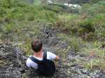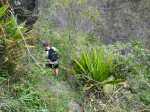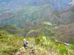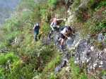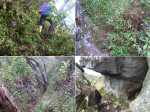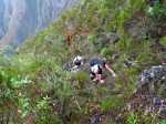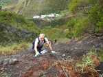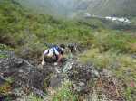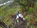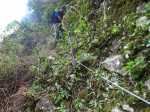Un sentier de secours partant des Orangers Remparts permet de rejoindre, 900 m plus haut, le sentier de l'Îlet Alcipe. On réalise ce qu'un esclave marron était obligé de vivre pour aller se "ravitailler" dans l'Ouest quand la pitance venait à manquer. La pente y est très forte, le sol très souvent dénudé et les prises aléatoires. Un simple coup d'œil à la photo 8 en dit assez long pour décourager tout randonneur n'ayant ni l'entraînement ni l'habitude de ce genre d'aventure. S'il fallait chercher des yeux le sentier il y a quelques années, il suffit désormais de suivre un fil d'Ariane de 10 mm de diamètre et de plusieurs centaines de mètres. Difficile de savoir qui a installé cette ligne de vie mais les conditions d'escalade ont bien changé depuis quelques années. Merci à ces inconnus. La journée est classée en très difficile en raison de la descente de plus de 1000 mètres du Maïdo jusqu'aux Orangers qui met à mal les genoux, même les plus solides, à laquelle il faut rajouter cette remontée d'anthologie. Inutile de préciser qu'il ne faut pas entreprendre cette montée par temps de pluie qui rend les roches très glissantes. Même chose pour les téméraires qui tenteraient l'aventure en descente. Une chute n'est jamais agréable en randonnée ; ici, elle serait fatale.