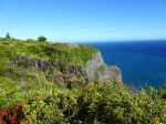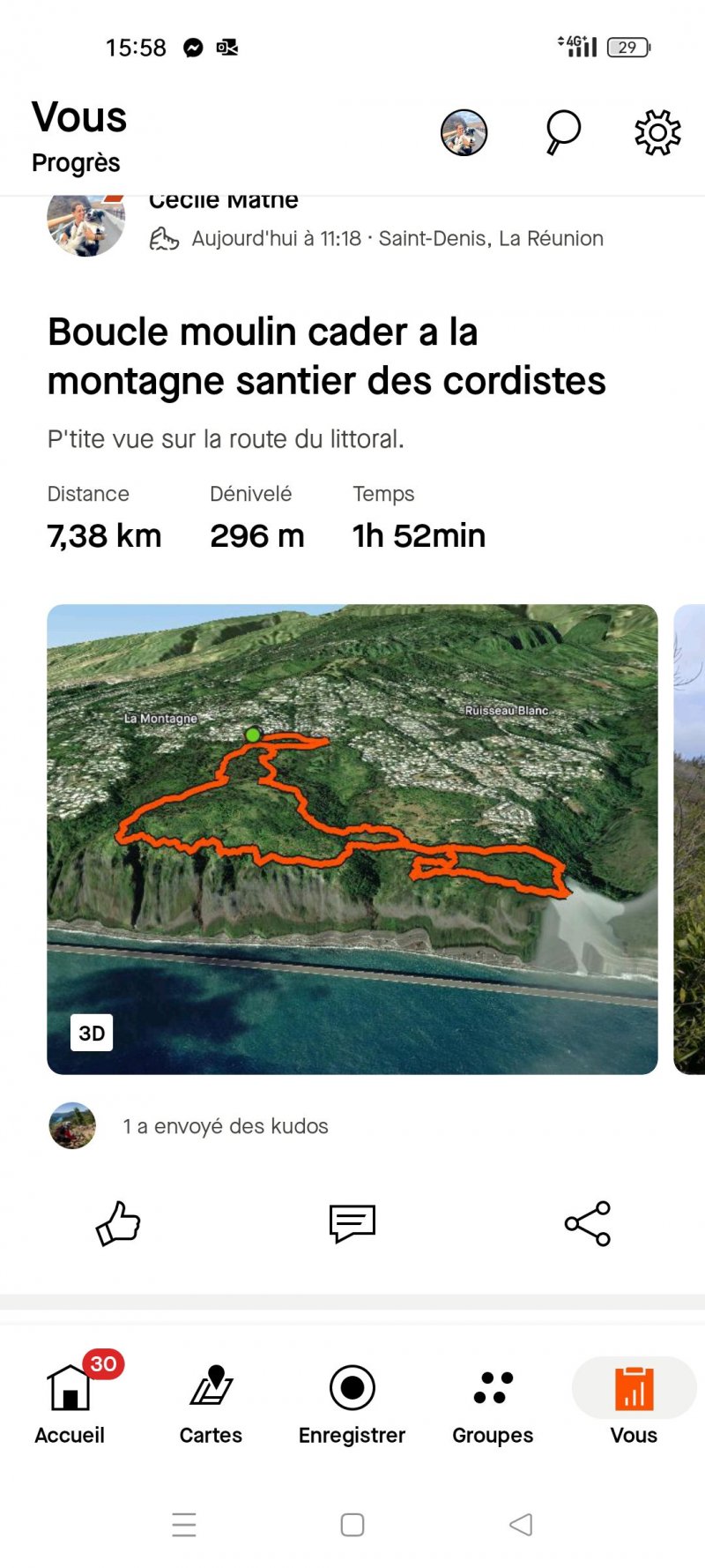 En bien meilleur état que celui de Saint-Gilles, le Moulin Cader de la Montagne (Kader à Saint-Gilles !) présente encore quelques vestiges qui ont tout de même sérieusement souffert des ans et des dégradations. Une partie des ruines est même habitée et il sera difficile de récupérer les bâtiments. Mais ce vieux moulin destiné à broyer les feuilles de chocas pour en faire des ficelles n'est pas le clou de la sortie. En effet, le sentier passe parfois au plus près du rempart des falaises de la Route du Littoral et offre ainsi de beaux panoramas sur l'océan. On aperçoit le viaduc de la Nouvelle Route du Littoral, impressionnant, qui étend son long ruban de béton à une quinzaine de mètres au-dessus de la mer. La circulation y est dense alors que l'ancienne route est désormais abandonnée. Les points de vue sont fréquents depuis le sentier lui-même et il est possible de se rapprocher du bord du rempart par les petites sentes de cordistes. Il faut alors faire attention où placer les pieds car de gros câbles ont été installés au sommet afin de maintenir en place les tonnes d'acier destinées à protéger la route des chutes de pierres. Le sentier, le plus souvent pierreux, est toujours en bon état, parfois large, parfois étroit, jamais dangereux même en haut de falaise. En certaines saisons, les herbes peuvent y être hautes. Il effectue tellement de méandres pour éviter roches et troncs que la trace GPS est plus lissée que le parcours lui-même.