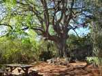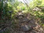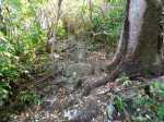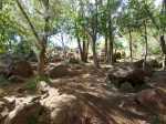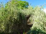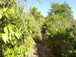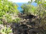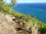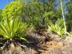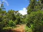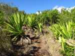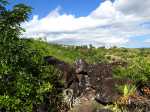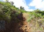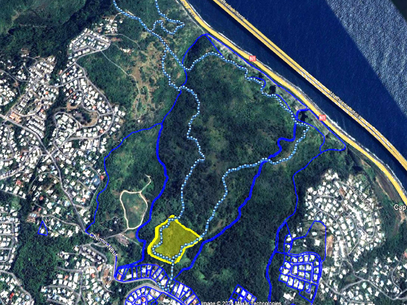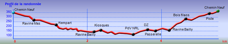 La randonnée débute près de la déchetterie de la Montagne où plusieurs emplacements permettent de stationner. Le dimanche, si le parking est vide c'est qu'il n'y a pas de tirs d'airsoft (Photo 1). S'il est impossible se stationner, partir tout de même mais obliquer à gauche au premier croisement pour éviter la zone de jeu. Le sentier débute par une friche qui peut rebuter sur une dizaine de mètres. Très vite, il devient un classique de la région entre faux poivriers, tournesols mexicains ou envahissantes (Photo 2). Contourner la déchetterie, traverser la discrète Ravine Bailly. Au croisement partir sur la droite. Marcher sur un sentier étroit, envahi de pierres et de fougères jusqu'à une zone couverte de rochers. Plusieurs sentiers partent en tous sens. Prendre à droite celui qui descend en pente douce dans le bois de filaos (Photo 3). La marche est facile dans les chocas jaunes, les fougères, les jeunes filaos et les avocats marrons qui tentent de coloniser l'espace. Après 10 minutes de sous-bois, le sentier parvient à des savanes jaunies où le sentier se suit sans hésitation (Photo 4). Il traverse des zones dénudées ou rocheuses, longe la Ravine Bananiers et se rapproche du rempart sur un sol très caillouteux (Photo 5). On pense bifurquer à gauche pour longer la falaise mais le sentier plonge sans avertissement le long du rempart. Il est étroit, terreux donc glissant (Photo 6). Prendre garde aux racines, aux pierres qui dépassent ou parties sableuses et glissantes car le rempart est assez pentu. On profite des premières vues sur la NRL. Le sentier alterne descentes et montées parfois fortes pour éviter ravines ou précipices. On aperçoit de plus en plus de filets qui protègent la route très fréquentée en-dessous (Photo 7). Les mains s'avèrent parfois utiles pour franchir des raidillons plus sérieux (Photo 8). Le sentier navigue dans le rempart, juste au-dessus des falaises verticales. Il part un peu dans tous les sens en raison des nombreuses aspérités du terrain. Lors de certains contournements de petites ravines, il domine la mer et la NLR qu'on peut admirer depuis quelques rochers servant de belvédère. Les premiers câbles font leur apparition au sol. Les vues vers la Possession sont les plus intéressantes de la boucle. On a sous les yeux la Route du Littoral qui ondule au gré de la falaise et, quelques dizaines de mètres en pleine mer, le long ruban rectiligne de la Nouvelle Route du Littoral (Photo 9). On comprend aisément en regardant l'ouvrage pourquoi l'on parle de facture à 10 chiffres et de plus grand chantier du pays. Pour les meilleures vues, il faut quitter un peu le sentier pour se rapprocher au plus près des filets fixés au bord de la falaise. Attention de ne pas y amener les enfants car il est facile de se prendre les pieds dans les anneaux en acier. Poursuivre sur le sentier qui comporte de plus en plus de ces câbles maintenus par des "clous" de 2 mètres de long, enfoncés dans le sol avec une vingtaine de cm qui dépassent. Même s'ils sont peints en jaune pour mieux les repérer, attention à une chute sur ces pointes qui ne plieraient pas sous le choc (Photo 10). Le sentier file au sud pour mieux franchir la Ravine Bailly. Les lianes papillon sont de plus en plus présentes par endroits et boucheront le sentier rapidement (Photo 11). Les arbres se raréfient et sont remplacés par des savanes herbeuses d'où émergent trois kiosques couverts de tôles rouges, dont une idéalement située sous un grand tamarin (Photo 12). On se voit mal transporter sa glacière depuis le restaurant du départ mais il faut savoir que l'on est tout près de la fin de la route du Moulin Cader. Poursuivre vers l'ouest, franchir une passerelle et marcher jusqu'à la prochaine intersection. En partant tout droit on rejoint Moulin Cader. Sur la droite, les frères Pausé ont aménagé un sentier agréable qui repart en effectuant de grands virages pour se rapprocher du rempart. Le sol est autant encombré de pierres que depuis le départ mais le cheminement s'effectue sans effort. Il se poursuit à plat sous les faux poivriers qui accueillent à un moment une table non abritée (Photo 14). On rencontre ça et là de beaux arbres, principalement des tamarins des bas reconnaissables aux gousses laissées au sol (Photo 13). Le sentier se rapproche de la vallée de la Grande Ravine. Une sente sur la droite permet de profiter, après 10 mètres de marche, d'un dernier point de vue sur la route du Littoral (Photo 15). Tout près, le sentier traverse une des plus grosses touffes de liane carréeCisse à Quatre angles – Cissus Quadrangularis L. Plante succulente grimpante qui ressemble à un fin cactus comportant des segments carrés d'une dizaine de cm. Elle peut facilement atteindre 6 mètres de long. Elle s'agglutine fréquemment dans cette région de l'île. de la Réunion. Elle a envahi toute la zone et un tunnel végétal a été creusé afin de poursuivre la randonnée (Photo 16). Une nouvelle table de pique-nique siège sous un énorme tamarin qui mérite à lui seul une halte (Photo 17). On parvient très vite au belvédère construit à l'époque pour admirer la cascade des Hirondelles. Depuis, la barrière a vieilli et les branches cachent la vue. Une pente légère amène à la DZ bétonnée puis au parking terreux de fin de route de Moulin Cader. Un détour pour visiter le moulin n'a plus guère d'intérêt puisqu'une partie est occupée. A la fin du parking, pénétrer sous le couvert de la végétation, passer devant un panneau annonçant la direction du Moulin Kader (avec un k, contrairement au nom du hameau). Partir à droite sur les cailloux et sous les tamarins (Photo 18). On retrouve très vite la passerelle et les kiosques rouges. Prendre à droite au premier embranchement et entamer une montée sur un terrain de savane bien dégagé qui abritait une piste (Photo 19). Laisser la piste qui se poursuit à droite et partir sur 