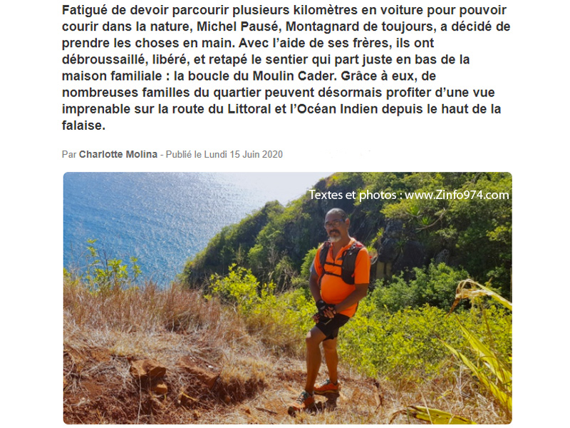 Michel Pausé est un passionné de course en montagne. Habitant à proximité du sentier, il a décidé de remettre en état ce parcours d'entraînement et même de créer un nouveau sentier qui évite ainsi d'emprunter des rues pour revenir au point de départ à partir de Moulin Cader. Aidé de ses frères, l'équipe a tronçonné, tondu, gratté, raclé, déblayé, débroussaillé, coupé et aménagé un circuit durant une semaine. La boucle présentée en 2015 a gagné ainsi une troisième étoile. Merci Michel, au nom de tous les randonneurs, pour cette belle initiative.
