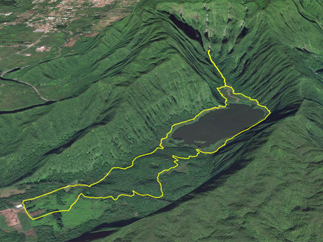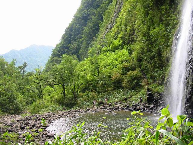 La randonnée débute à l'aire de pique-nique sous de grands eucalyptus à l'écorce épaisse puis sous les camphriers avant de retrouver les goyaviers sur une piste caillouteuse empruntée parfois par les cavaliers du club hippique. Plus loin, elle monte parfois fortement sous les bois de jamrosats (Photo 1). Une petite colline permet un beau panorama sur l'étang et les remparts qui l'entourent. Son escalade est courte et facile. On arrive assez rapidement en vue de l'étang (Photo 3) et on suit le très large sentier du Tour de Grand Etang en partant sur la droite (Photo 5). La marche est agréable, à l'ombre des arbres poussant près des berges, sur un sentier moussu et caillouteux. Il chemine longuement au plus près du rempart recouvert d'une importante forêt de bois de couleurs. Plus loin, on rencontre une zone marécageuse où coule la Ravine de l'Etang qui est presque totalement recouverte de fougères à travers lesquelles poussent des pieds de taros (sonje à la Réunion). On s'approche de la Ravine au fond couvert de galets qu'on traverse facilement à gué, d'autant que l'eau coulant des cascades pénètre sous terre 200 mètres en amont mais alimente tout de même l'étang. Un peu plus loin, un croisement de sentier permet de changer de direction. On part à droite vers les Cascades du Bras d'Annette et à gauche vers le parking en terminant la boucle autour de l'étendue d'eau. Le détour par les cascades est un peu plus difficile car il comporte des montées parfois raides mais très courtes. On commence par un sentier large bien pavé entre les goyaviers (Photo 6). Plus loin, il devient plus caillouteux et parfois boueux (Photo 7). Plus on s'approche du rempart et plus les cascades paraissent hautes et donnent l'impression de surgir d'une arête du rempart (Photo 8). En réalité, le cassé formant un cirque est la fin de la large plaine domaniale de Bébour, très arrosée et qui fournit toute l'eau nécessaires à ces cascades. Des marches peuvent être hautes parfois. Le spectacle est au bout du sentier après avoir monté une volée de marches régulières (Photo 9). On a devant les yeux deux des cascades qui tombent d'une hauteur importante (Photo 10). La descente est rapide jusqu'au premier bassin (Photo 11). La rivière est facile à traverser à gué pour rejoindre le deuxième bassin et sa haute chute qui éclabousse toute la zone (Photo 13). Le retour s'effectue par le même sentier après avoir profité du spectacle ou d'un casse croûte sous les embruns. Au croisement précédent, continuer tout droit en rive droite pour continuer le tour de l'étang. On rencontre un peu partout des muriers aux fruits rouges que les merles, nombreux dans la région, se chargent de disperser. Les fougères ont également recouvert les berges dans la partie marécageuse (Photo 15). Le large sentier fait un coude sur la droite puis continue sur les berges ou les herbes et les petites fougères se disputent le terrain. La boue y est souvent présente (Photo 17). Les cailloux reprennent le dessus pour un court moment. Sur la gauche, un petit sentier permet de rejoindre une langue de terre recouverte de fougères et de jamrosats pour des vues nouvelles sur l'étang. On reprend vers le point de départ, toujours dans les fougères et après une petite pente sur la droite, on retrouve le chemin pris à l'aller à moins qu'on choisisse de repartir par le sentier nord pour de nouveaux sous-bois de goyaviers. L'arrivée au parking se fait sous les eucalyptus géants dont l'écorce épaisse supporte quelques épiphytes (Photo 25). Tout est là pour pique-niquer si les tables ne sont pas prises d'assaut comme c'est souvent le cas en ce lieu très visité.
