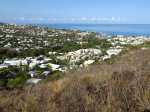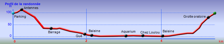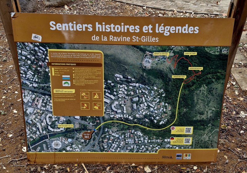 La randonnée débute à l'entrée du Théâtre de Plein Air de Saint-Gilles à partir de la D10. Il vaut mieux stationner le long de la route avant d'emprunter à pied la petite route menant au théâtre. On parvient à une barrière d'où il est facile d'évaluer le chemin à parcourir en repérant Saint-Gilles droit devant (Photo 1). Le panneau situé au départ donne des indications sur les barrages et systèmes de transport de l'eau au XIXème siècle (Photo 2). Avant d'entamer la descente par la large piste empierrée, repérer le sentier partant en direction de la colline. Il est étroit, peu entretenu, mais se suit sans difficulté jusqu'au sommet encombré de roches entourant les installations des antennes (Photo 3). En dominant l'océan de 125 m, on bénéficie depuis les rochers de belles vues sur la région, le théâtre, la Ravine Saint-Gilles ou les vergers (Photo 4). On remarque également le port entouré des habitations blanches de la ville (Photo 5). Rejoindre le point de départ. Il est possible de commencer la descente en allant repérer le kiosque pour le casse-croûte du retour, accessible aux handicapés (Photo 6). Rejoindre alors le circuit principal bordé au début d'une longue barrière en bois (Photo 7). Le chemin, très fréquenté, est large et propre. Il frôle une petite grotte occupée par un "Ti bondié" et se poursuit en descente légère sur un sol de plus en plus caillouteux (Photo 8). Le balisage, parfois un peu effacé, est représenté par des caméléons verts qui ont donné leur nom au sentier (Photo 9). Même tôt le matin, la chaleur peut déjà être importante. On profite de larges panoramas sur la vallée étroite de la Ravine Saint-Gilles (Photo 10). Puis le chemin empierré descend de plus en plus vite sur une forte pente. On le trouve un peu raide au retour mais il est heureusement assez court (Photo 11). On parvient assez vite à de grosses touffes de bambou après avoir franchi une petite passerelle. Avant de poursuivre, on peut partir sur la gauche vers un ancien sentier botanique abandonné. Repérer les quelques panneaux encore en place et continuer ou non vers l'amont de la rivière en suivant un sentier en rive droite. Il passe à un moment dans un ancien canal de transport de l'eau sur un sol très caillouteux. On est très proche de la ravine et de son agréable bruit d'eau courante (Photo 12). Marcher ainsi jusqu'au petit barrage de recueil de l'eau à l'époque où de nombreuses usines sucrières avaient besoin du précieux liquide (Photo 13). Faire demi-tour jusqu'au jardin Bottard en retrouvant les bambous. Il reste des manguiers un peu partout. Des panneaux donnent l'occasion de souffler un peu en lisant les explications ou un poème (Photo 14). Continuer en rejoignant le premier gué constitué de grosses roches pouvant être glissantes après la pluie (Photo 15). On laisse donc le jardin Bottard et ses manguiers poussant à travers les roches pour marcher vers Saint-Gilles (Photo 16). Le petit cours d'eau devient de plus en plus paisible dans les cultures (Photo 17). Les taros et grandes herbes occupent également les berges (Photo 18). On parvient bientôt à un nouveau gué, plus glissant, qui se franchit en quelques secondes (Photo 19). La fin du sentier est toujours aussi facile entre d'anciennes plantations et jardins cachés derrière les haies abritant de vrais caméléons (Photo 20). L'eau stagne presque dans la ravine sur le sol de plus en plus plat (Photo 21). Le pont enjambant la Rue du Général de Gaulle indique la fin proche de la portion sur sentier (Photo 23). Profiter des dernières fleurs rencontrées tout au long du parcours (Photo 24). Les derniers mètres sont bordés de quelques panneaux (Photo 25) avant de remonter vers une aire de repos comportant quelques bancs. Au centre, une grosse baleine bigarrée accueille chaque jour des dizaines d'enfants grimpant sur son dos (Photo 26). Il est possible à cet endroit de faire demi-tour et revenir en direction du théâtre. Si l'on souhaite visiter Saint-Gilles, se diriger vers le port par des allées bordant la berge ou par les routes pour atteindre les ilots que l'on rejoint par des ponts et des escaliers (Photo 27). A la saison, les bateaux chargés de touristes ou de plongeurs partent en direction des baleines ou dauphins nageant au large. Si la chaleur n'est pas trop forte, flâner dans les rues de la petite ville balnéaire et rejoindre par exemple la case Chez Loulou pour y déguster une de leurs spécialités (Photo 28). Il est possible de poursuivre la visite  vers la Vierge à une centaine de mètres de là. Le retour emprunte le même itinéraire, un peu plus difficile en raison de la pente sur les marches en pierre.