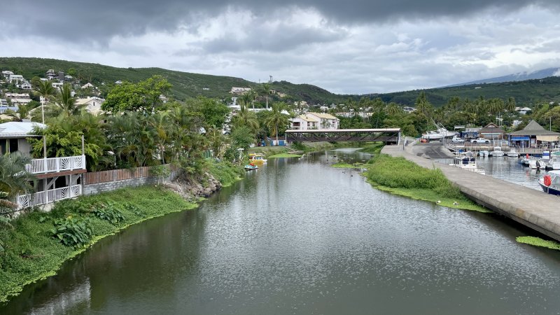 Lorsqu'on emploie le mot "randonnée" à Saint-Gilles, on pense aussitôt aux bassins et cascades le long de la Ravine Saint-Gilles, interdits au public, mais parmi les plus visités de l'île. Cette courte sortie familiale peut aisément se combiner avec une montée aux cascades ou une traversée de la savane du côté de Villèle. N'est présentée sur cette carte que la partie basse de la rivière qui comporte quelques petites chutes vers le beau Verger Bottard, des cressonnières et des fleurs de tous côtés (Photo 24). Des panneaux installés aux croisements détaillent des points d'histoire de la région de Saint-Gilles. On peut même y lire un poème de Leconte de Lisle au dos de l'une d'entre elles. Le balisage original est constitué de caméléons verts (appelés endormis à La Réunion) peints sur les roches. Il faut donc mettre beaucoup de bonne volonté pour s'égarer. Comme partout, le parcours botanique créé le long du ruisseau a vraiment mal vieilli. Un sentier discret suit l'ancien canal et la canalisation métallique jusqu'au captage. Ce n'est pas de l'aventure que d'y aller jeter un coup d'œil à moins de poursuivre en direction du Bassin des Cormorans. Le sentier longeant la Ravine Saint-Gilles est large et facile jusqu'à la baleine bariolée située au début de l'itinéraire côté ville. La visite du port de Saint-Gilles ainsi qu'une partie de la ville qui l'entoure ne rajoutera que quelques dizaines de minutes pour s'approcher des nombreux restaurants ou pour y déguster une glace.